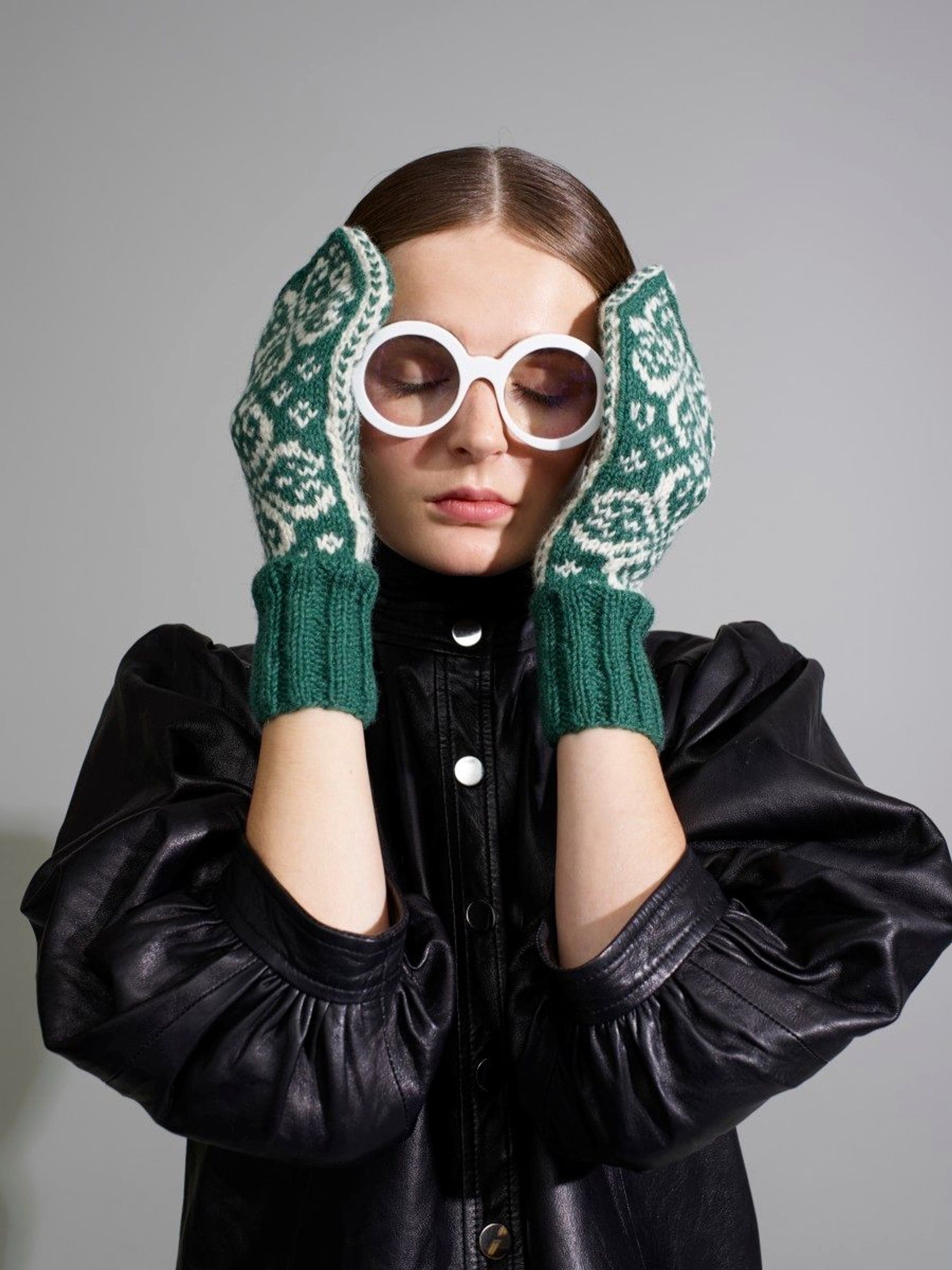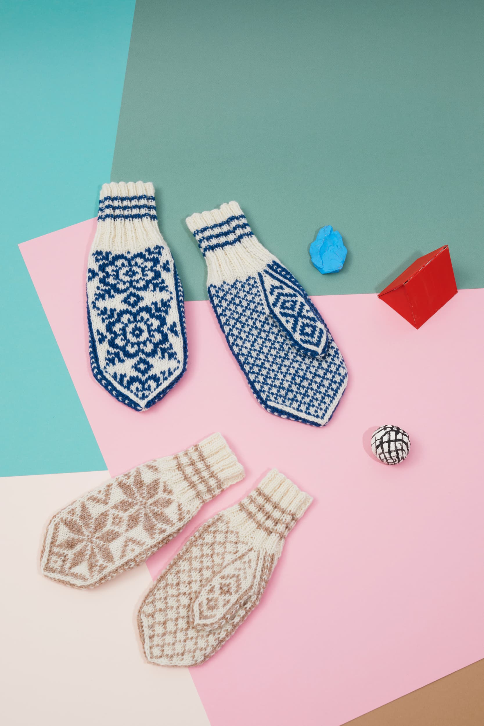 I kolleksjonen har vi tre ulike design, som alle kan strikkes til både barn dame og herre. I tillegg har vi designet en gøy dobbelvott til å holde hender i.