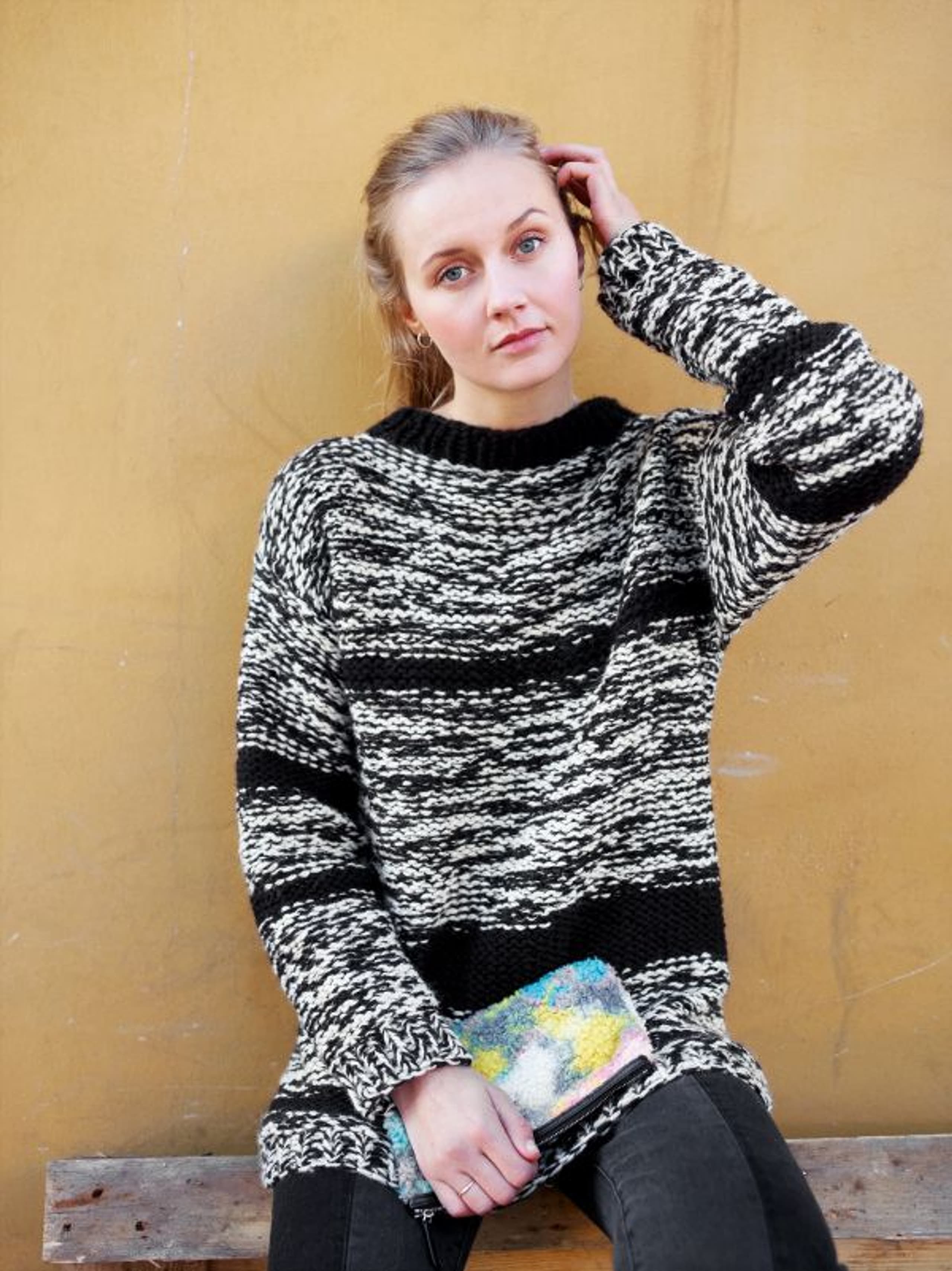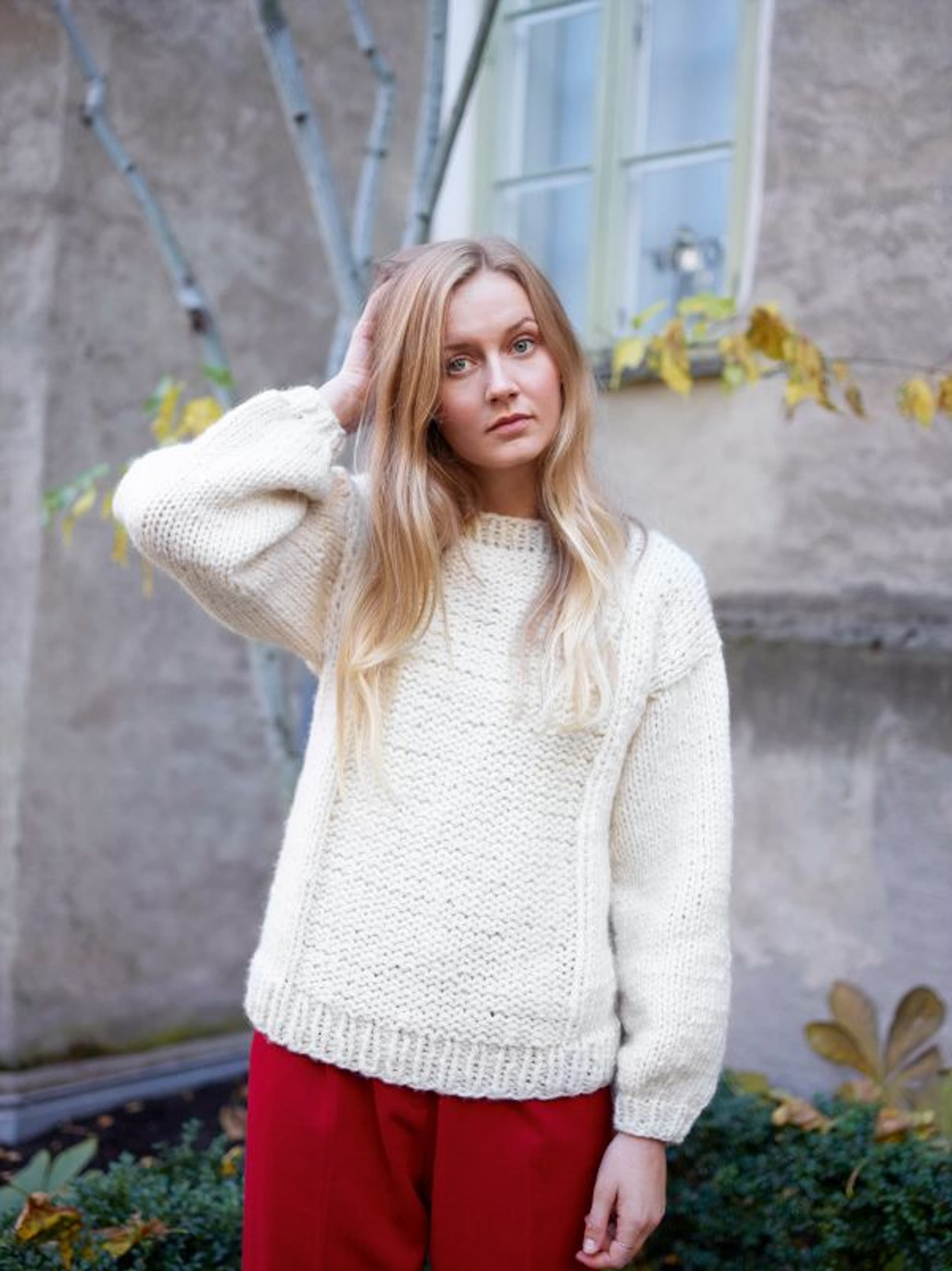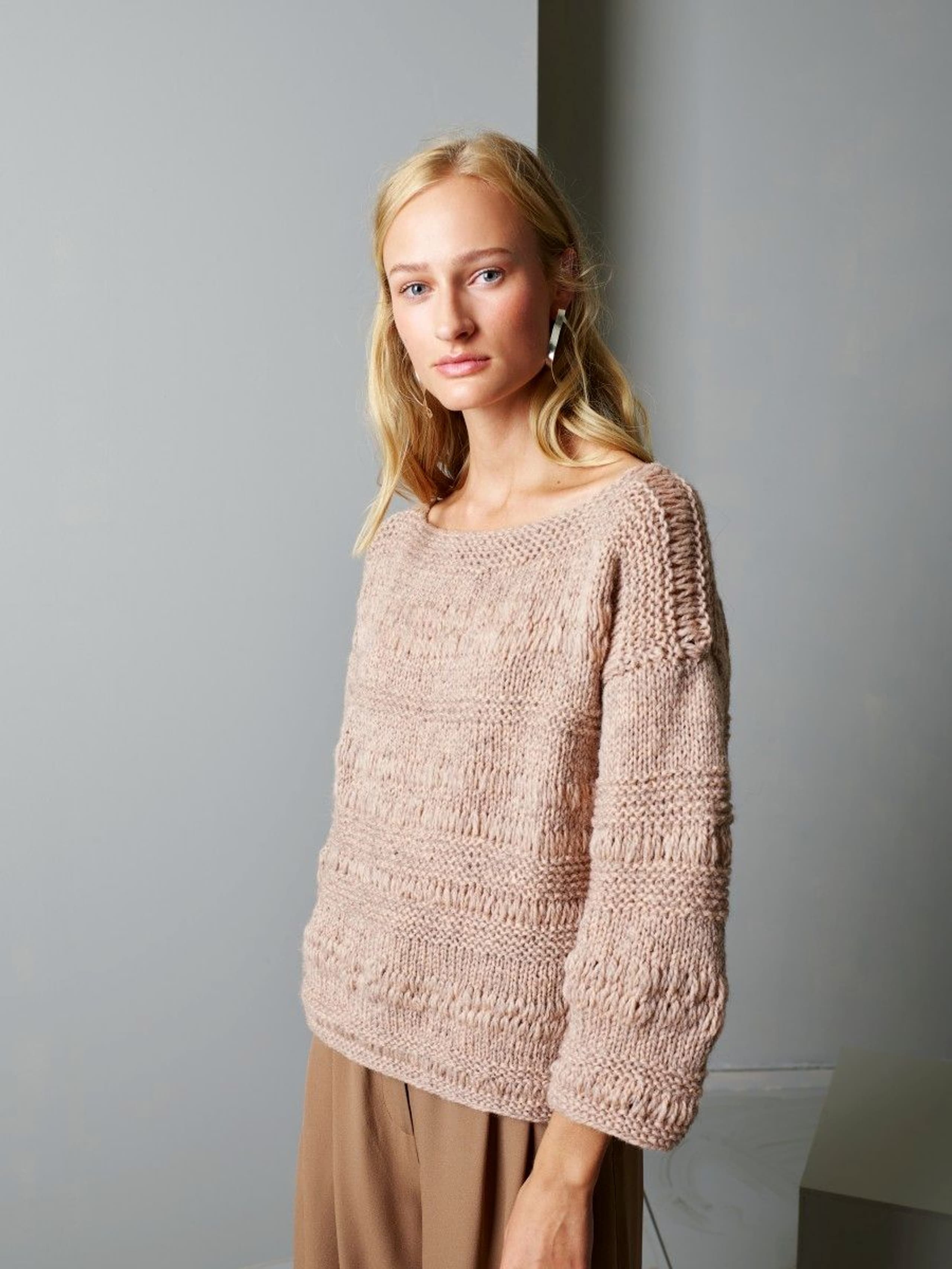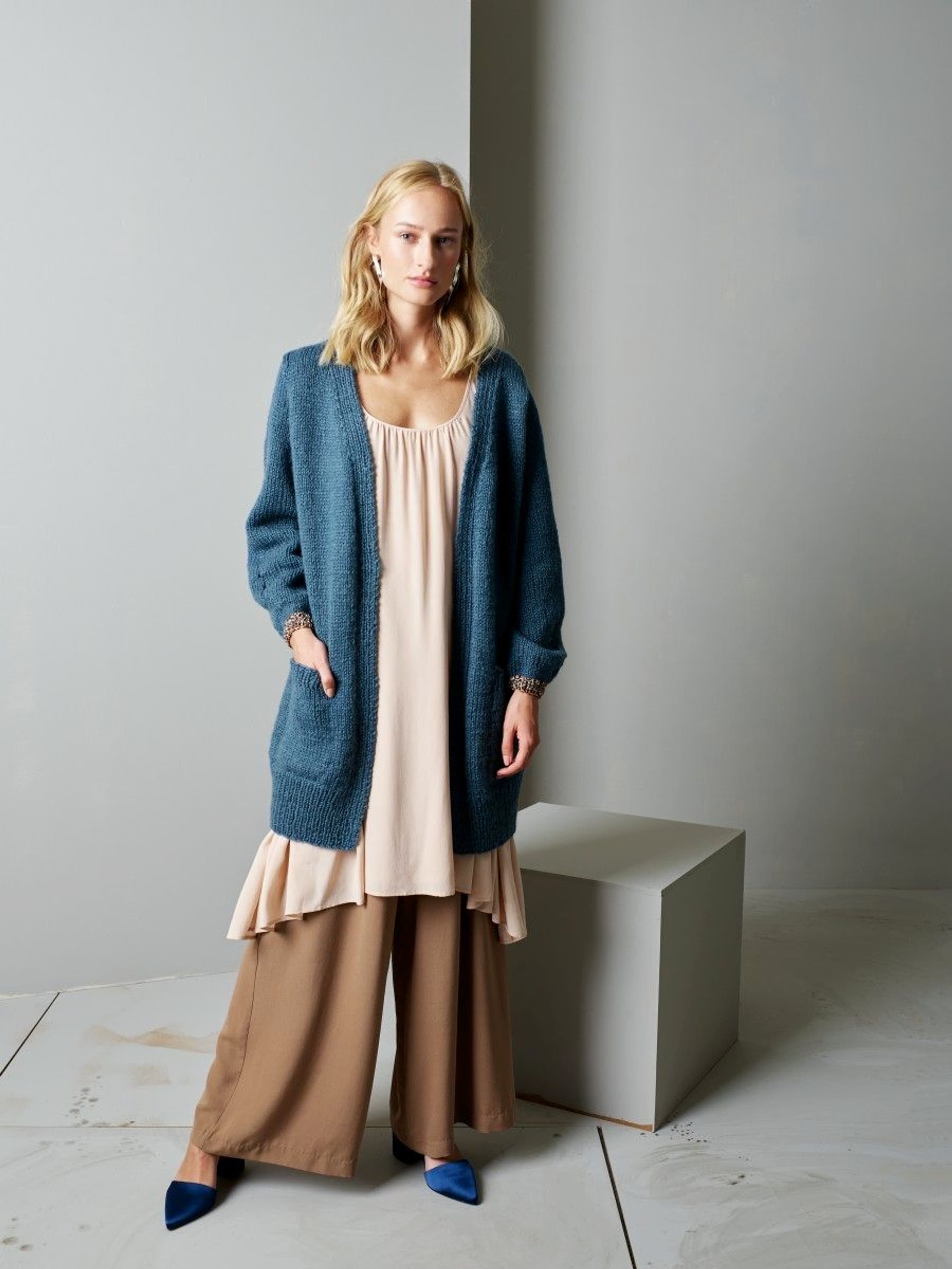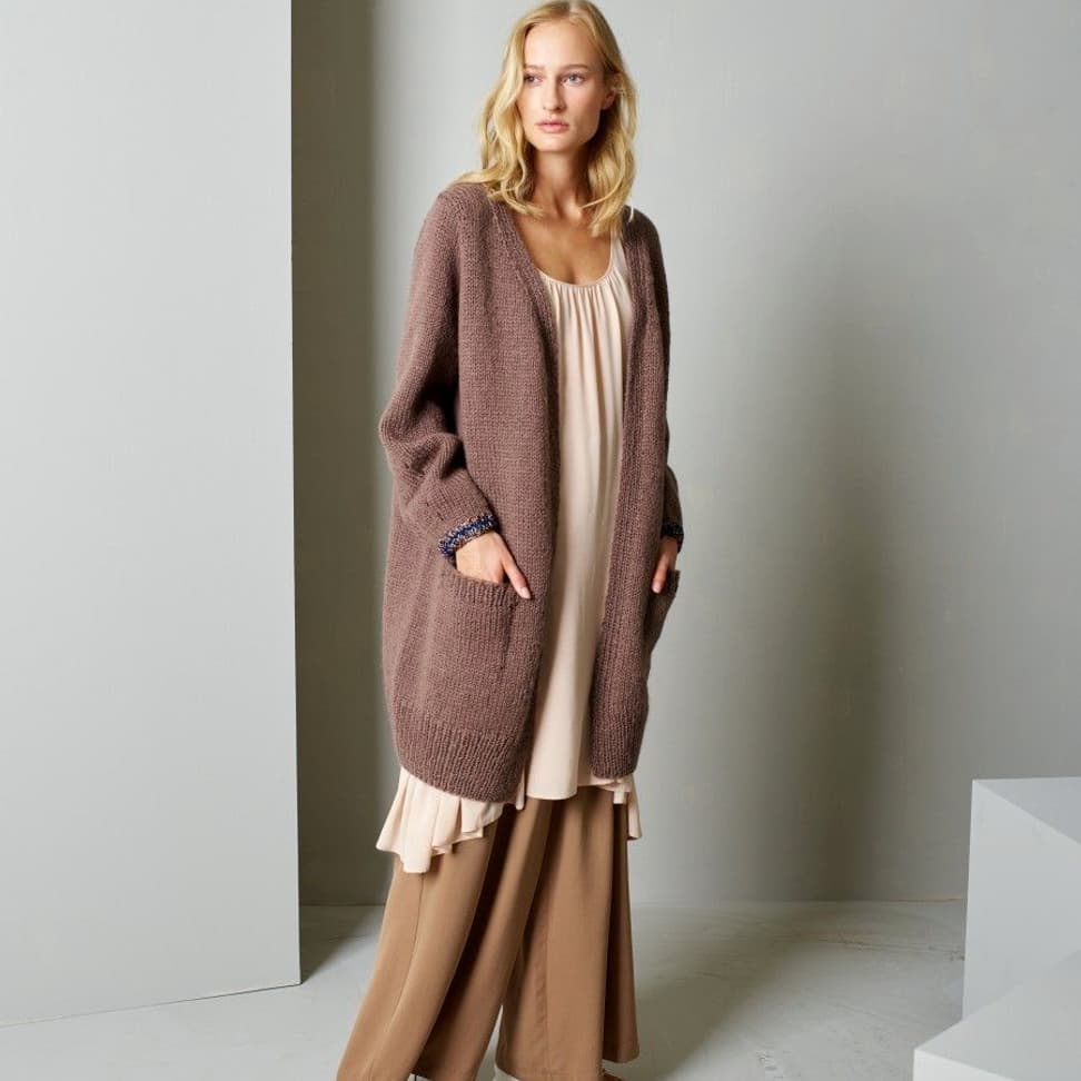 Garnkombinasjoner og forslag til strikkefasthet (p): Husk å strikke prøvelapp. Vams + Plum: 12 m = 10 cm (7) Vams + Alpaca Silk: 12 m = 10 cm (7) Garnalternativer: Puno Finull og Alpakka Lin Alpakka Lin x2
