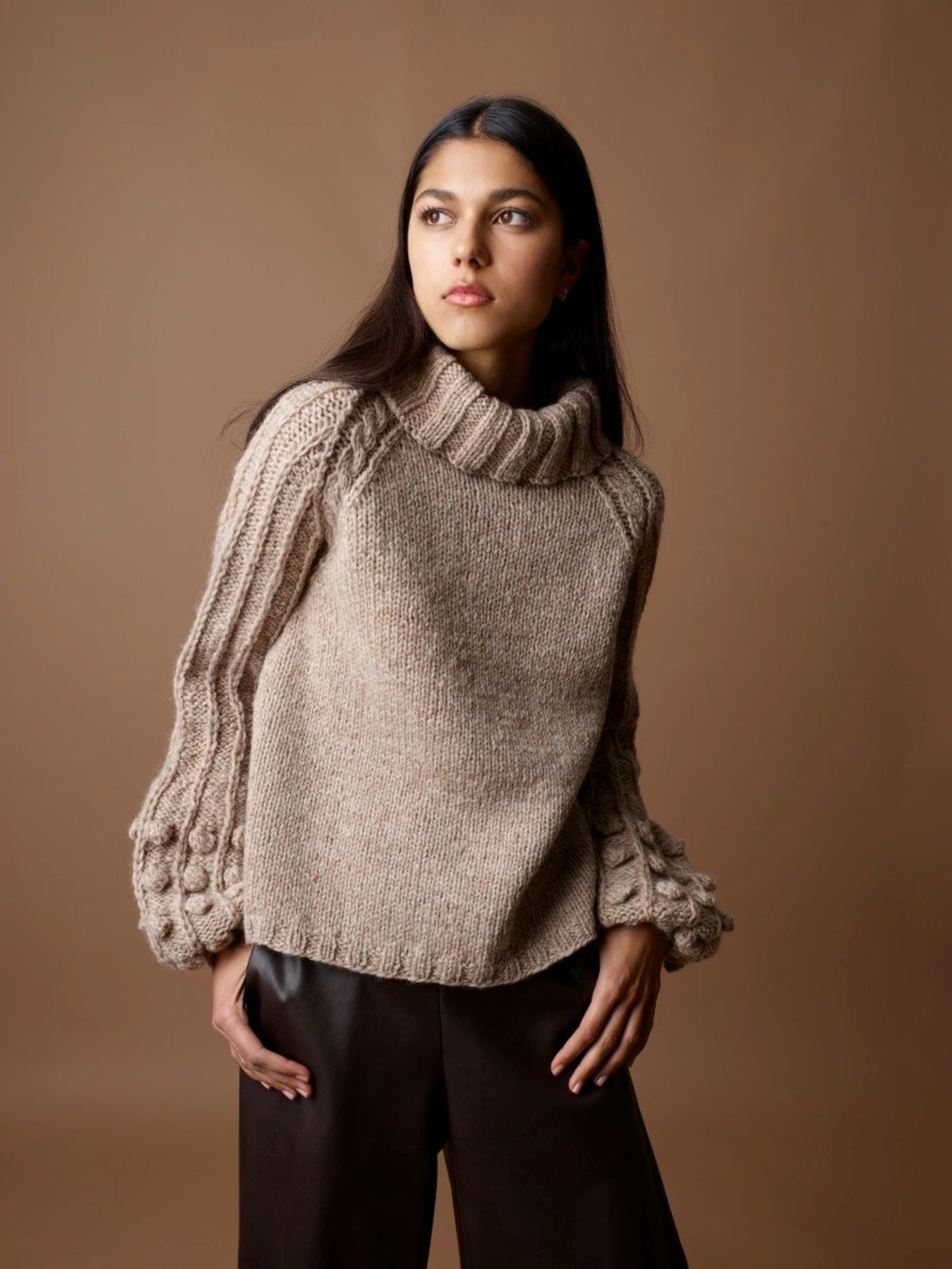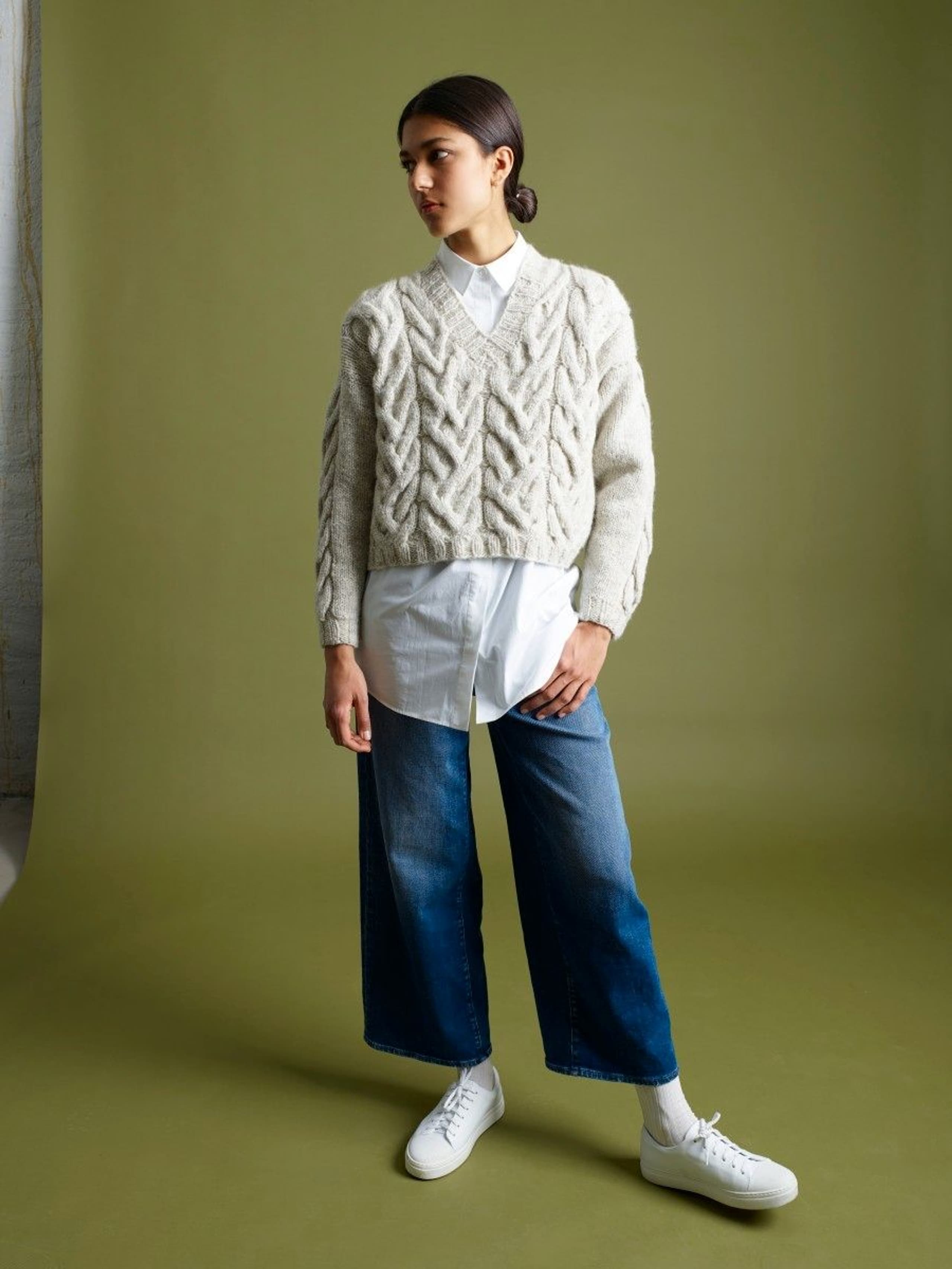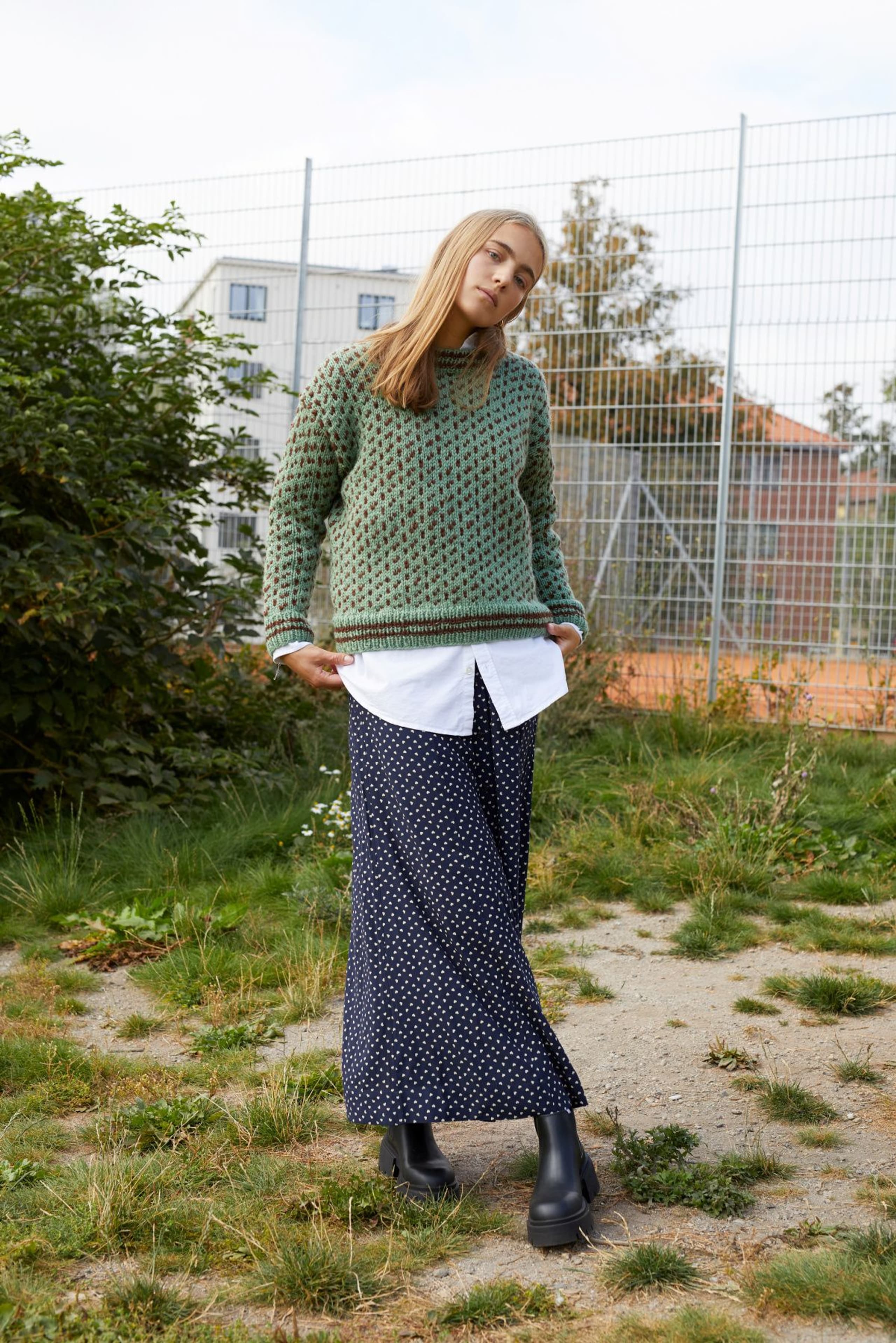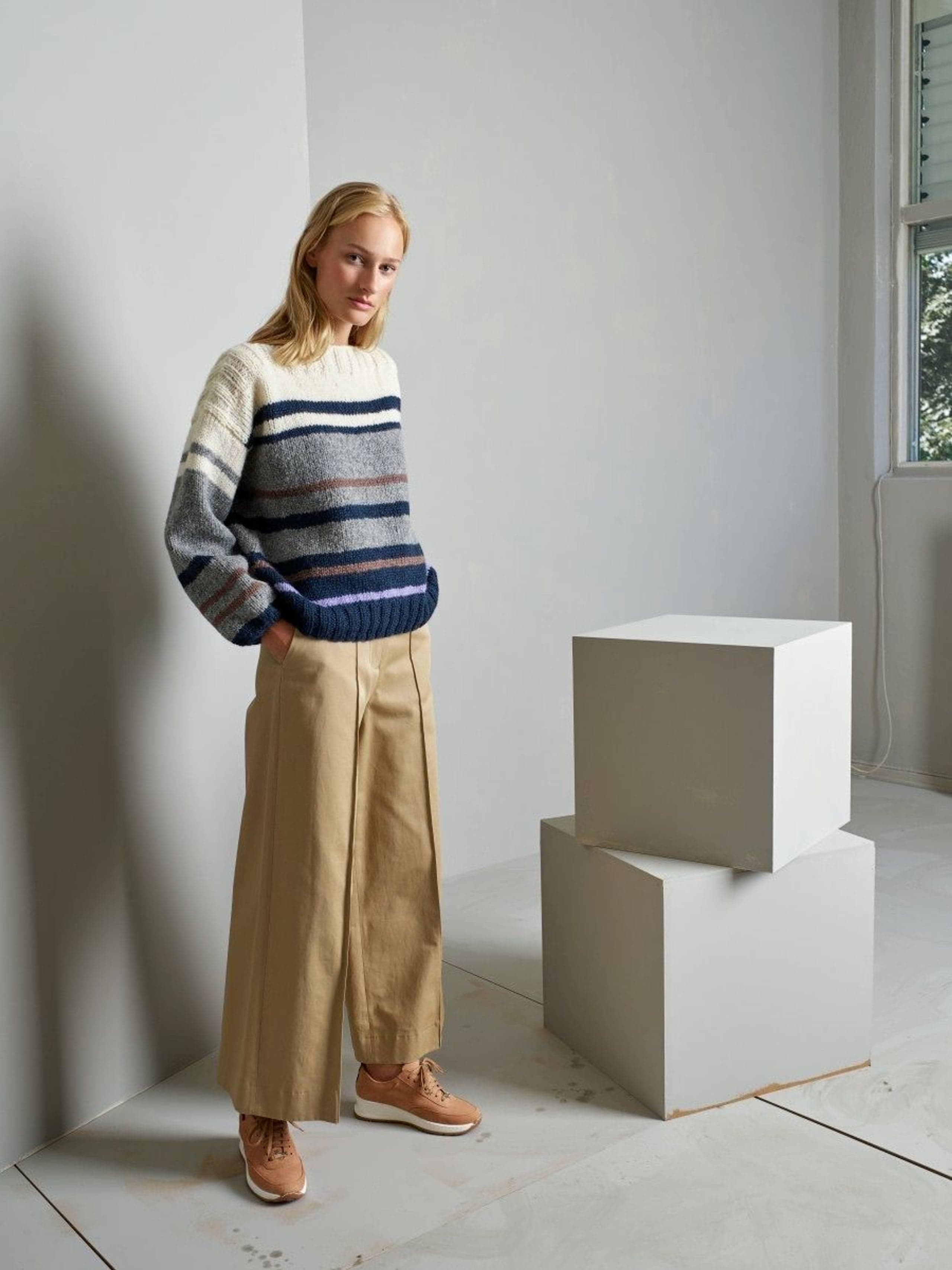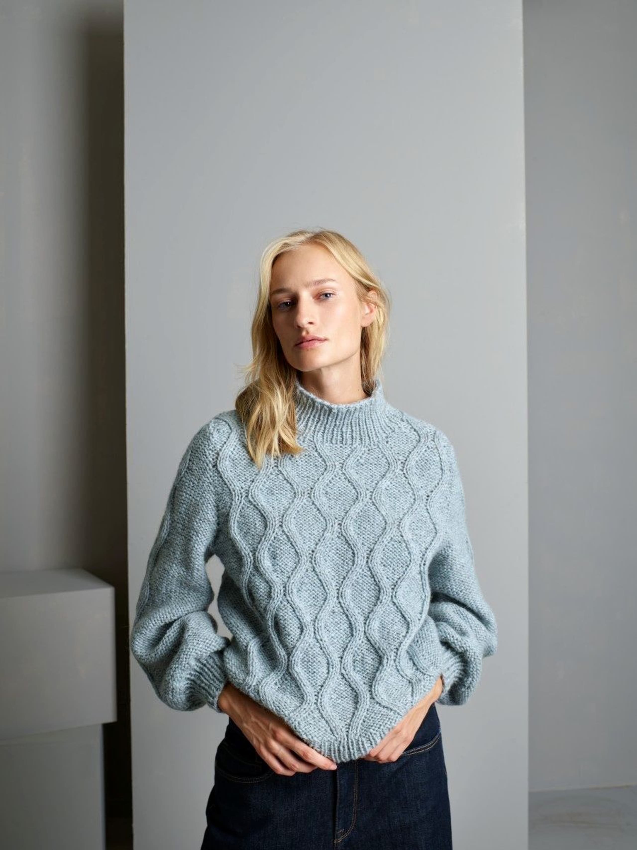 Garnkombinasjoner og forslag til strikkefasthet (p): Husk å strikke prøvelapp. Vams + Plum: 12 m = 10 cm (7) Vams + Alpaca Silk: 12 m = 10 cm (7) Garnalternativer: Puno Finull og Alpakka Lin Alpakka Lin x2