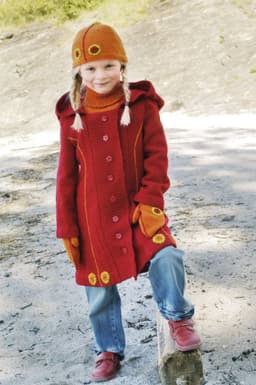 Jakke med rysjer, skjerf, lue med og uten rysjekant