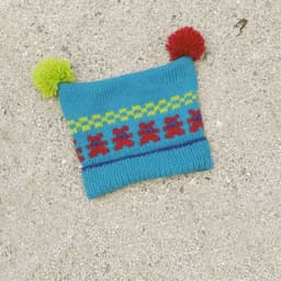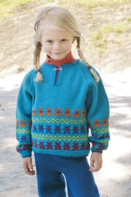 Genser, stripet sjal, lue med rosett og pulsvarmere