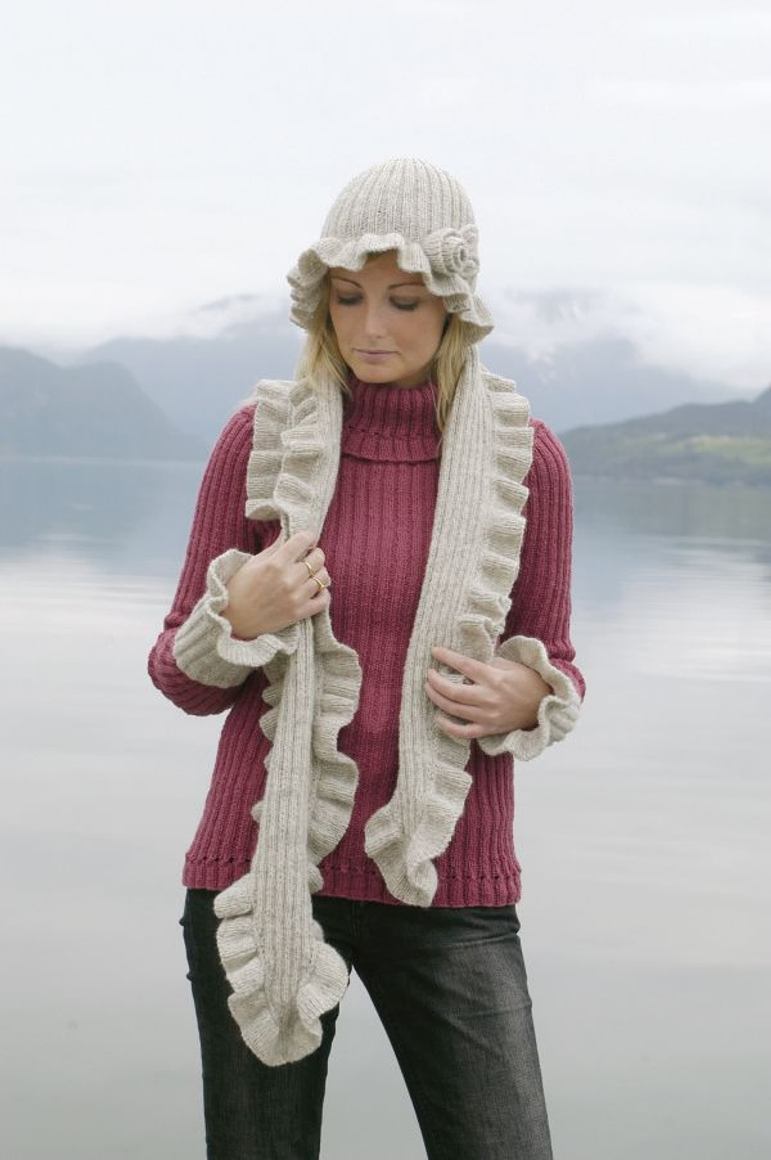 Jakke med rysjer, skjerf, lue med og uten rysjekant