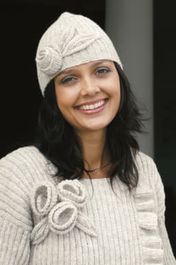 Genser, stripet sjal, lue med rosett og pulsvarmere