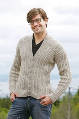 Jakke, gensere og topp med fletter og striper, lue og votter