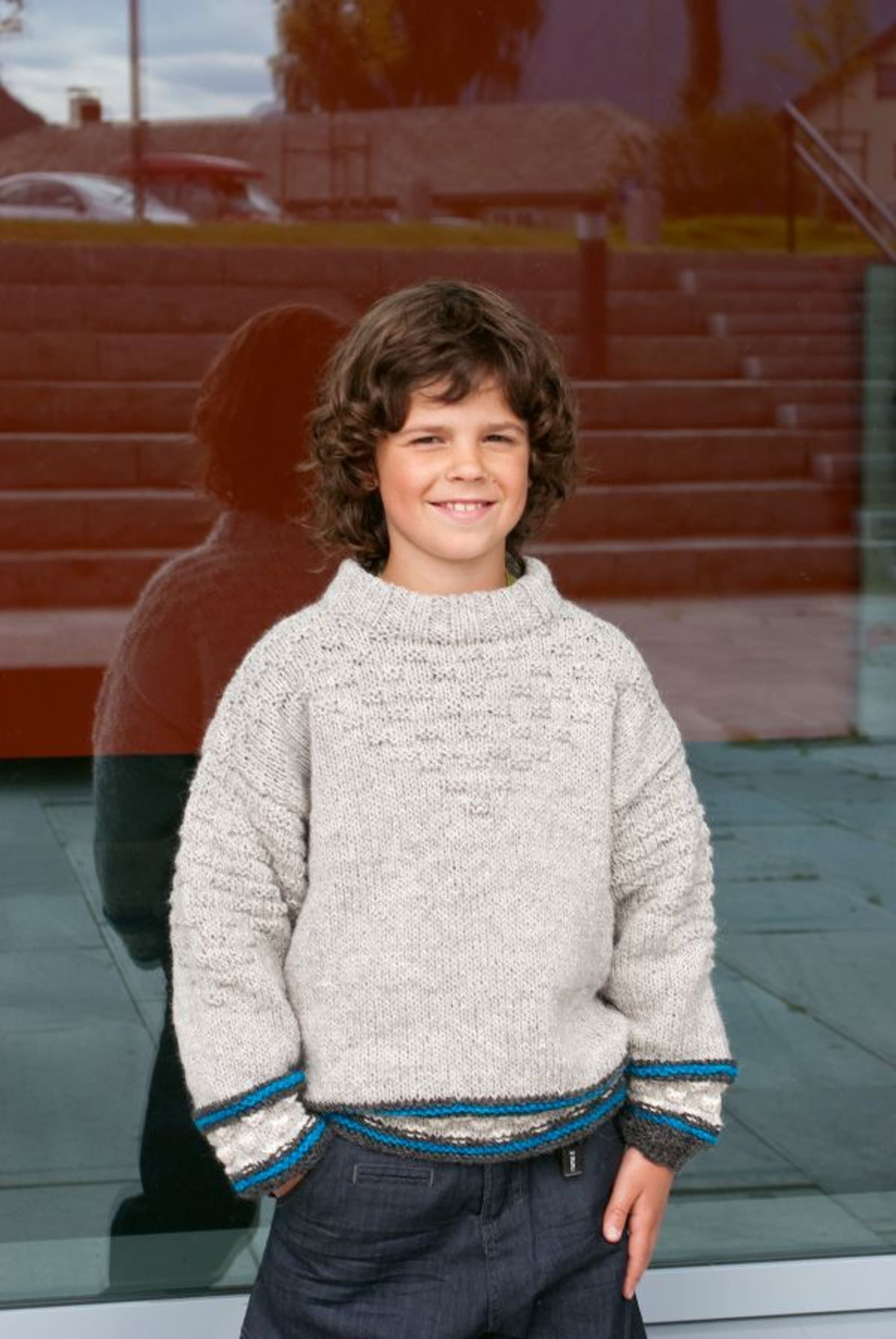 Jakke, genser, lue og votter med fletter og striper