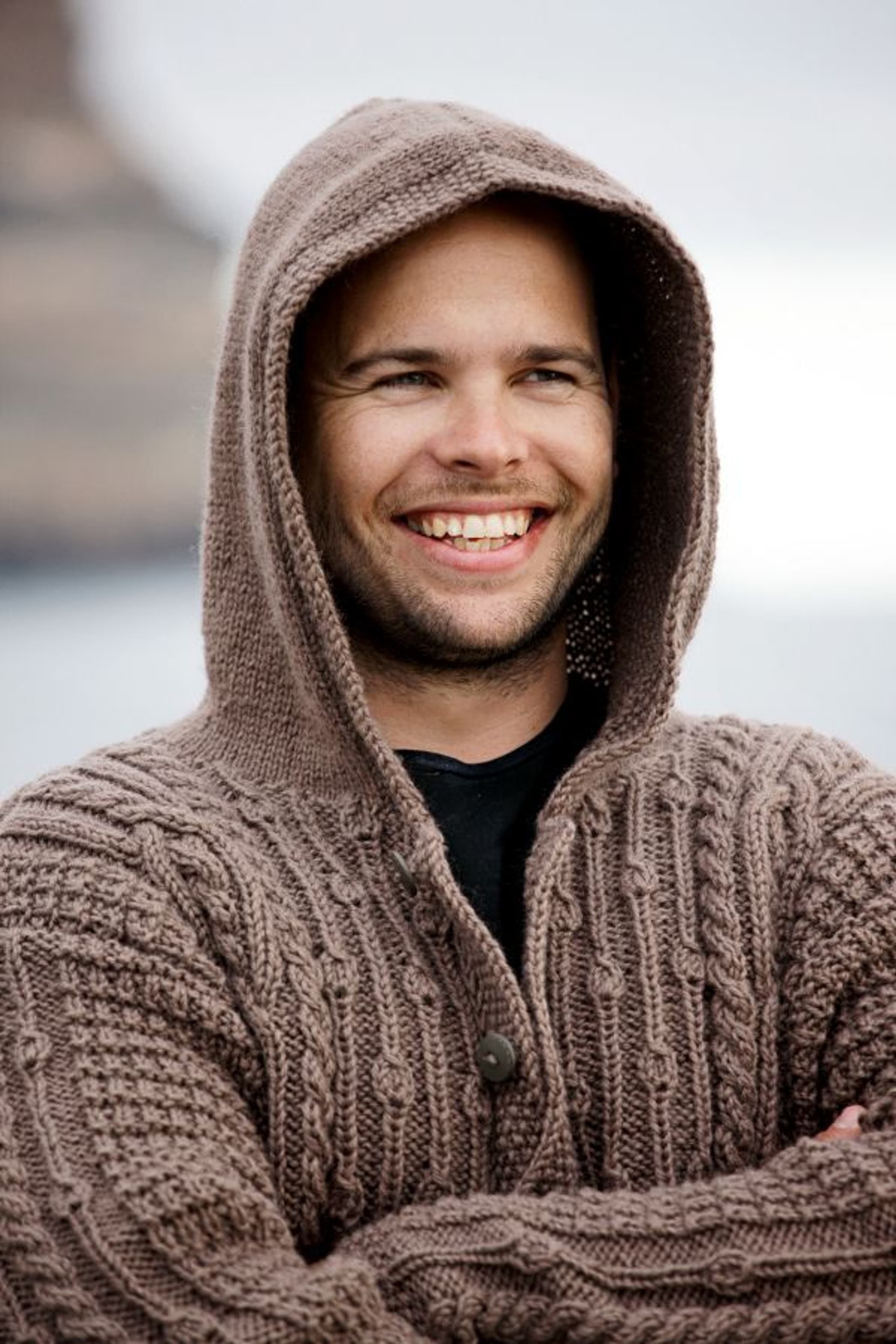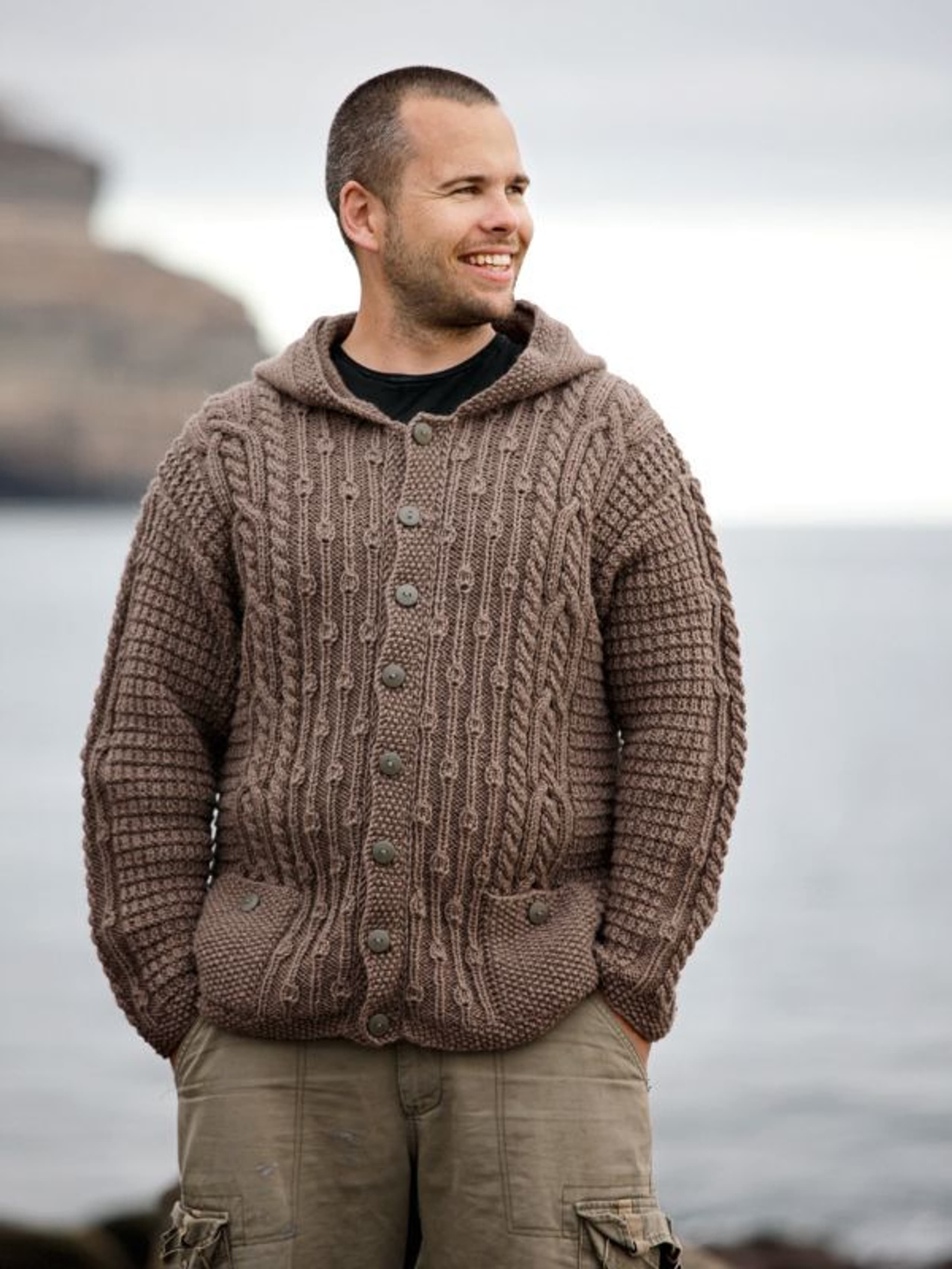 Herrejakke med strukturstrikk og fletter, med hette eller halskant