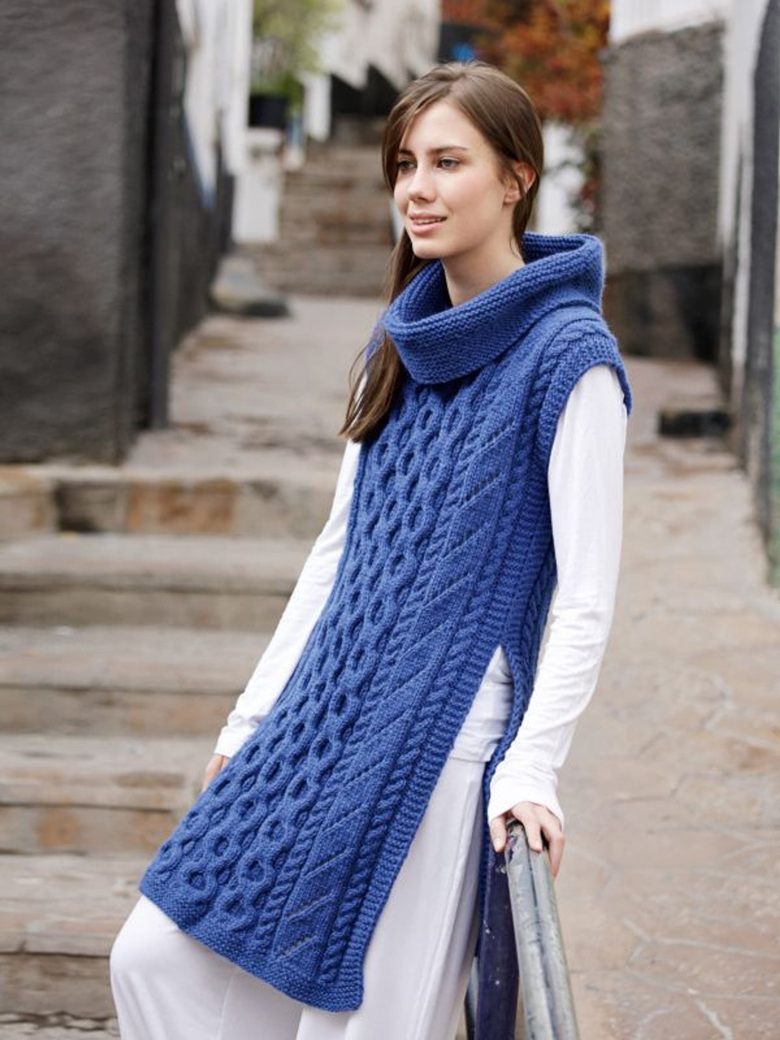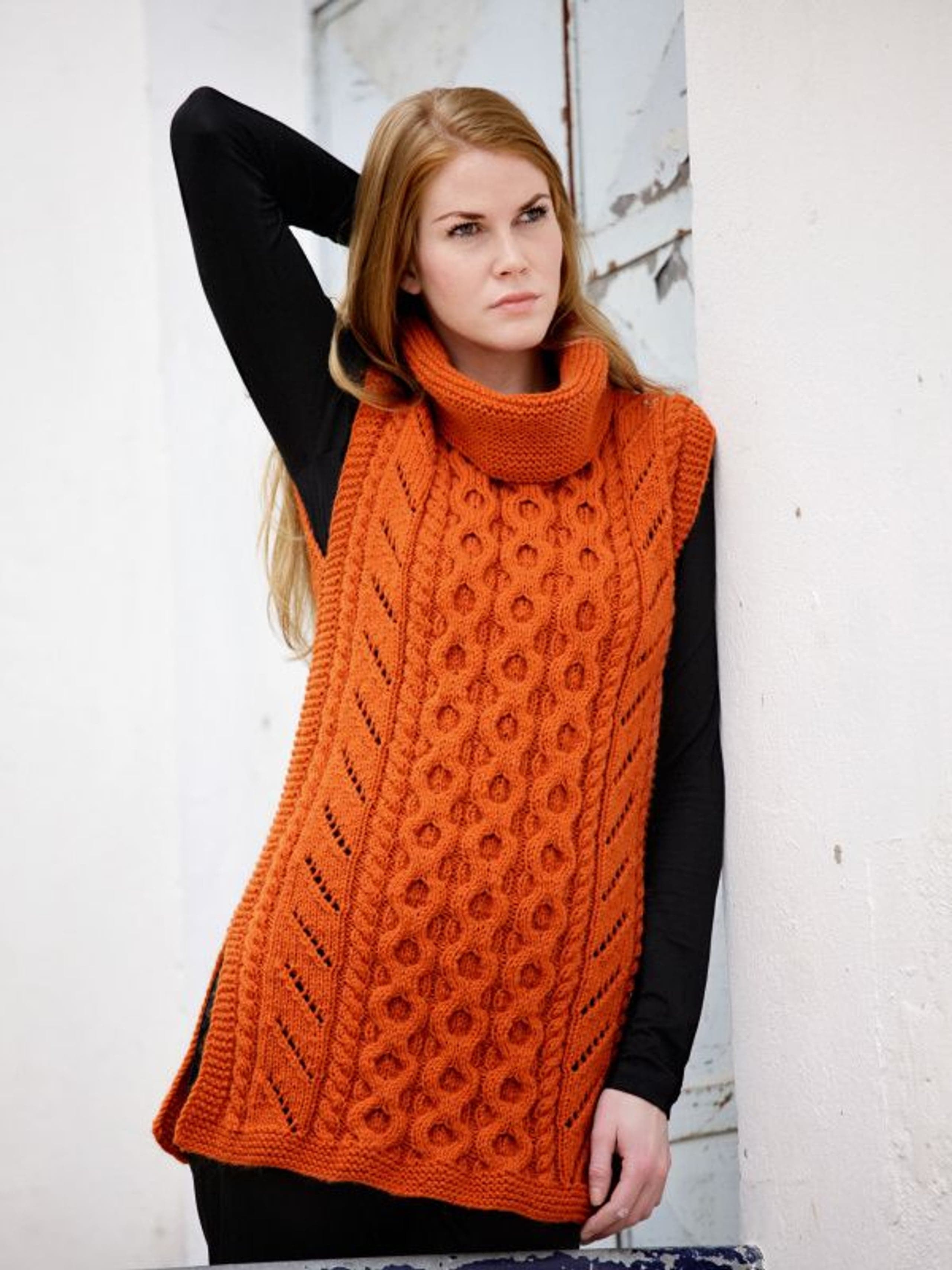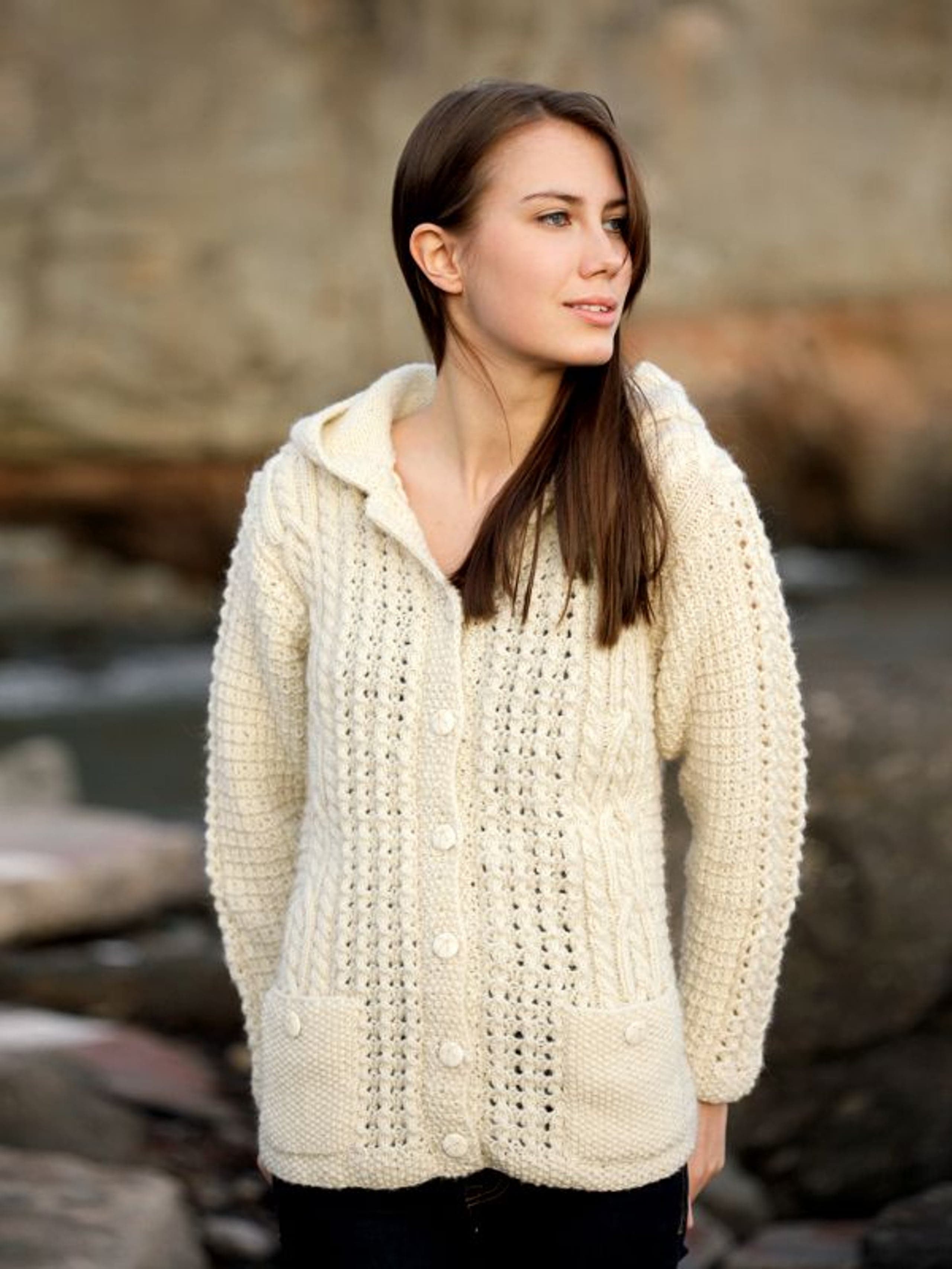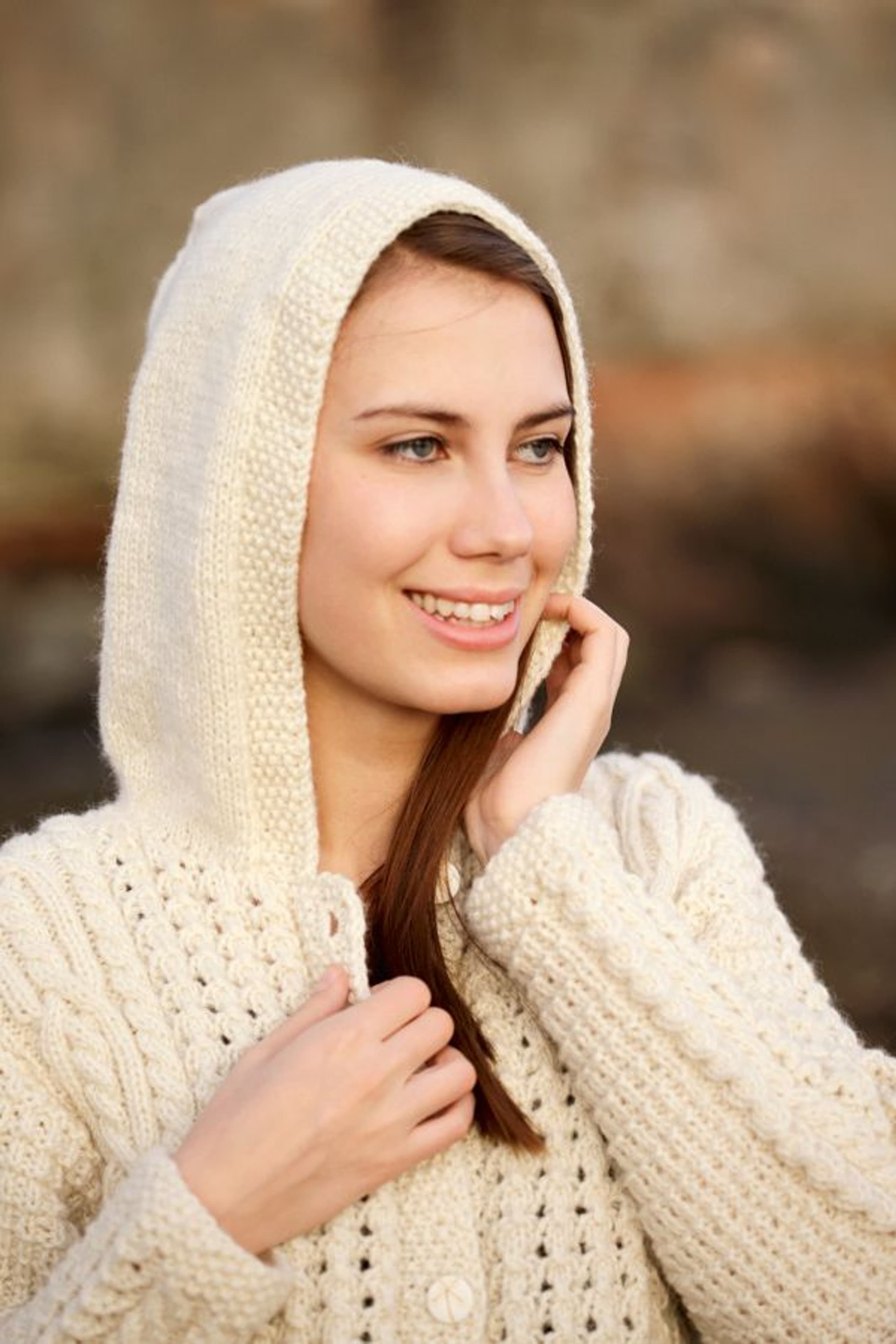 Damejakke med strukturstrikk og fletter, med hette eller halskant