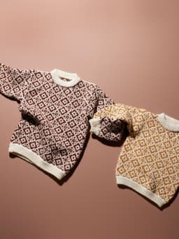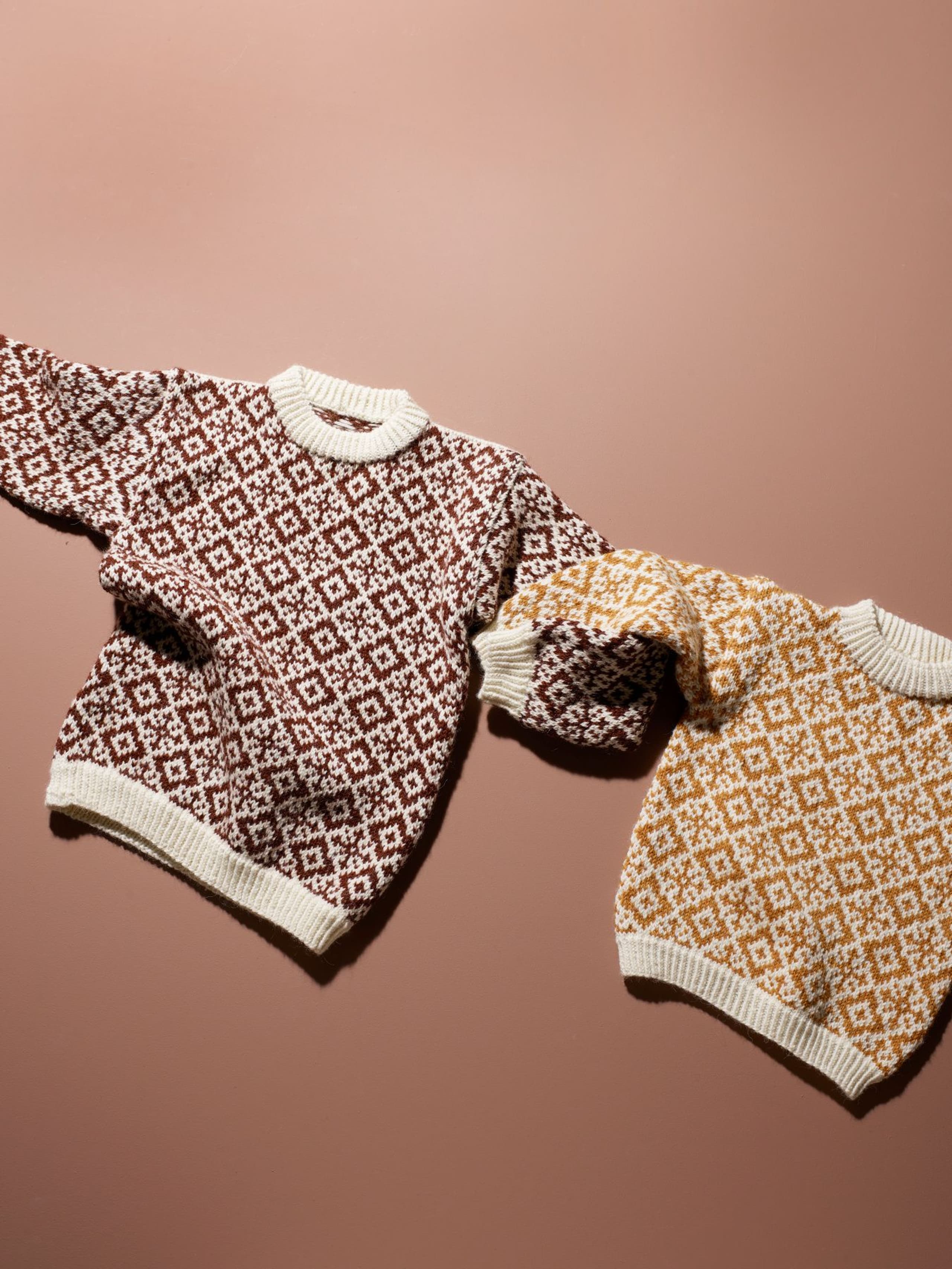 Multegenseren er en helmønstret genser med isydde ermer. Genseren er strikket rundt og klipt opp til ermer og utringning.