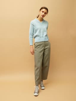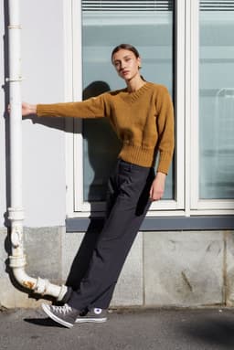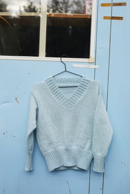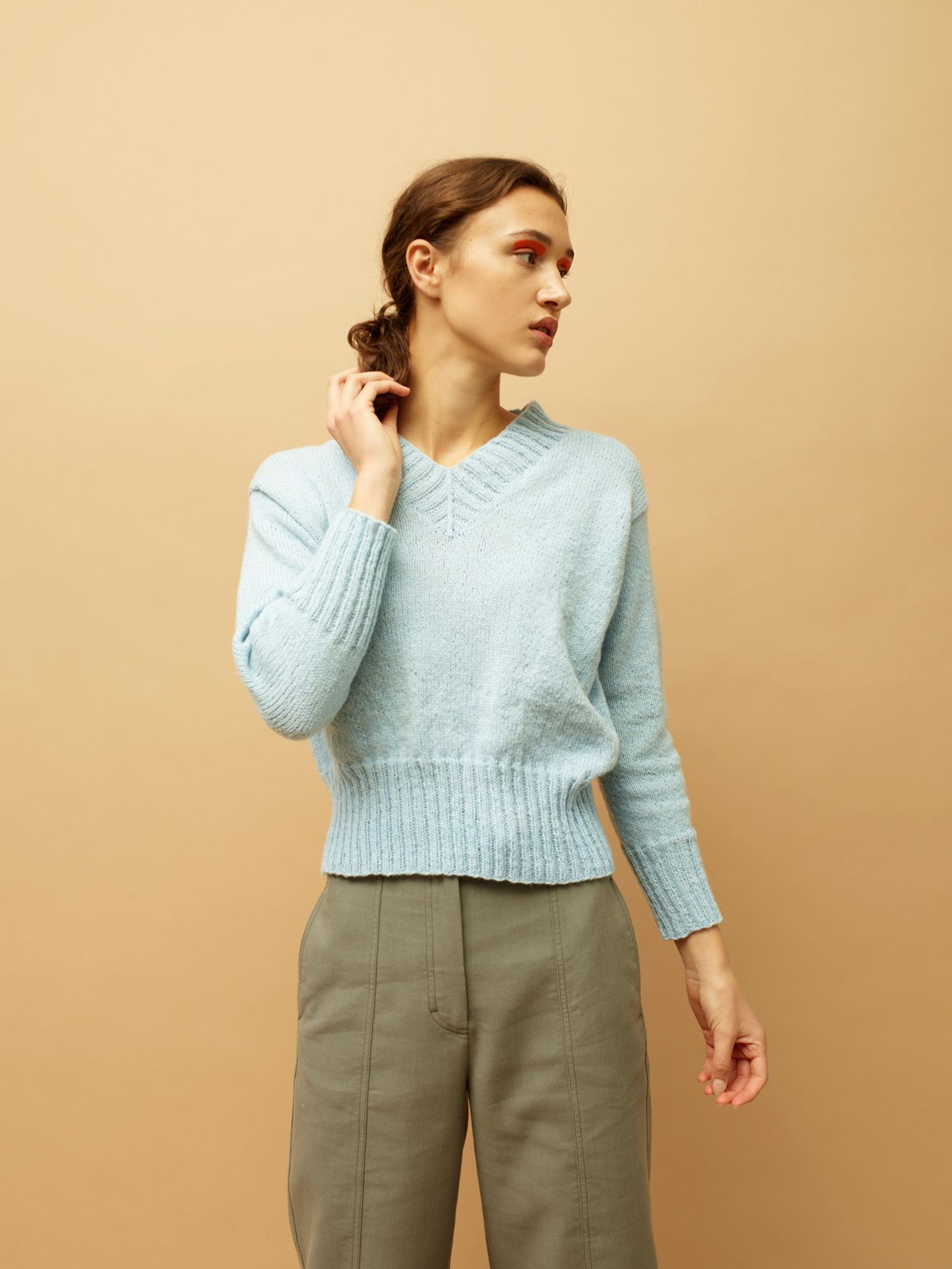 Den fine v-halsgenseren er en enkel og trendy genser med v-hals og brede ribbekanter. Genseren strikkes nedenfra og opp og har isydde ermer. Genseren har en kort passform. Ønsker du en lengre passform er det enkelt å strikke bolen litt lengre før du feller til ermehull. Pass i så fall på å beregne litt ekstra garn.