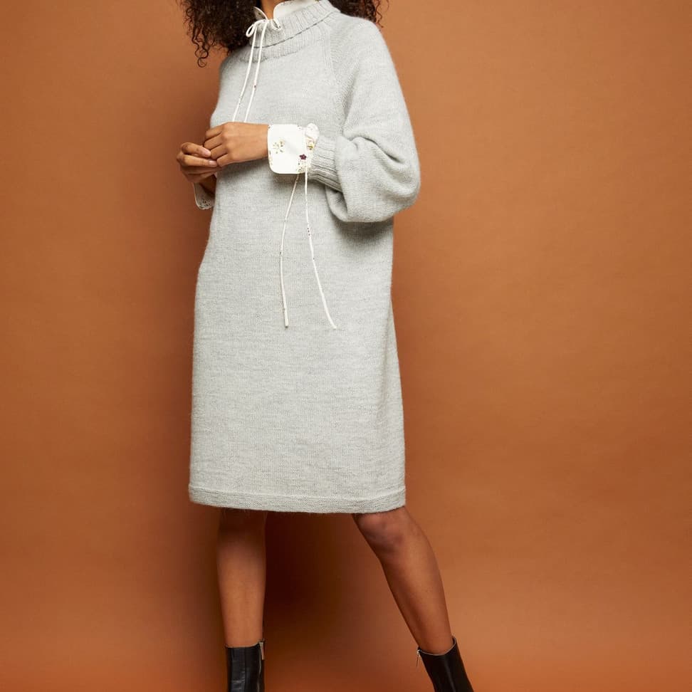 Myha er en helt enkelt kjole strikket nedenfra og opp. Den er glattstrikket med raglanfelling og er avsluttet med en høy ribbestrikket hals. Bevegelsesvidden er tenkt ca 17 cm.
