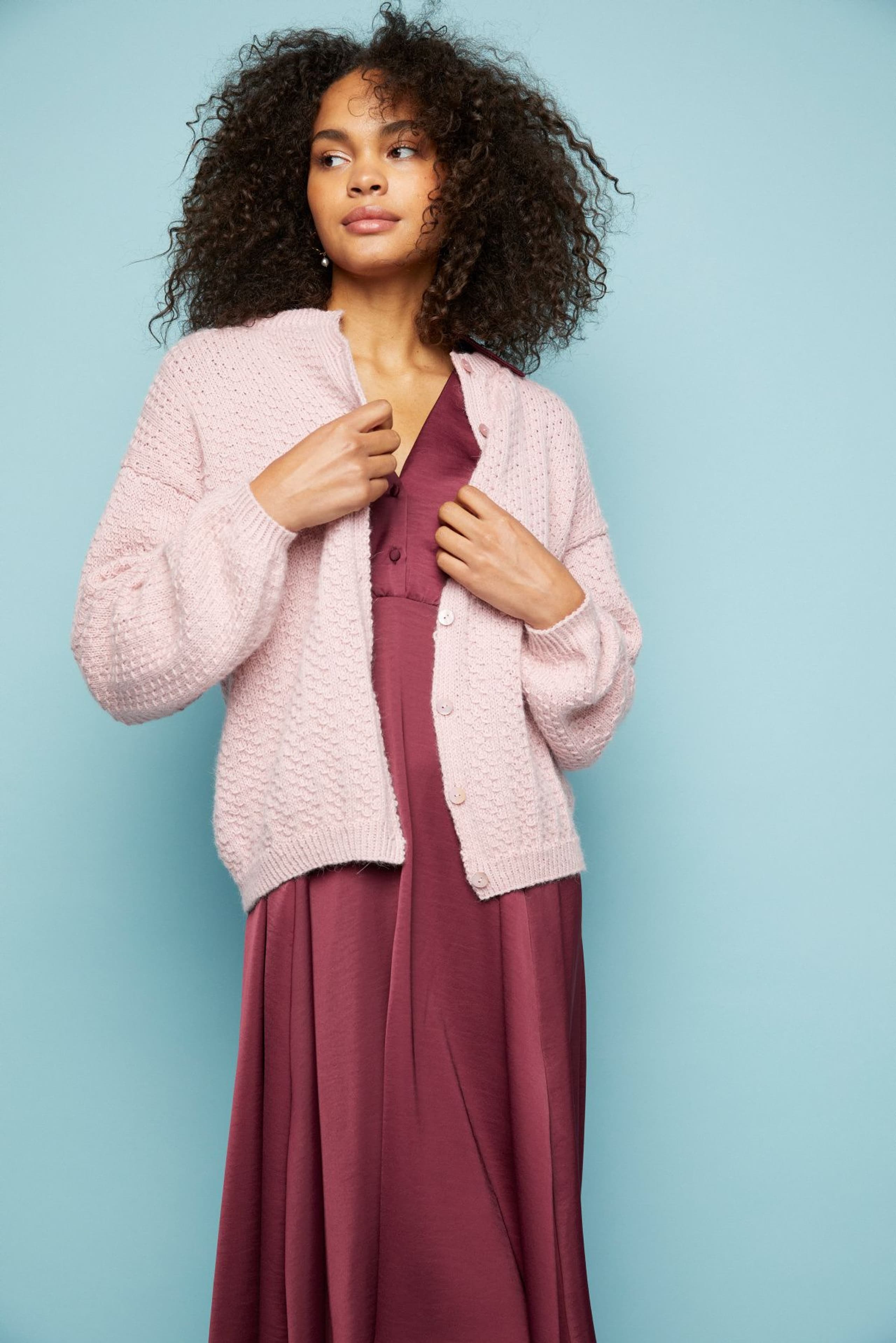Noemiejakken har isydde ermer og en nett struktur. Jakken er strikket fram og tilbake. Bevegelsesvidde på ca 5 cm.