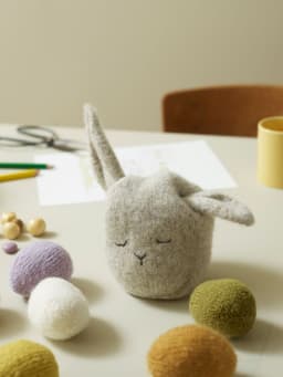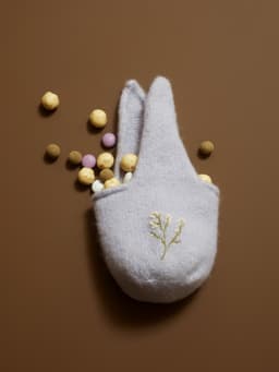 Hareposen strikkes på tykke pinner før den toves. Bruk den som gave til en venn eller som påskeegg til barna. Gjem påskegodt eller noe annet spennende inni og knyt sammen ørene. Bruk den som den er, eller broder den for å gi den det lille ekstra! Vi har laget to varianter – en med hareansikt og en med dekorative blomster.