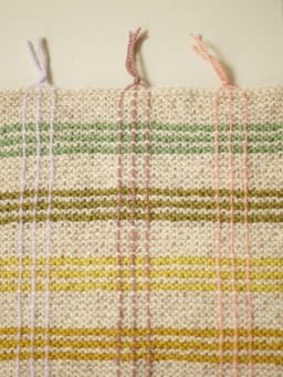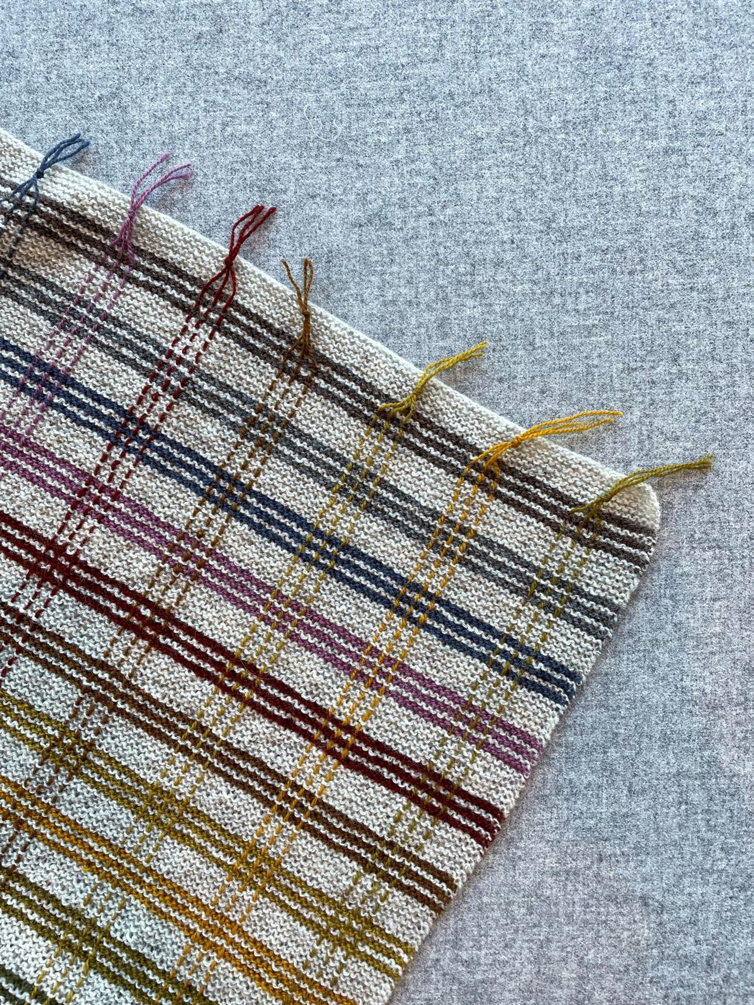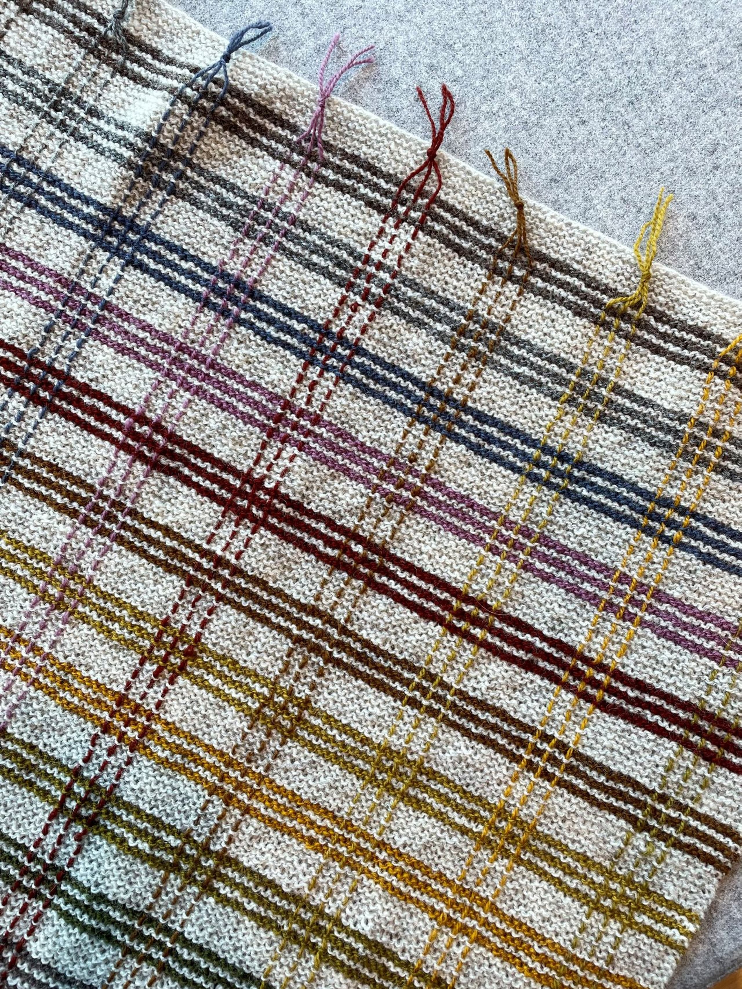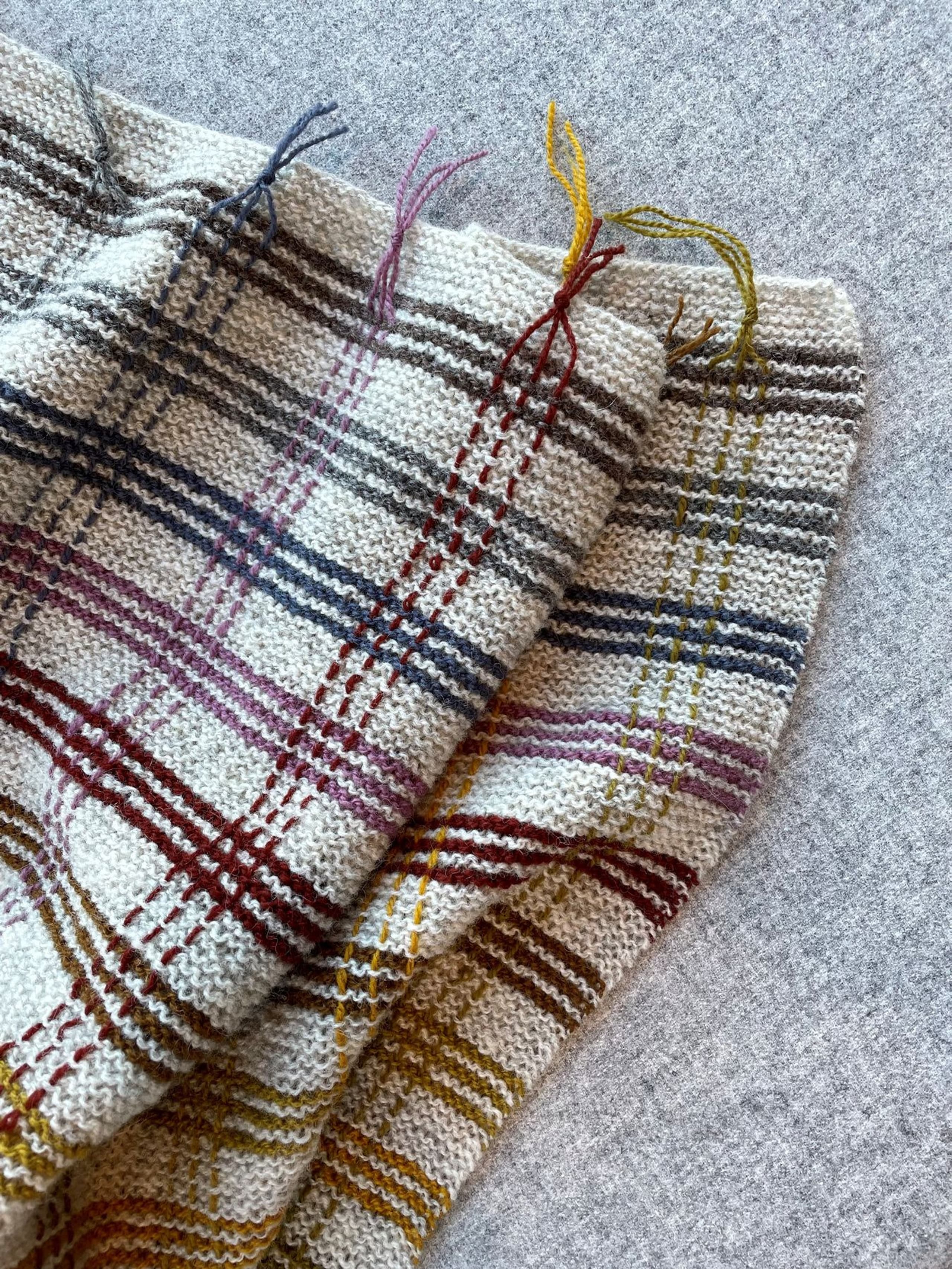 Pleddet er rillestrikket. Én hovedfarge brytes med fargerike striper. Etter pleddet er ferdig strikket, sys det inn loddrette i striper for å danne rutemønsteret. Alternativ 1 holder en vårlig palett. Alternativ 2 har et mer høstlig preg.