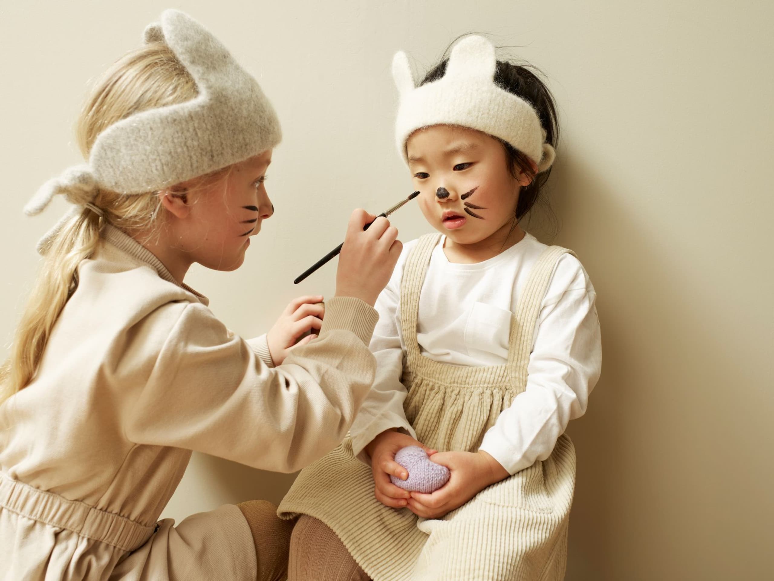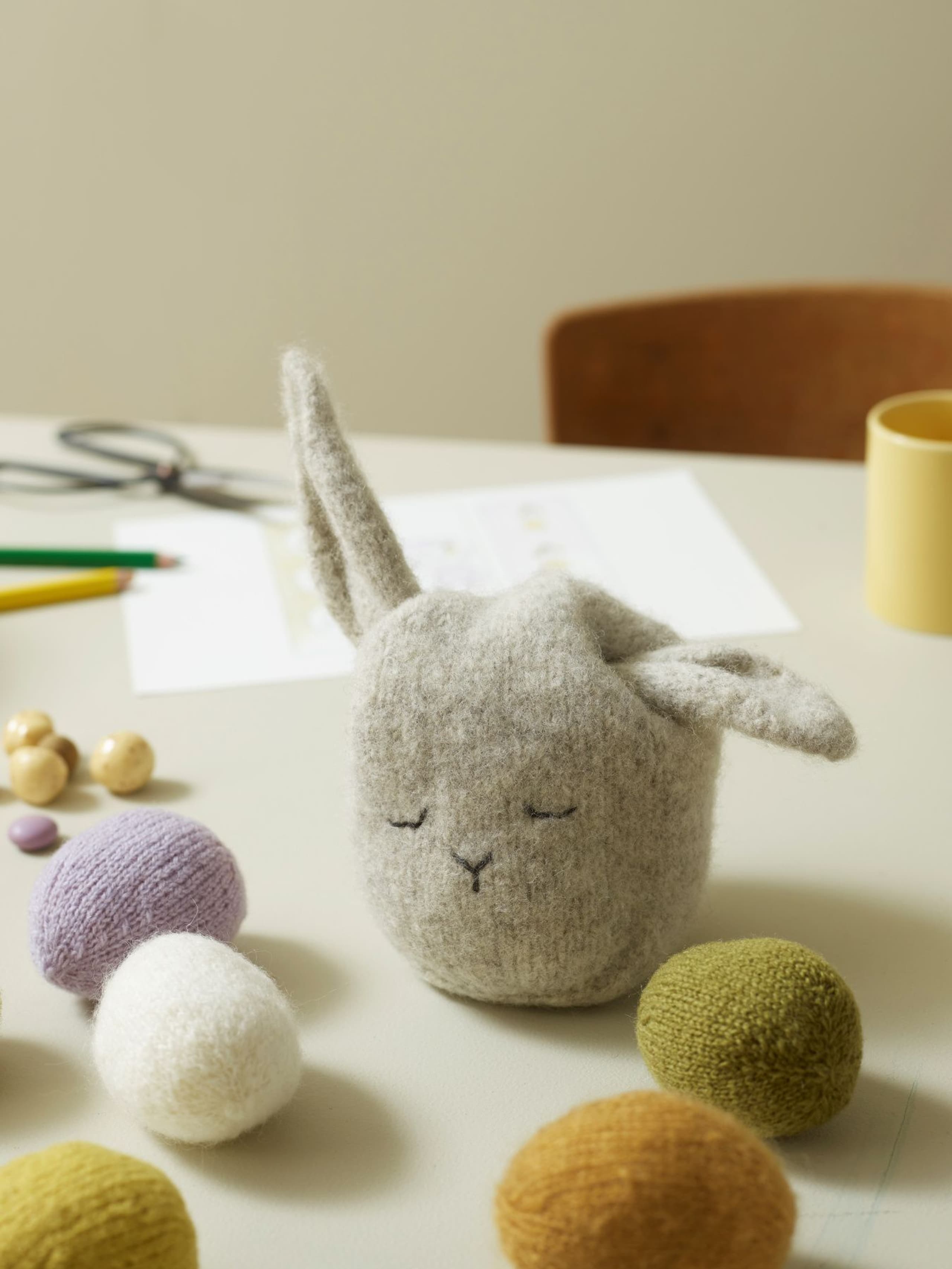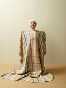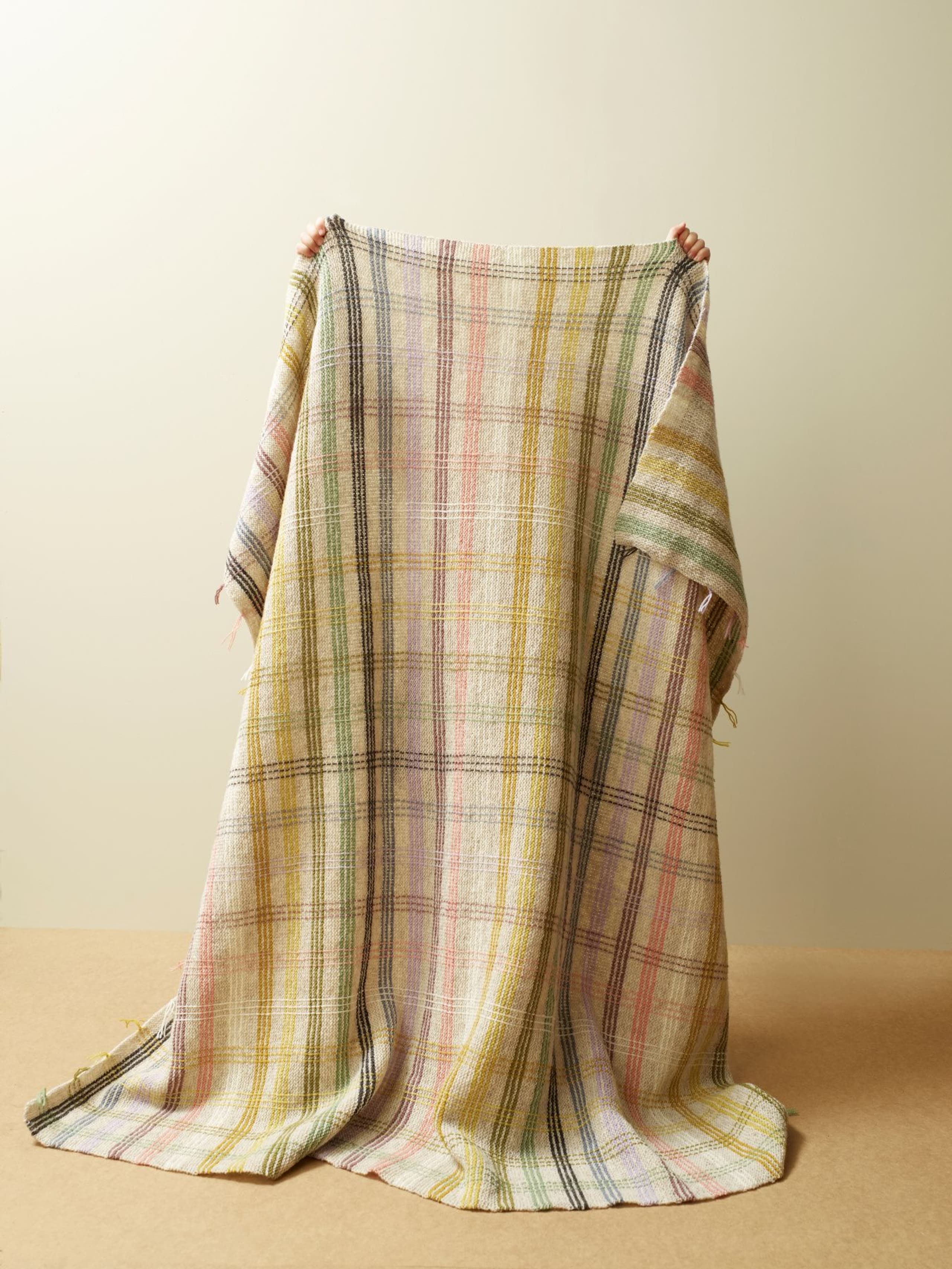 Pleddet er rillestrikket. Én hovedfarge brytes med fargerike striper. Etter pleddet er ferdig strikket, sys det inn loddrette i striper for å danne rutemønsteret. Alternativ 1 holder en vårlig palett. Alternativ 2 har et mer høstlig preg.