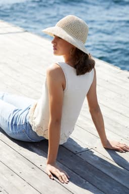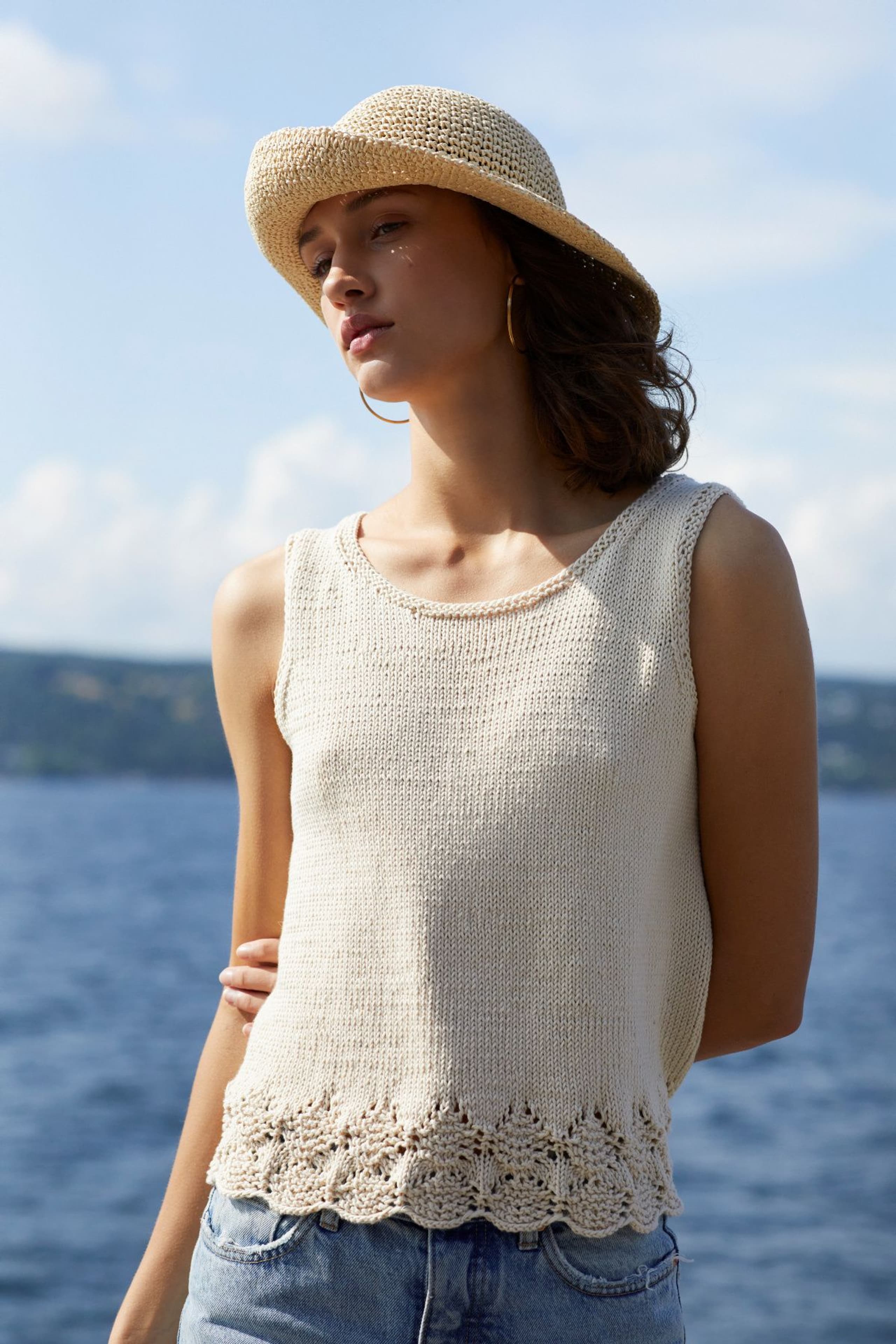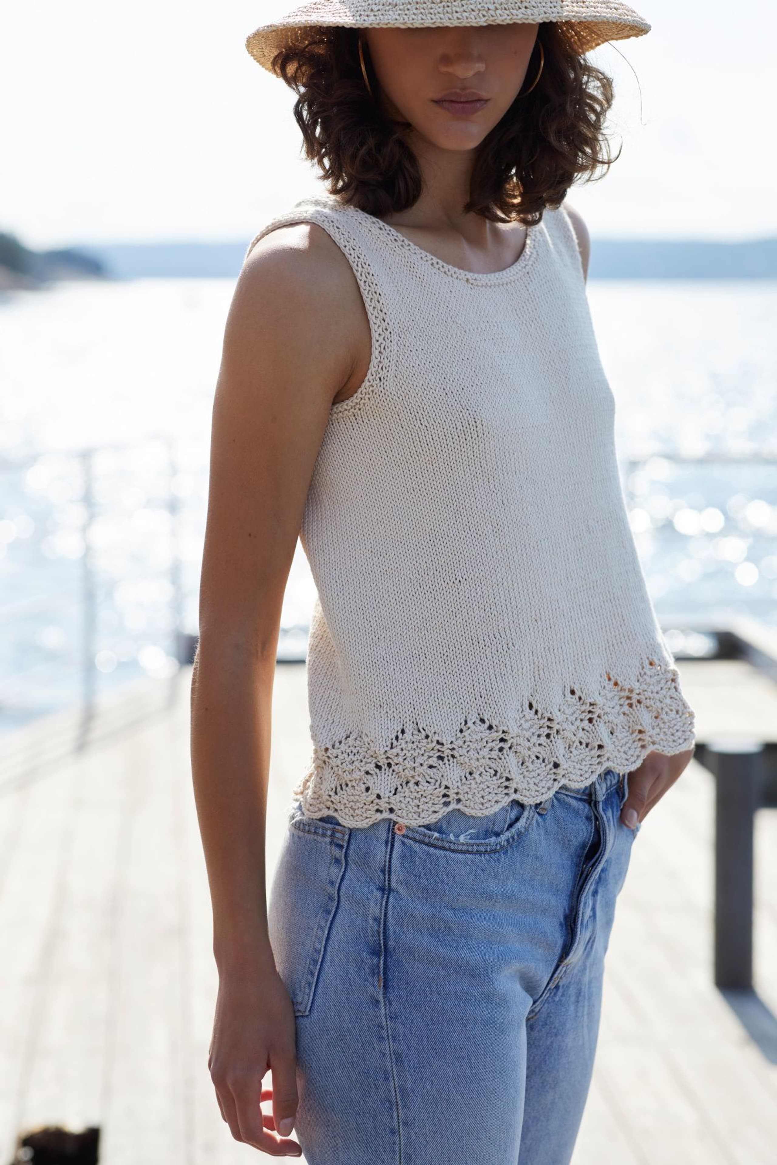 Enkel topp uten ermer med hullmønster nederst i kanten. Strikket i glattstrikk, nedenfra og opp. Fra ermehullet strikk for - og bakstykket hver for seg frem og tilbake.