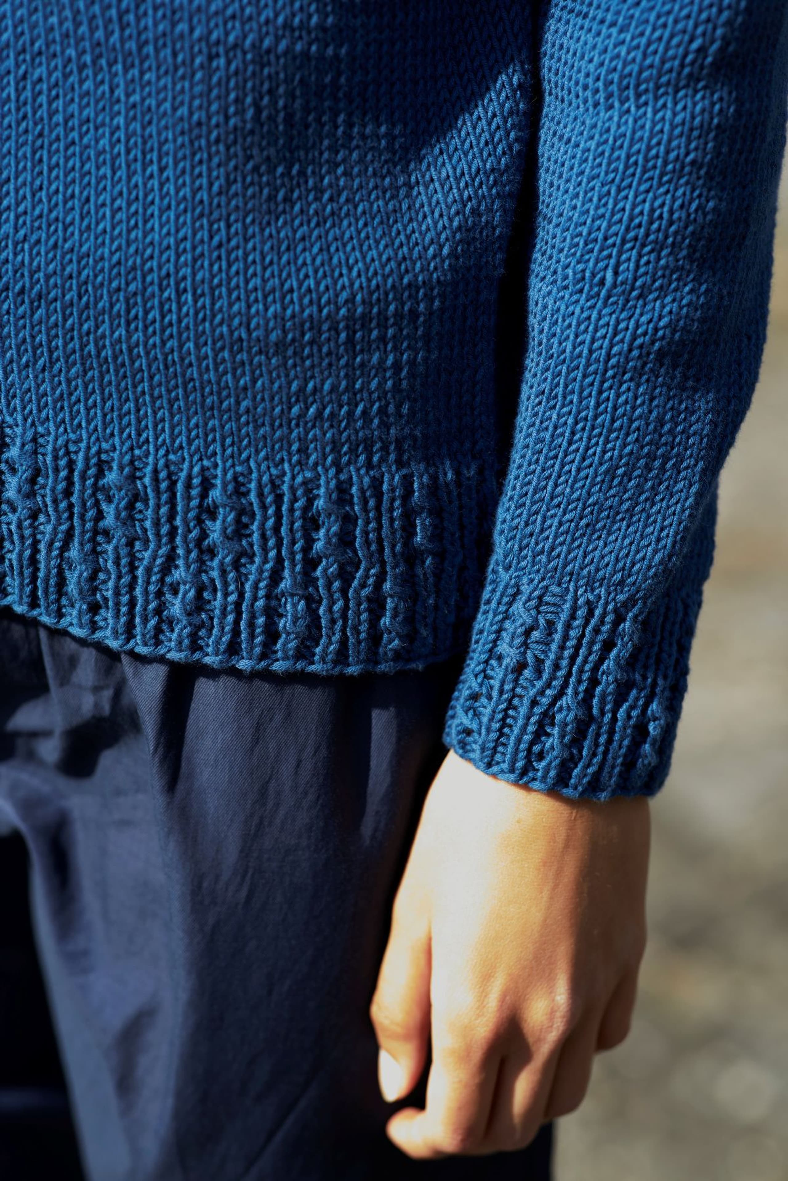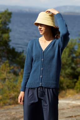 Jakken med v-hals strikkes i glattstrikk frem og tilbake nedenfra og opp. Det er strikket inn mønster i vrangborden på bol og ermer. Ermene er strikkes rundt og sydd til bolen til slutt. Lukket jakke har en tenkt bevegelsesvidde på 8 cm.