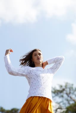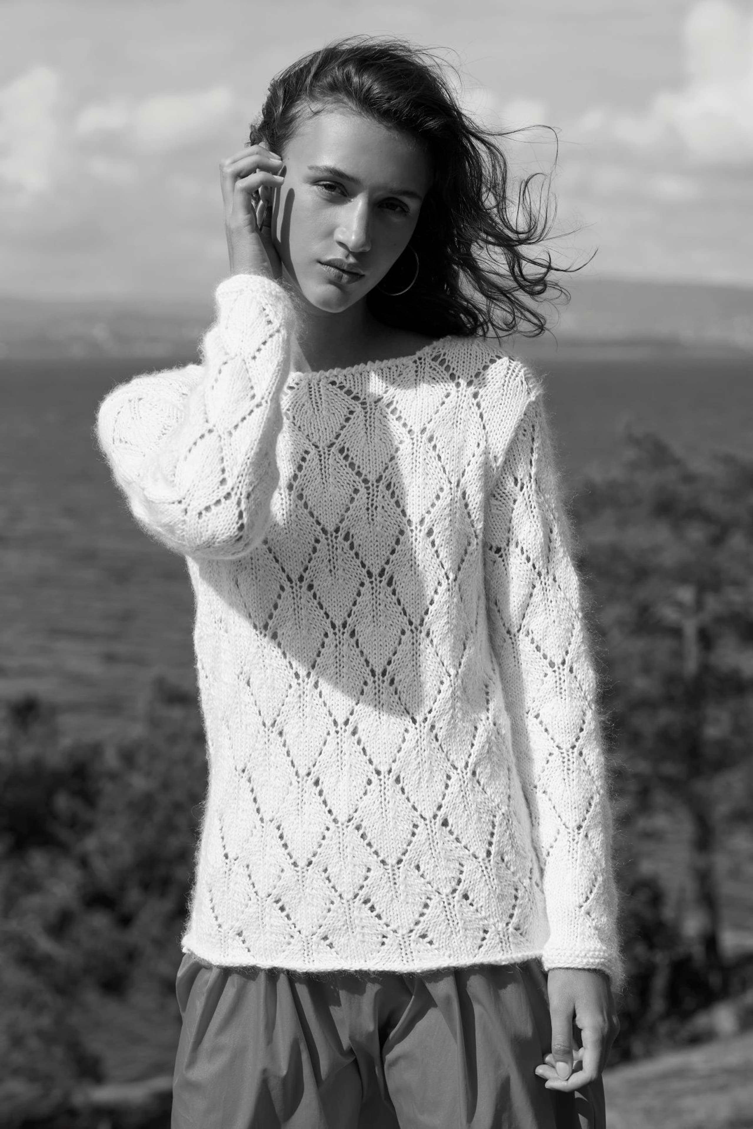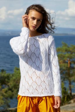 Hele genseren strikkes med 1 tråd Petunia og 1 tråd Plum. Den strikkes nedenfra og opp, og har isydde ermer. Rundt halsåpning er det heklet en kant med krepsemasker. Genseren har en tenkt bevegelsesvidde på 8 cm.