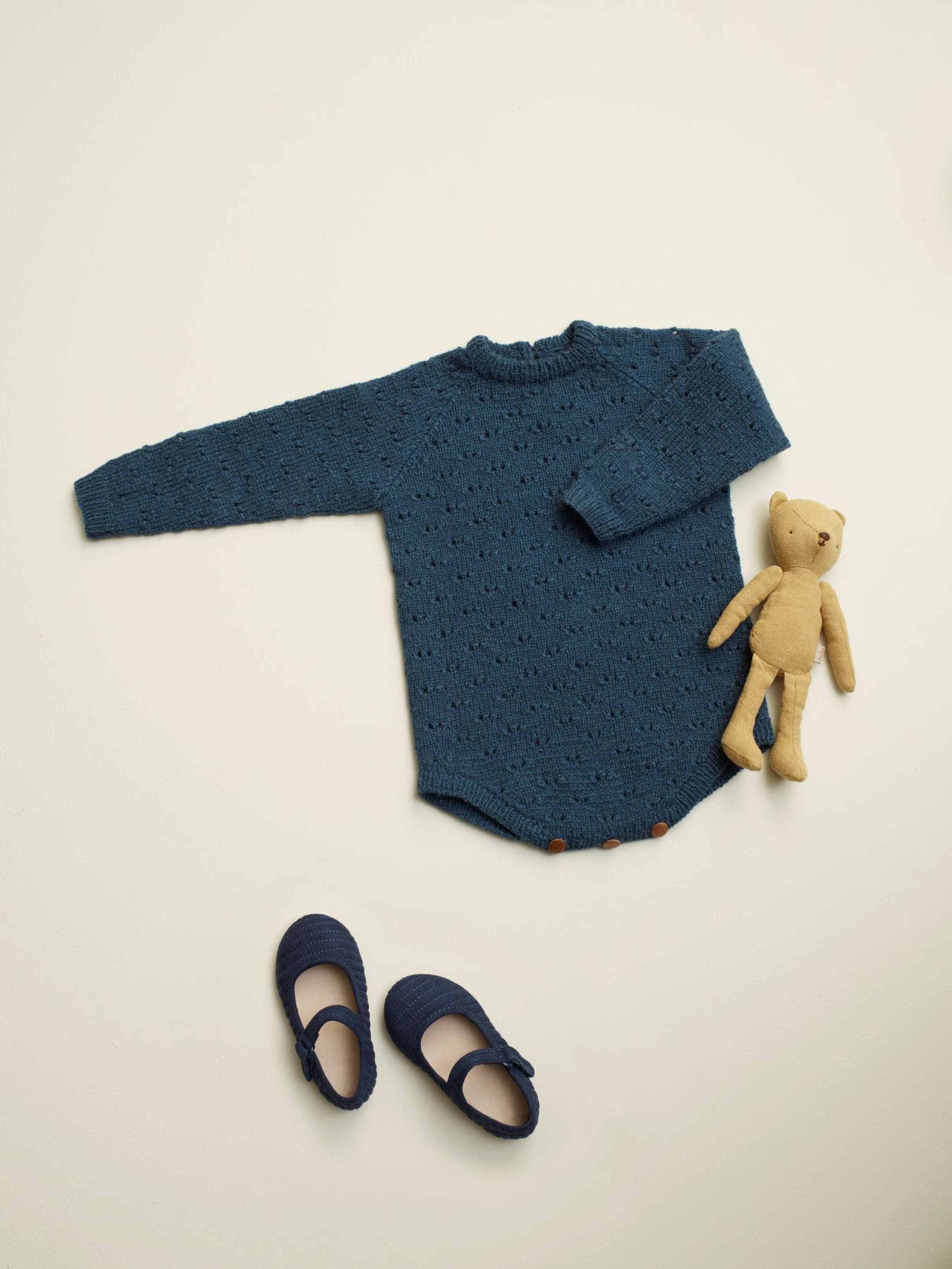 Duebodyen har et lett hullmønster over hele bodyen. Den er strikket nedenfra og opp, med raglan. For- og bakstykket strikkes hver for seg før de strikkes sammen. Det er knepping mellom bena og splitt med knapp i nakken.