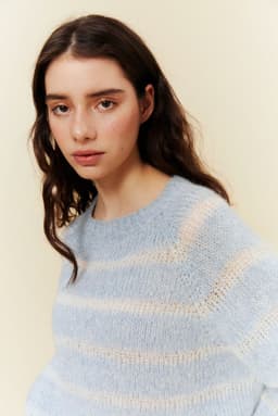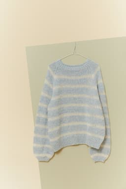 Oversized raglangenseren strikkes rundt ovenfra og ned. Den strikkes i striper, vekselsvis med enkel og dobbel tråd. Genseren har en tenkt bevegelsesvidde på 14 cm.