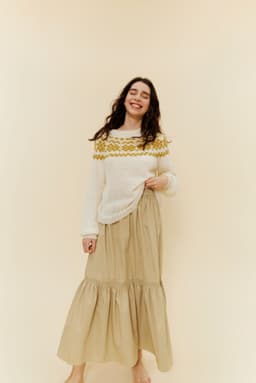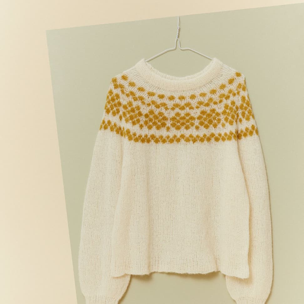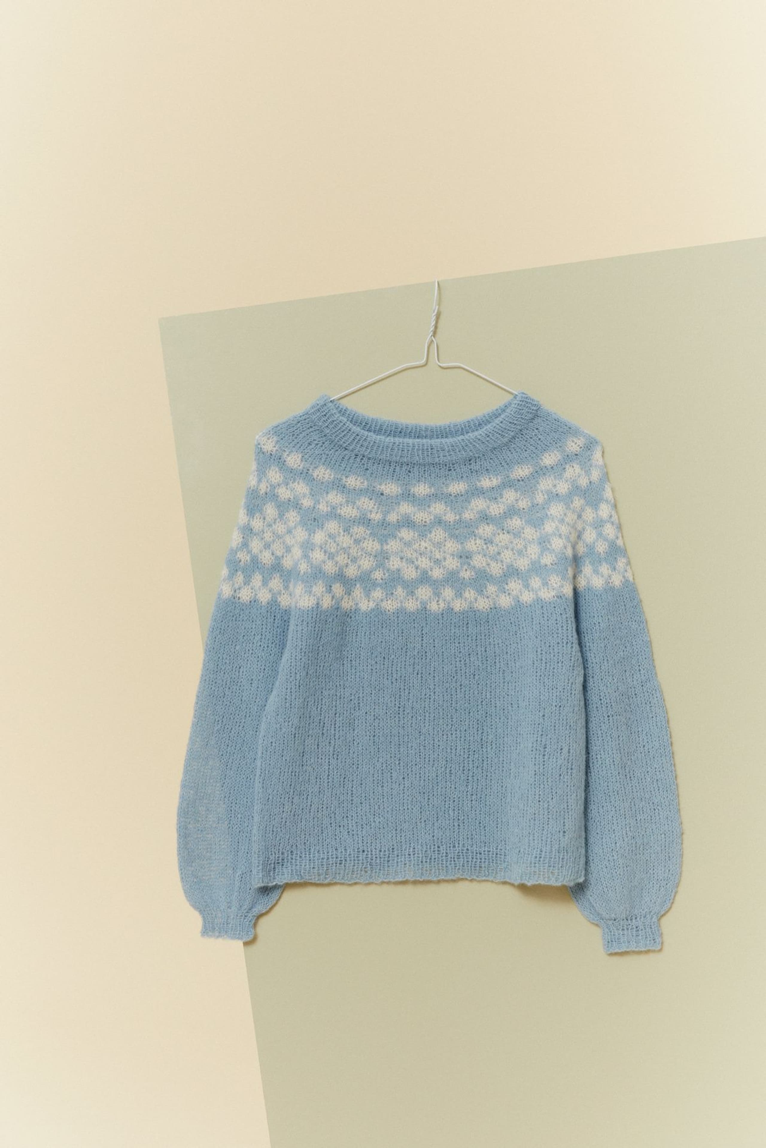 Genseren strikkes rundt ovenfra og ned, med mønster øverst på bærestykket. Genseren har en tenkt bevegelsesvidde på 8 cm.