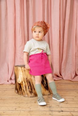 Skjørtet strikkes ovenfra og ned med riller i livet og glattstrikk videre. Skjørtet kan enkelt strikkes lengre eller kortere. Det har en strikket snor til knytting i livet.