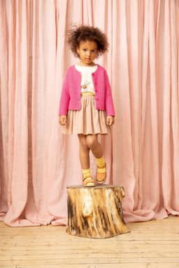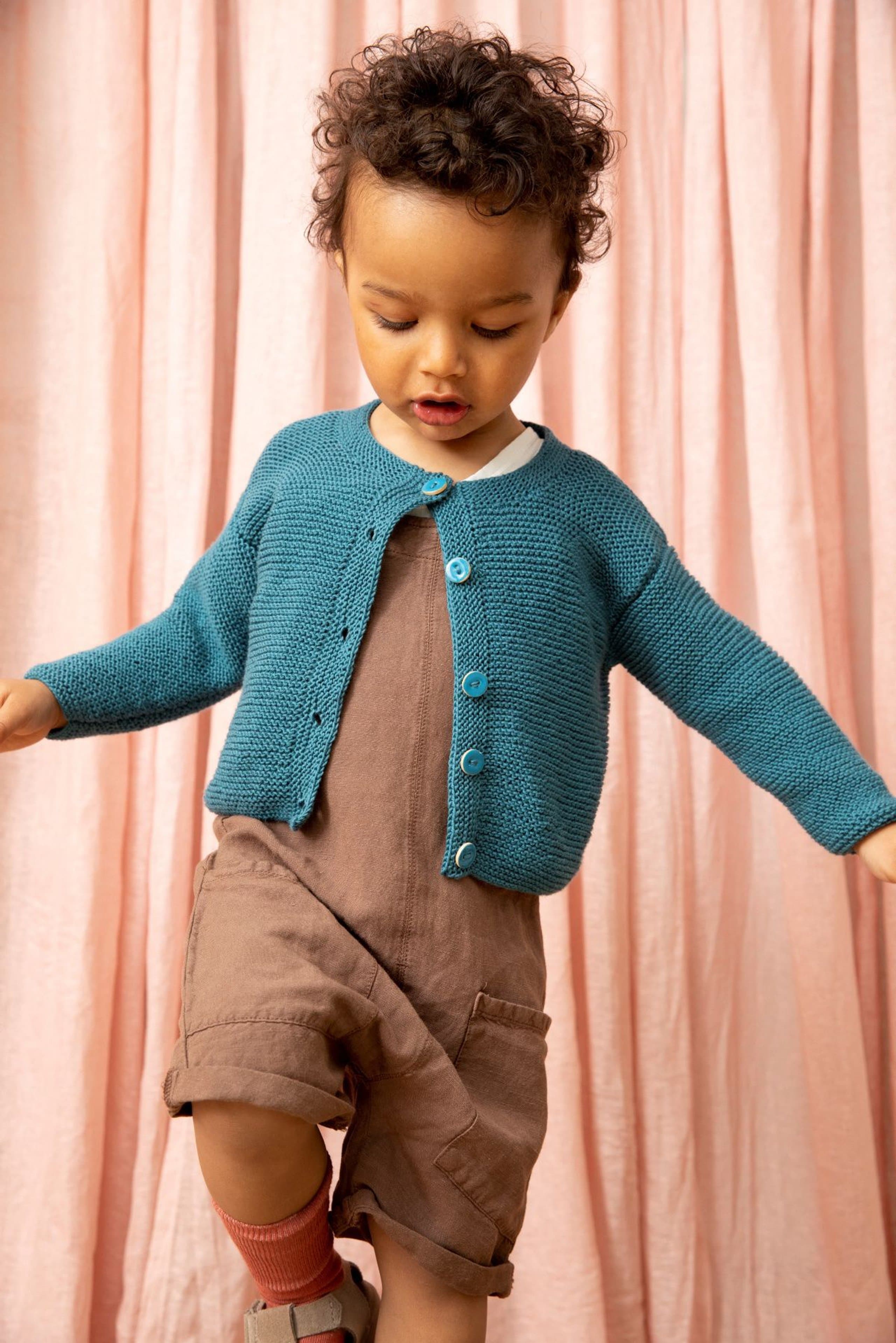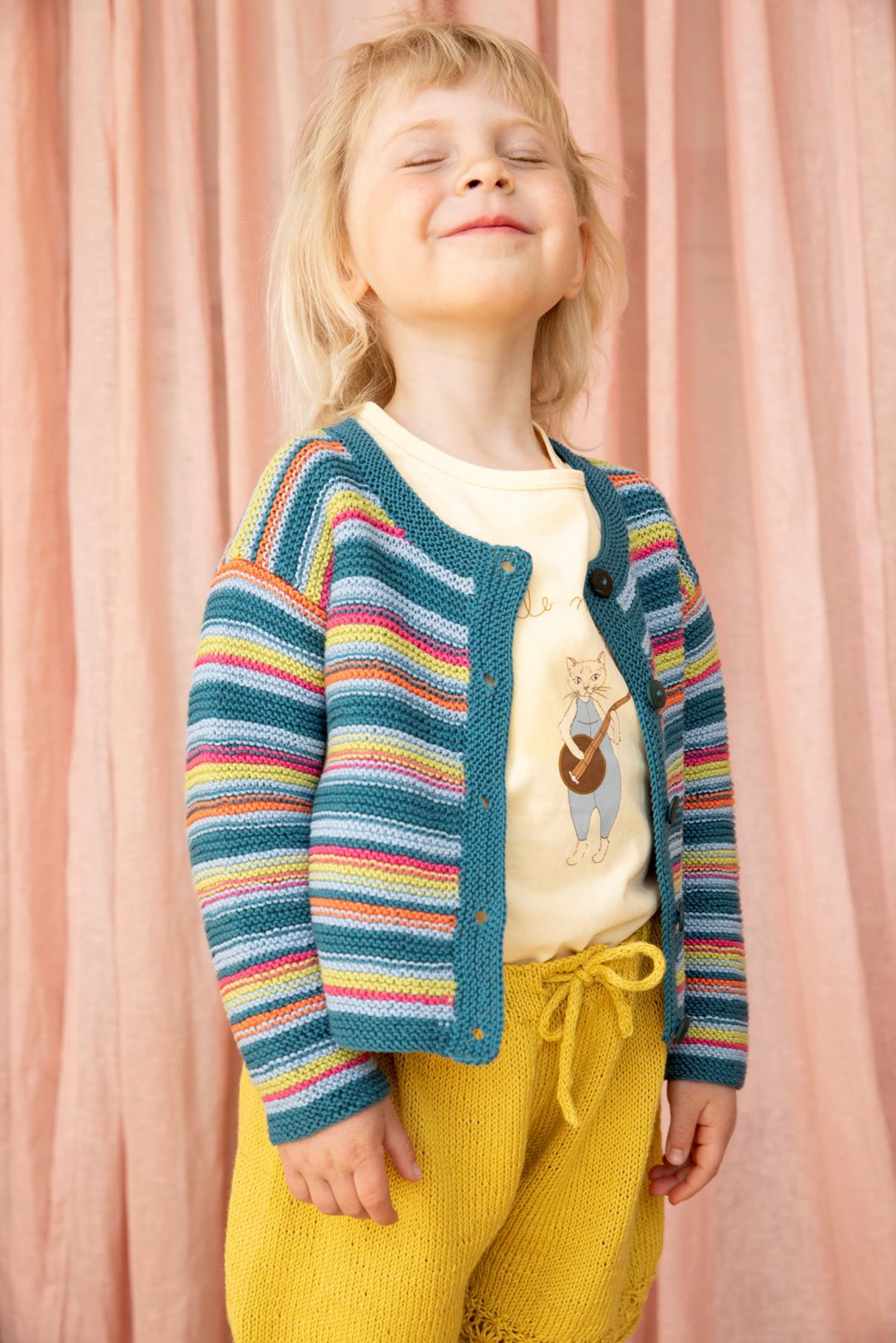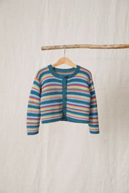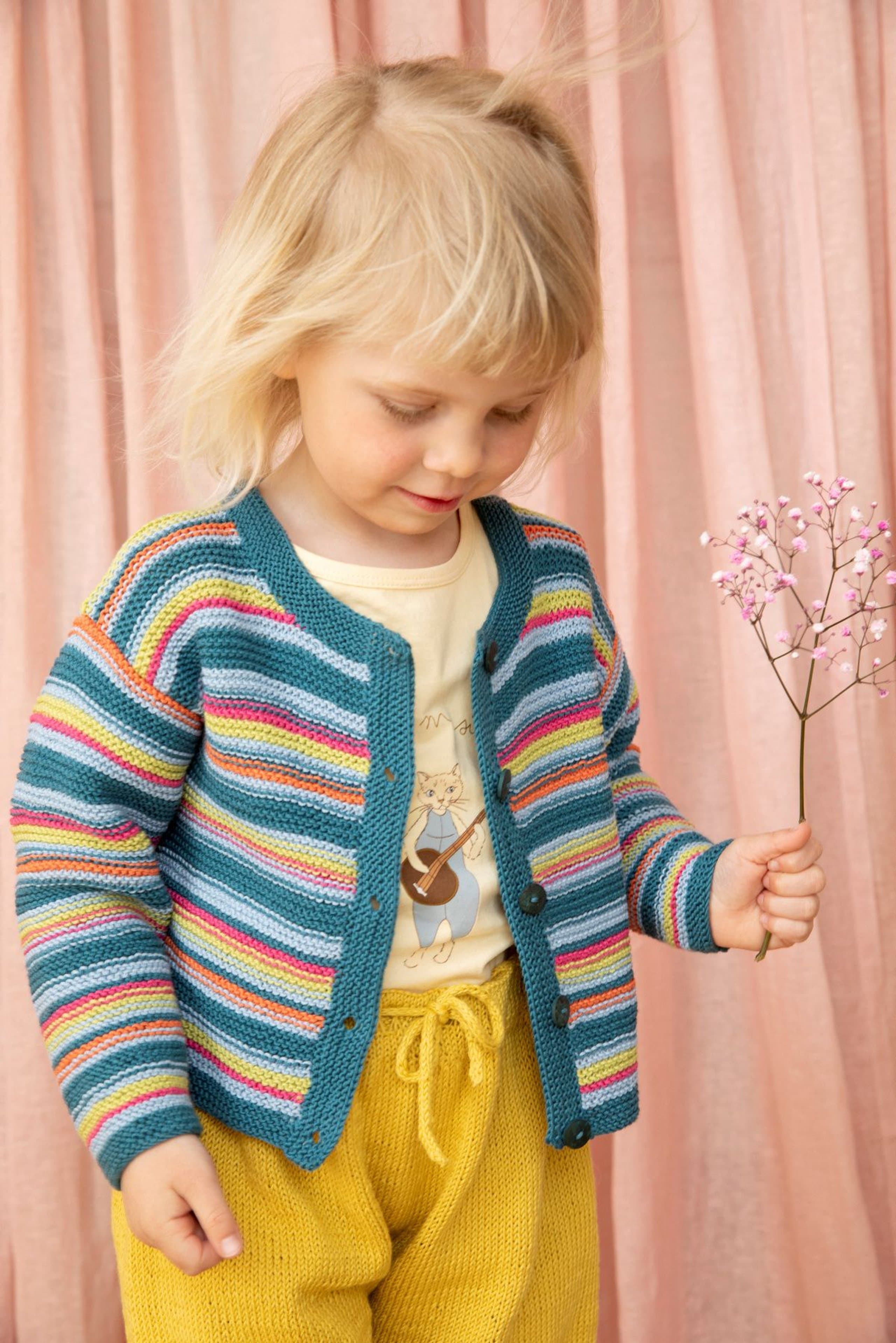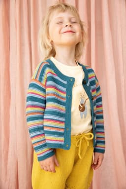 Kort, enkel jakke i rillestrikk som strikkes frem og tilbake nedenfra og opp. Den kan strikkes ensfarget eller med stripe- mønster. Diagrammet på stripemønsteret kan du lett lage ditt eget utrykk på, ved å flytte på fargene og endre antall omganger på stripene. Retten og vrangen får litt ulikt utrykk, velg derfor hvilke side som skal vende ut før montering og før hals- og forkanter strikkes på. Ermene strikkes for seg og sys i ermehullene etter skuldrene er sydd sammen. Lukket jakke har en tenkt bevegelsesvidde på 8 cm.