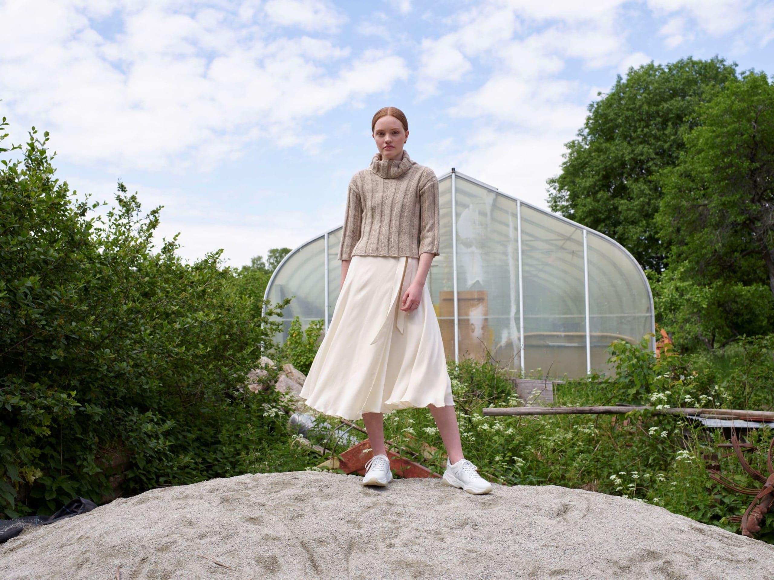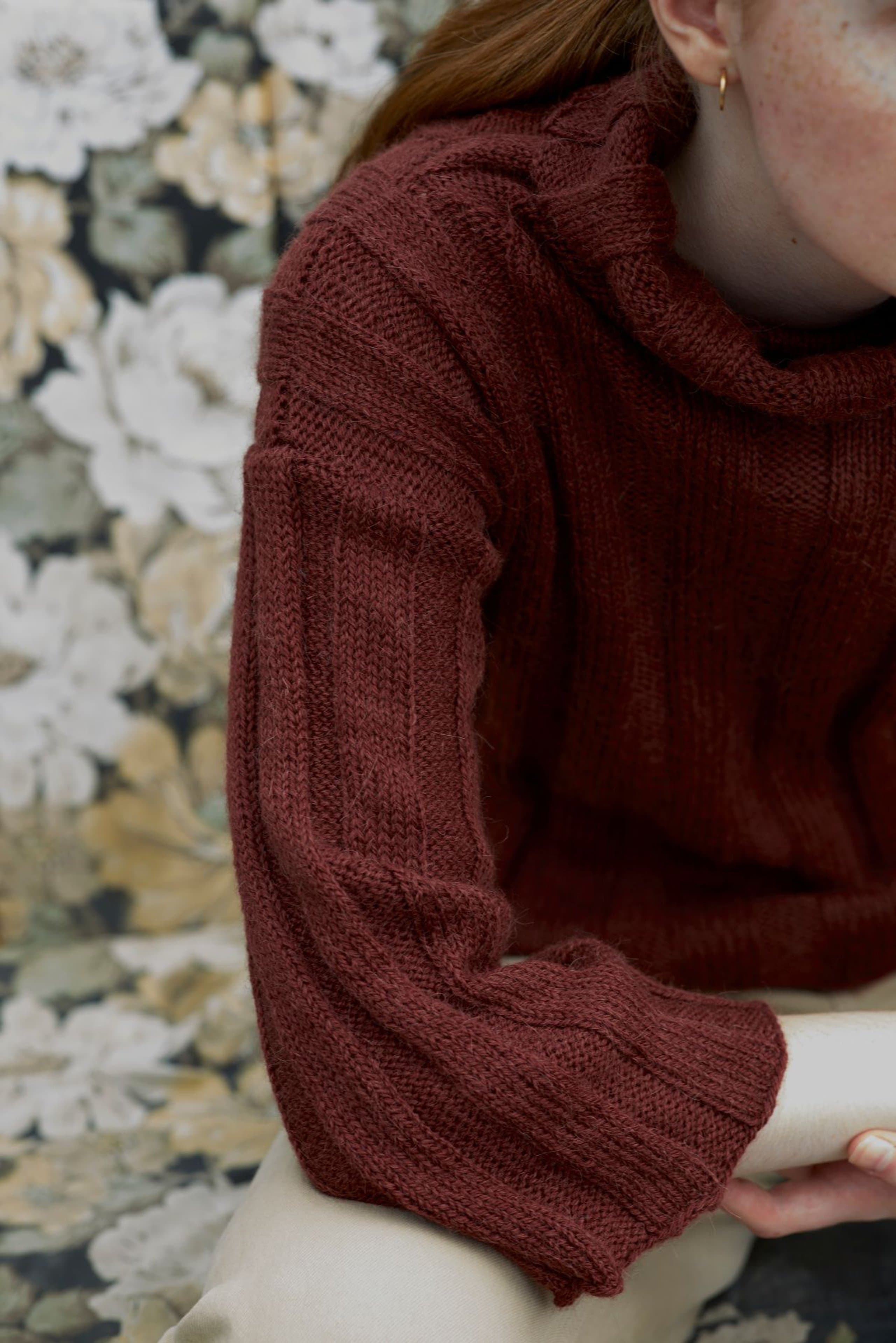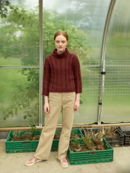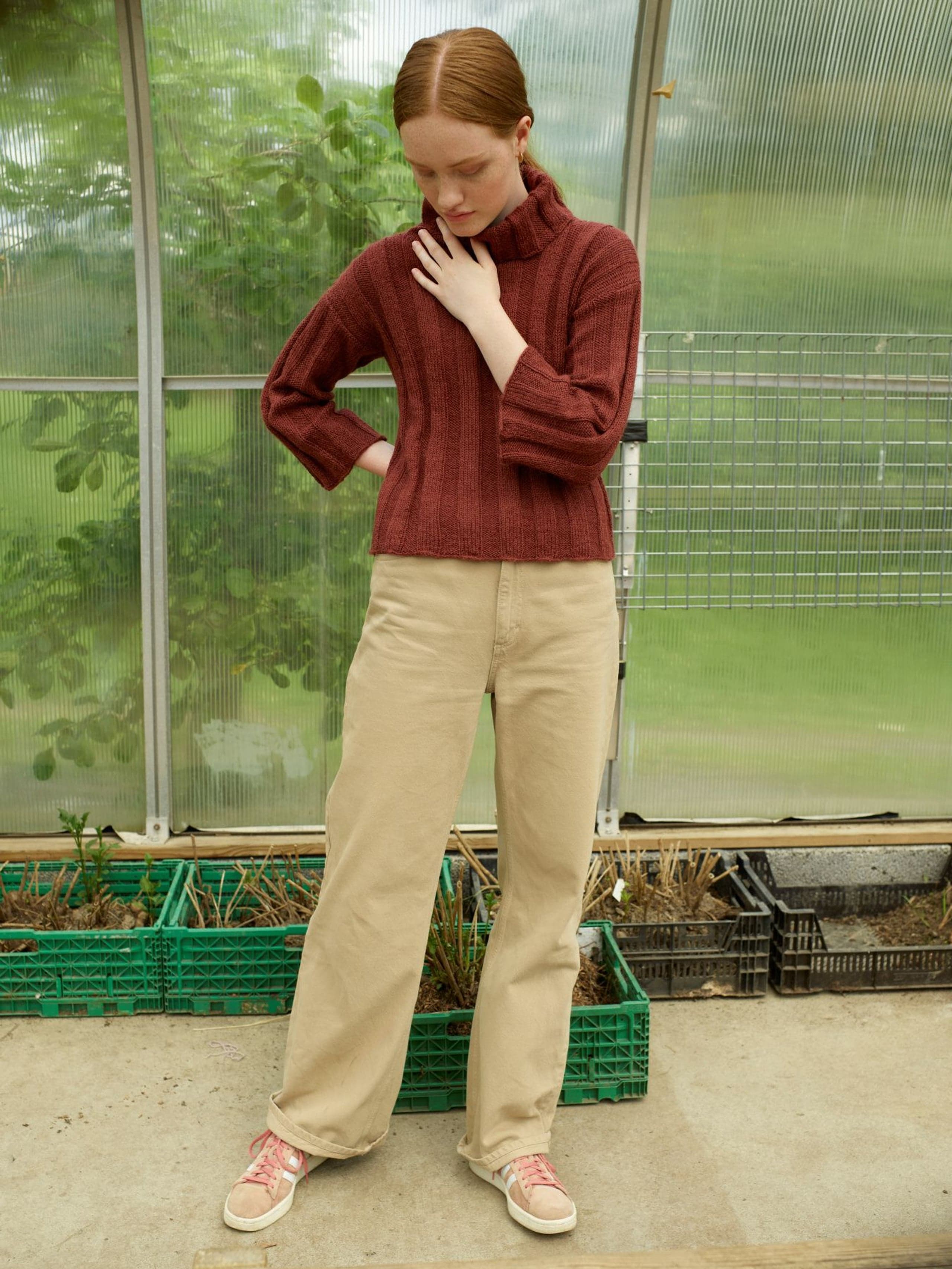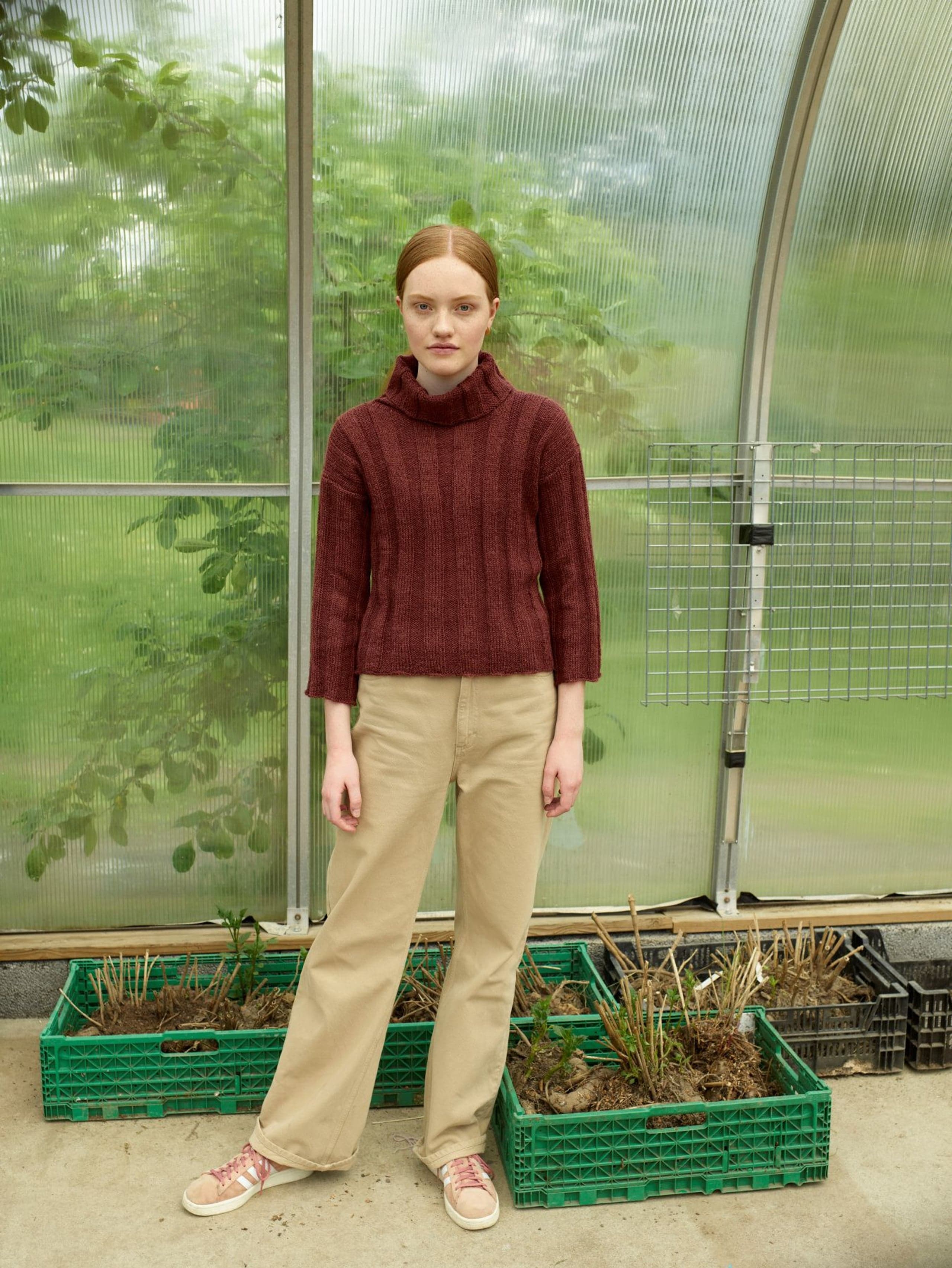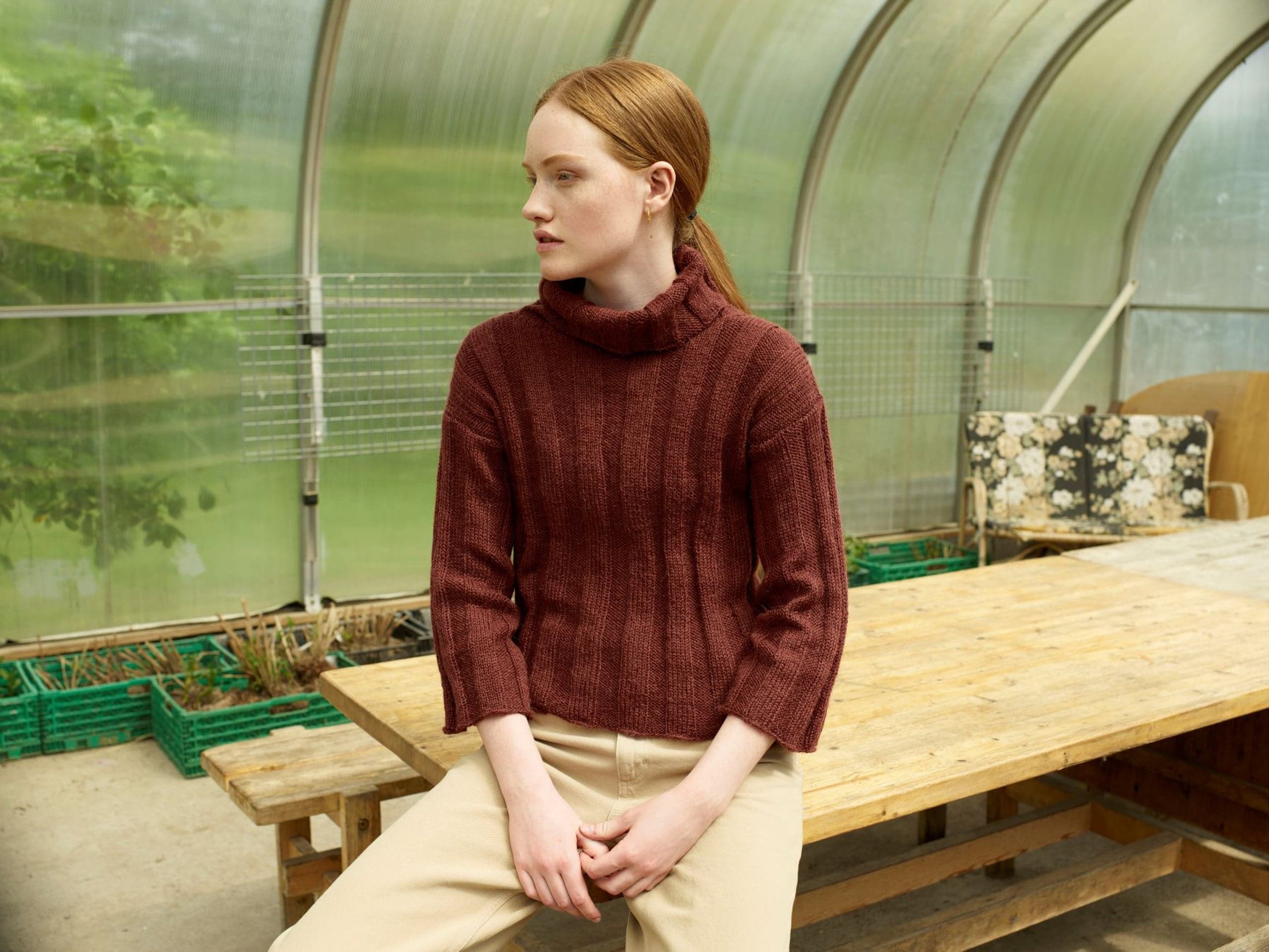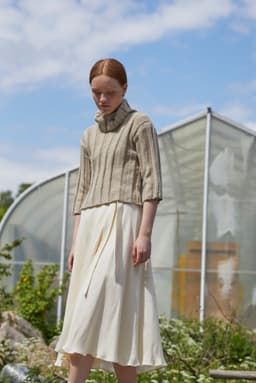 Vår i lufta-genseren er en ribbestrikket genser med høy hals, strikket nedenfra og opp. Genseren har en kort passform med litt vide, og trekvartlange ermer som gir den et vårlig preg. Ermene strikkes ved å plukke opp m rundt ermehullet og strikke nedover. På denne måten kan du justere ermets lengde etter behov. Ønsker du lengre genser er det enkelt å strikke bolen litt lengre før det felles til ermehull. Pass i så fall på å beregne litt ekstra garn.