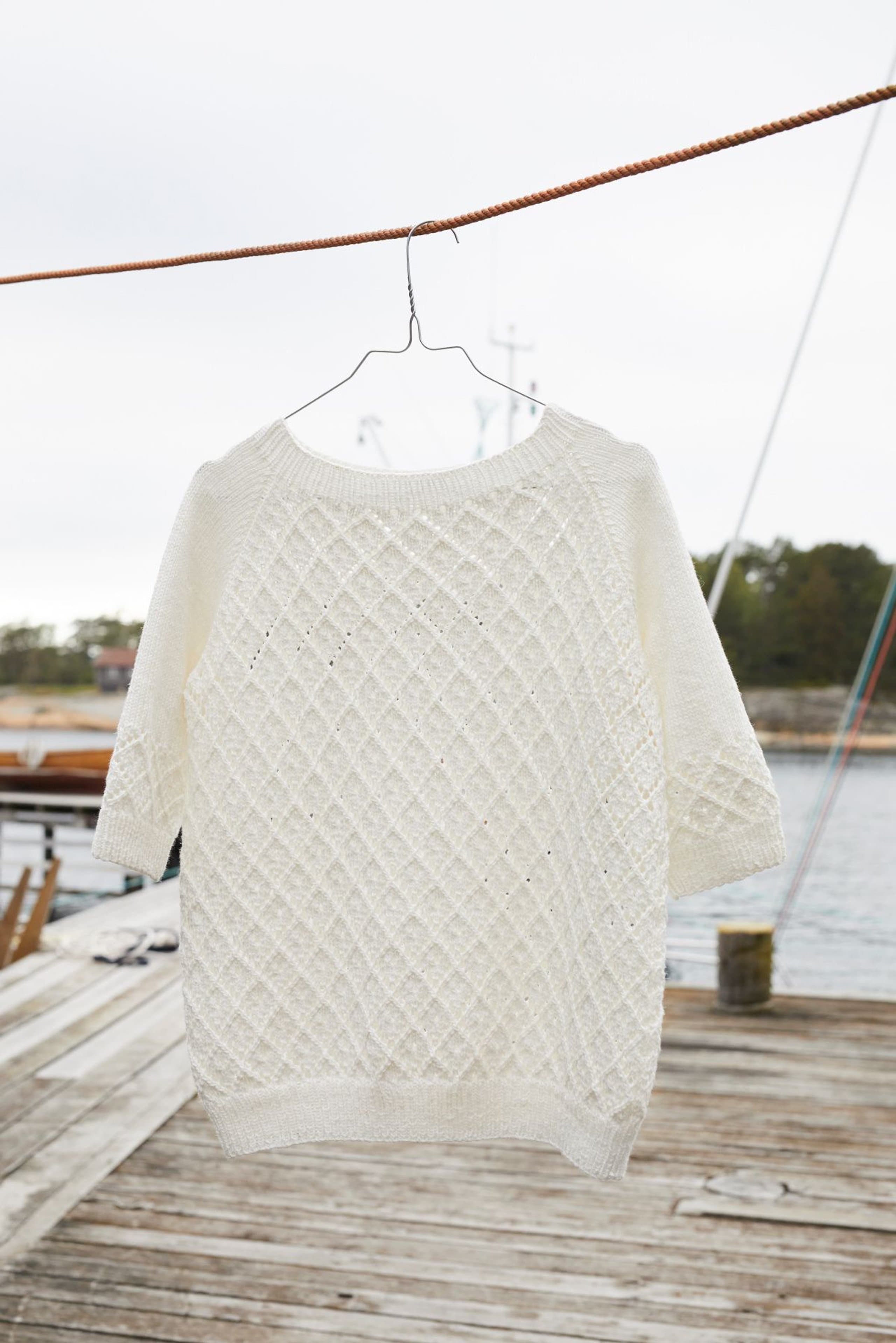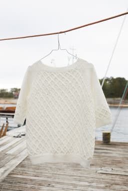 Violatopp med hullmønster, korte ermer og raglanfelling. Toppen strikkes nedenfra og opp, med vrangbord nederst på bol og. Toppen har en tenkt bevegelsesvidde på 19 cm.