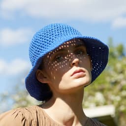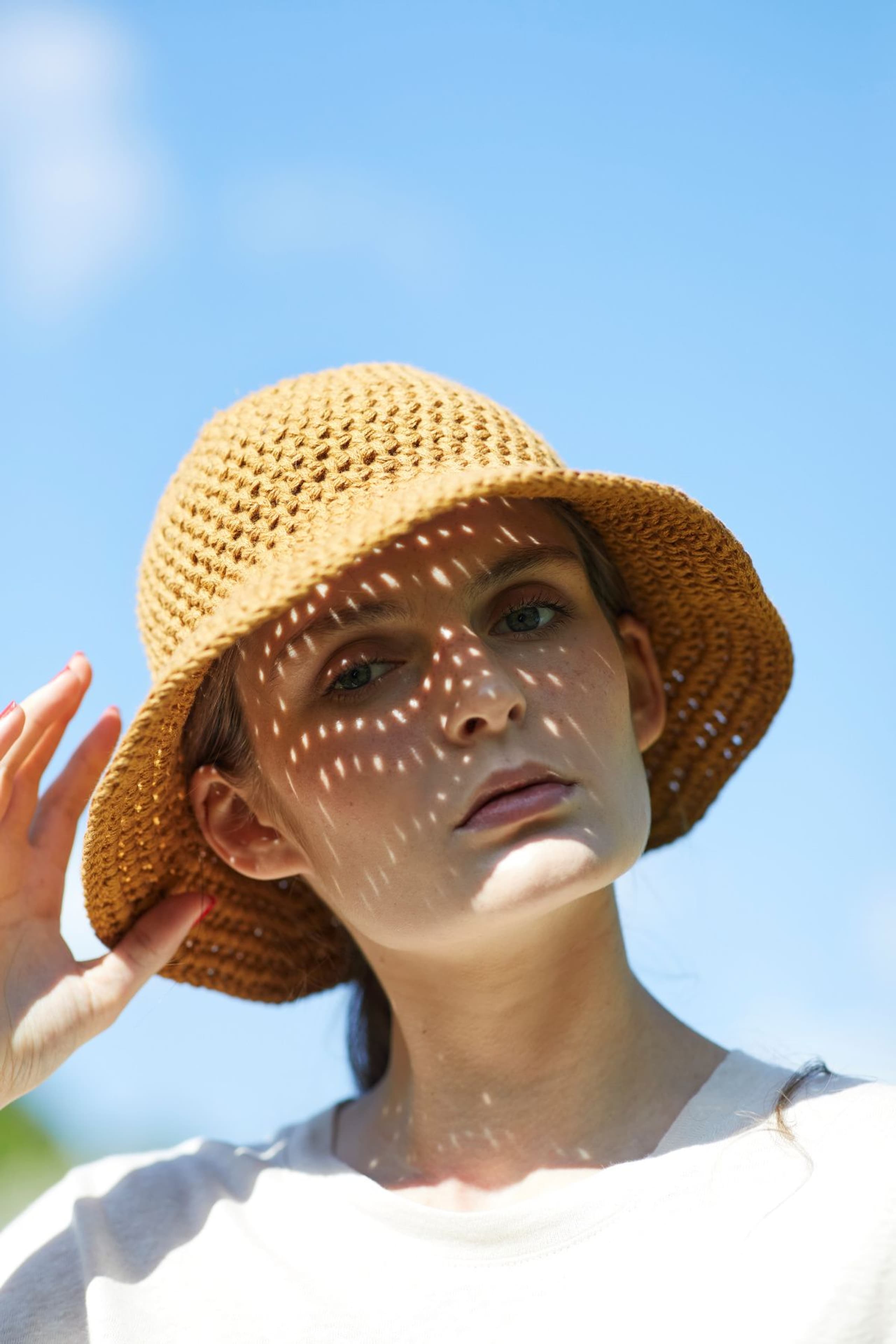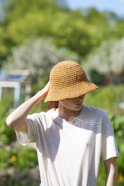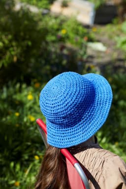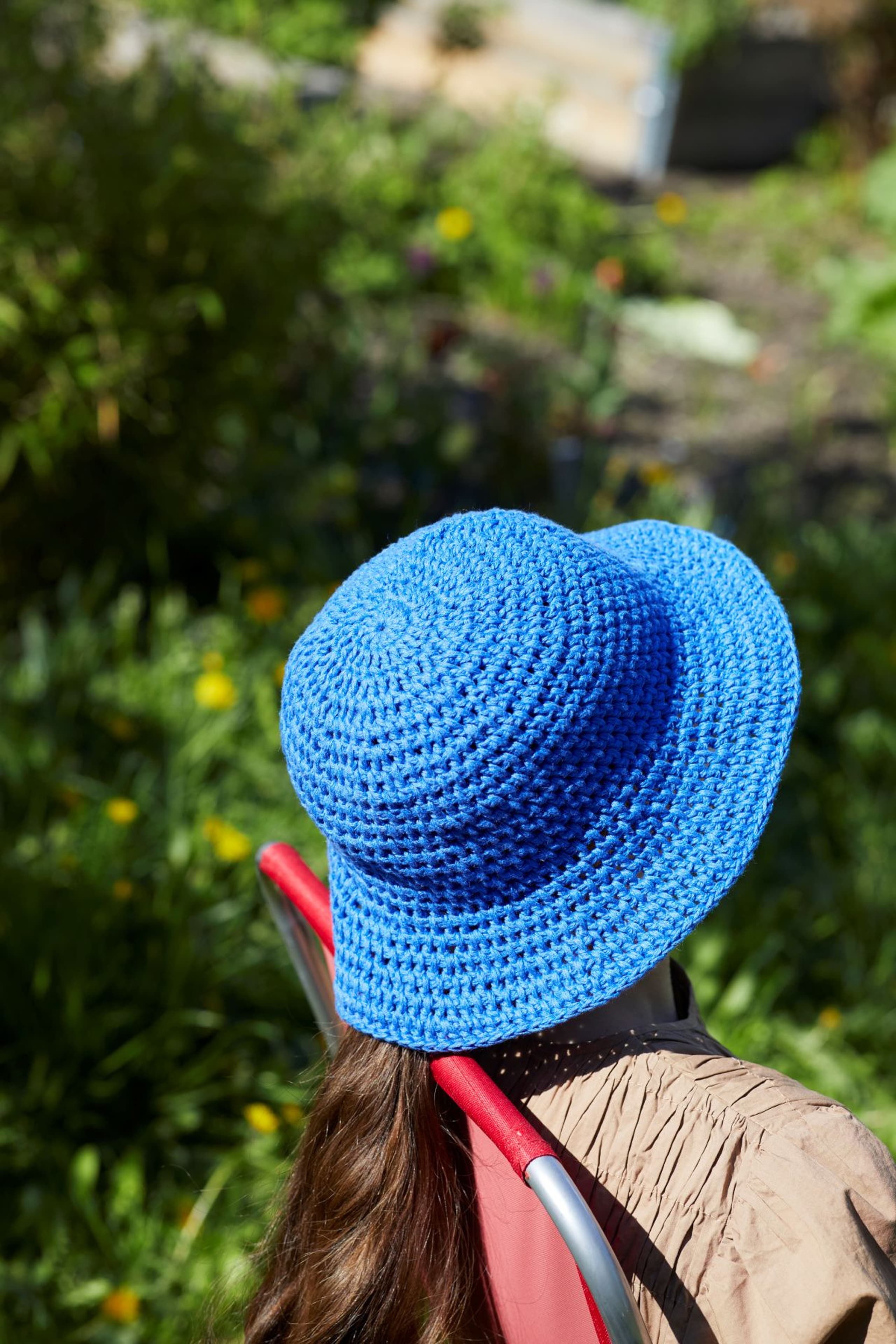 Hatten hekles ovenfra og ned med dobbel tråd.