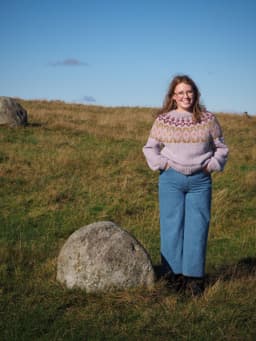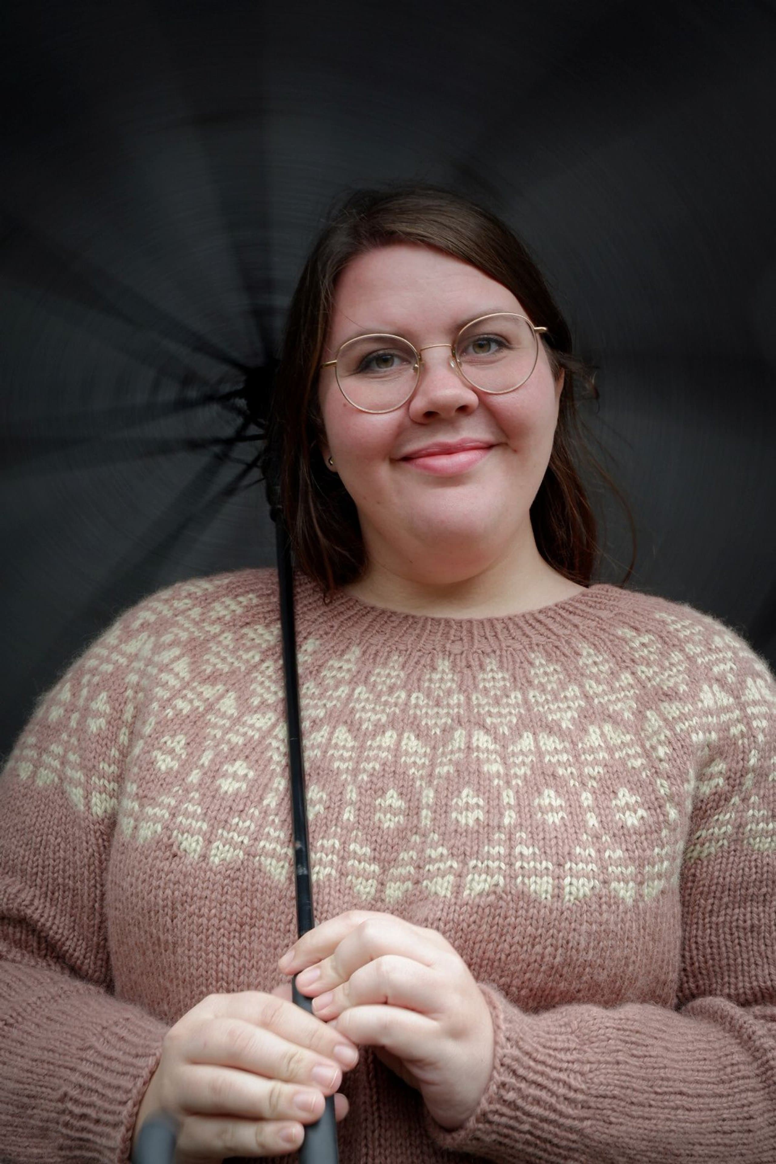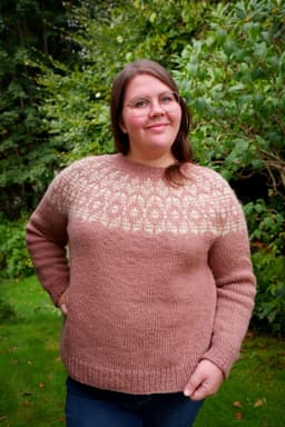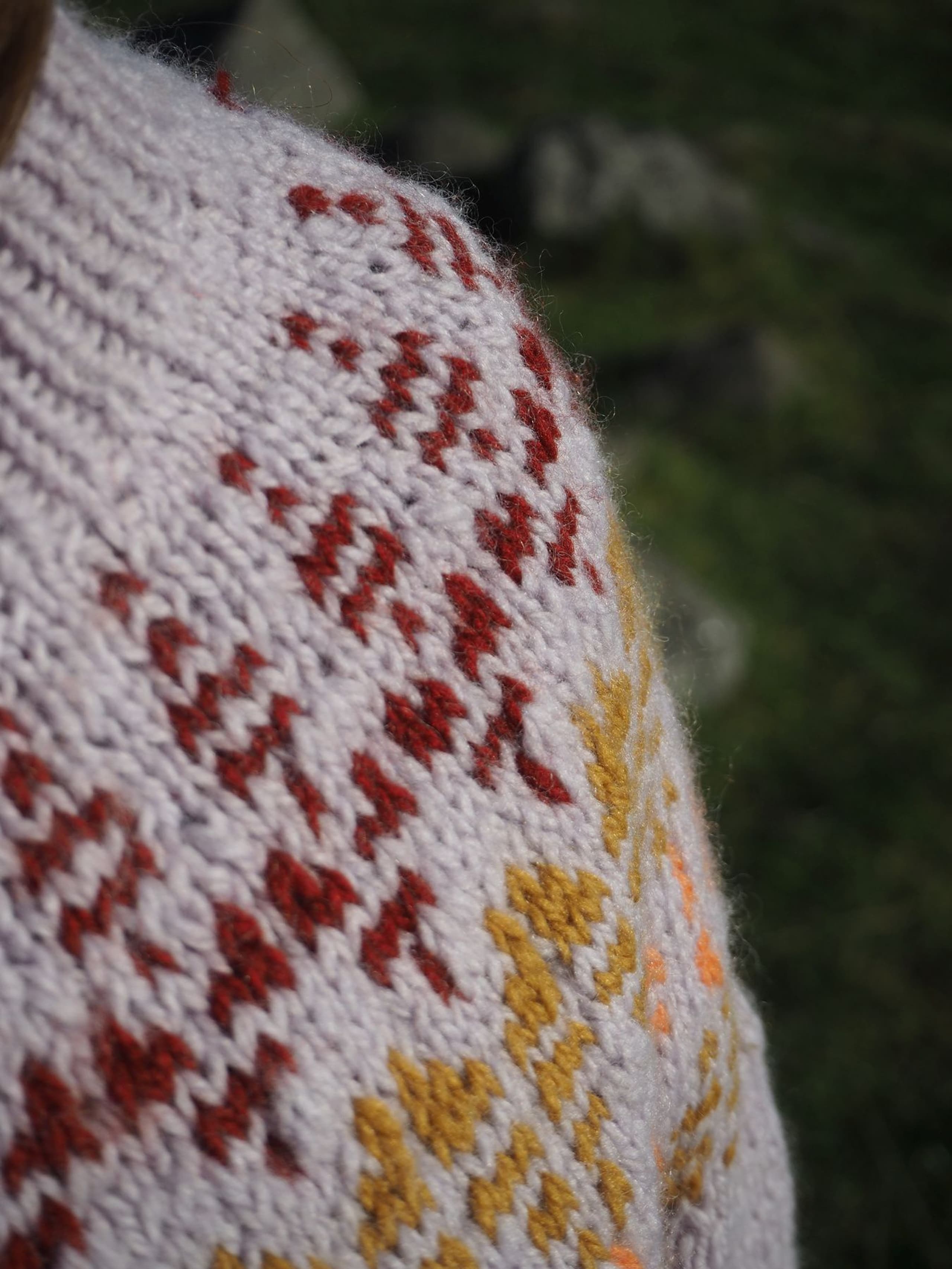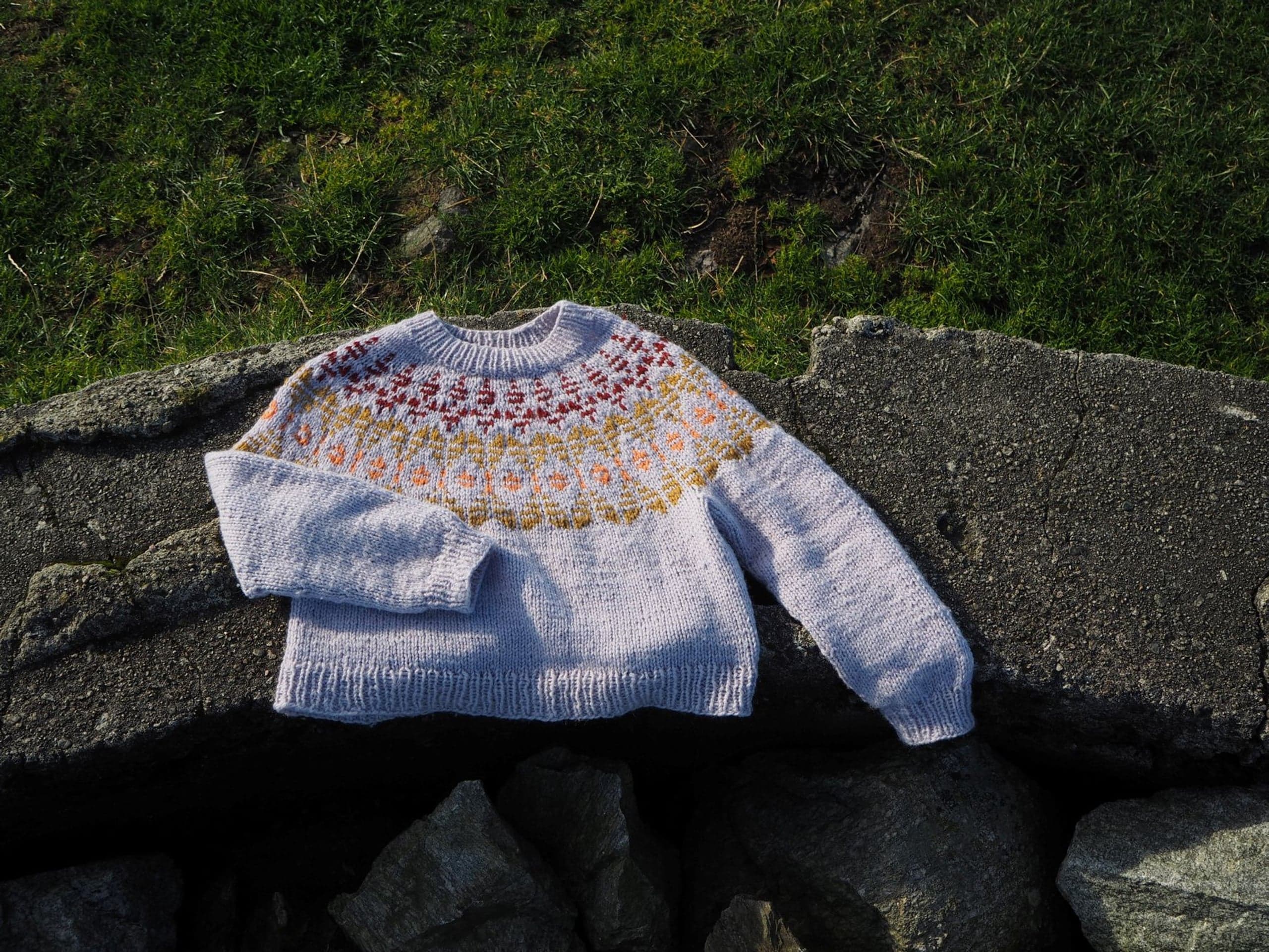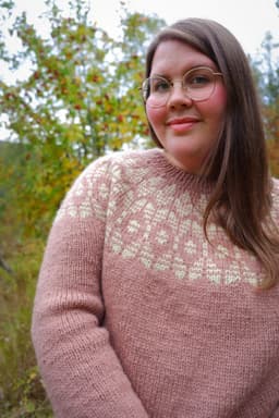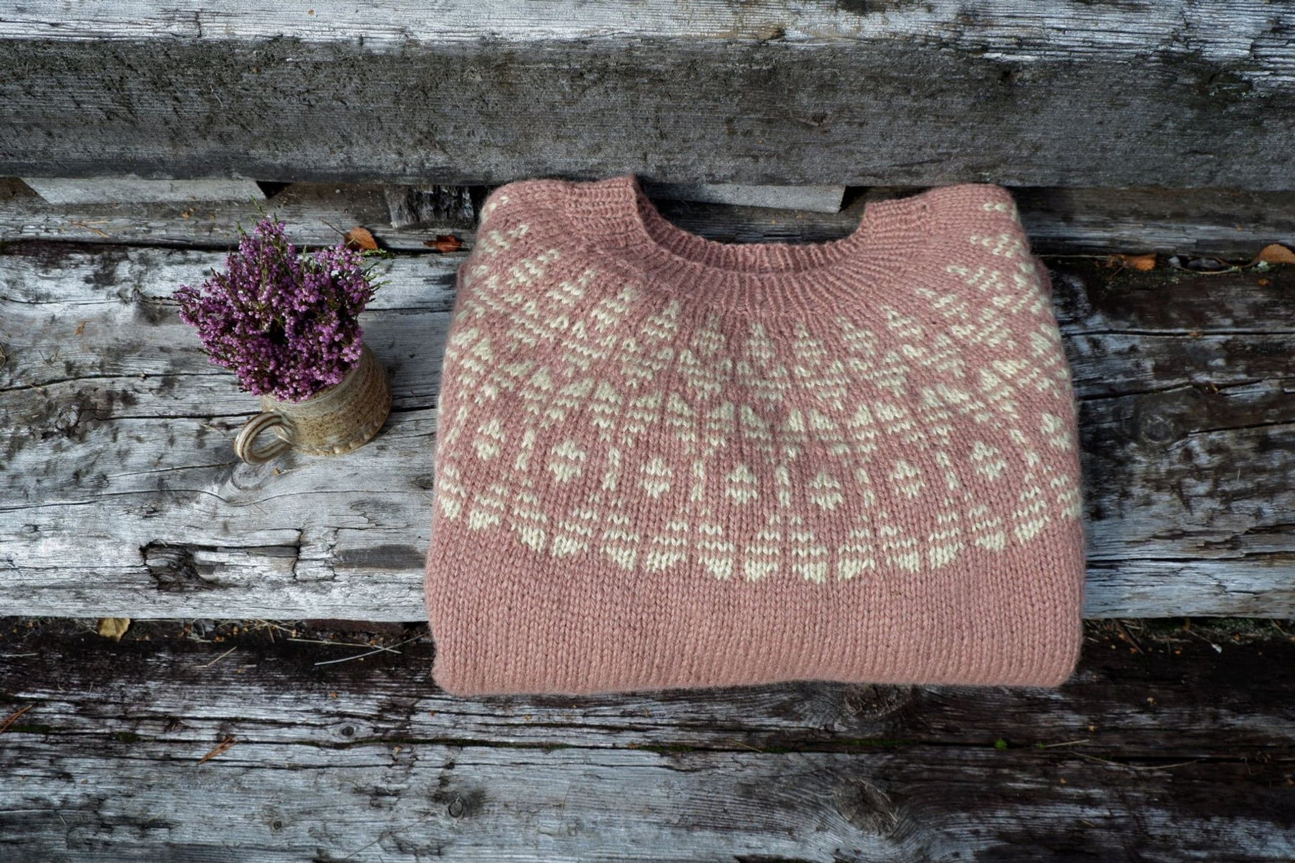 Høstlynggenseren er en nydelig genser med rundt mønstret bærestykke og ribbestrikkede kanter. Mønsteret blir like fint i to, som i fire farger. Denne genseren strikkes ovenfra og ned. Halsringningen formes ved å strikke vendepinner, det gjør at genseren legger seg pent rundt kroppen. Deretter strikkes mønsteret og du kan glede deg til at nesten annenhver pinne i mønstringen er ensfarget og du kan «hvile» i en ensfarget omgang. Denne modellen er noe kort, men kan lett justeres etter ønske. Bevegelsesvidde er 10-13 cm. **Kjøp magasinet uten garn her:** [Fremstrikk](https://www.raumagarn.no/produkt/tilbehor/fremstrikk)