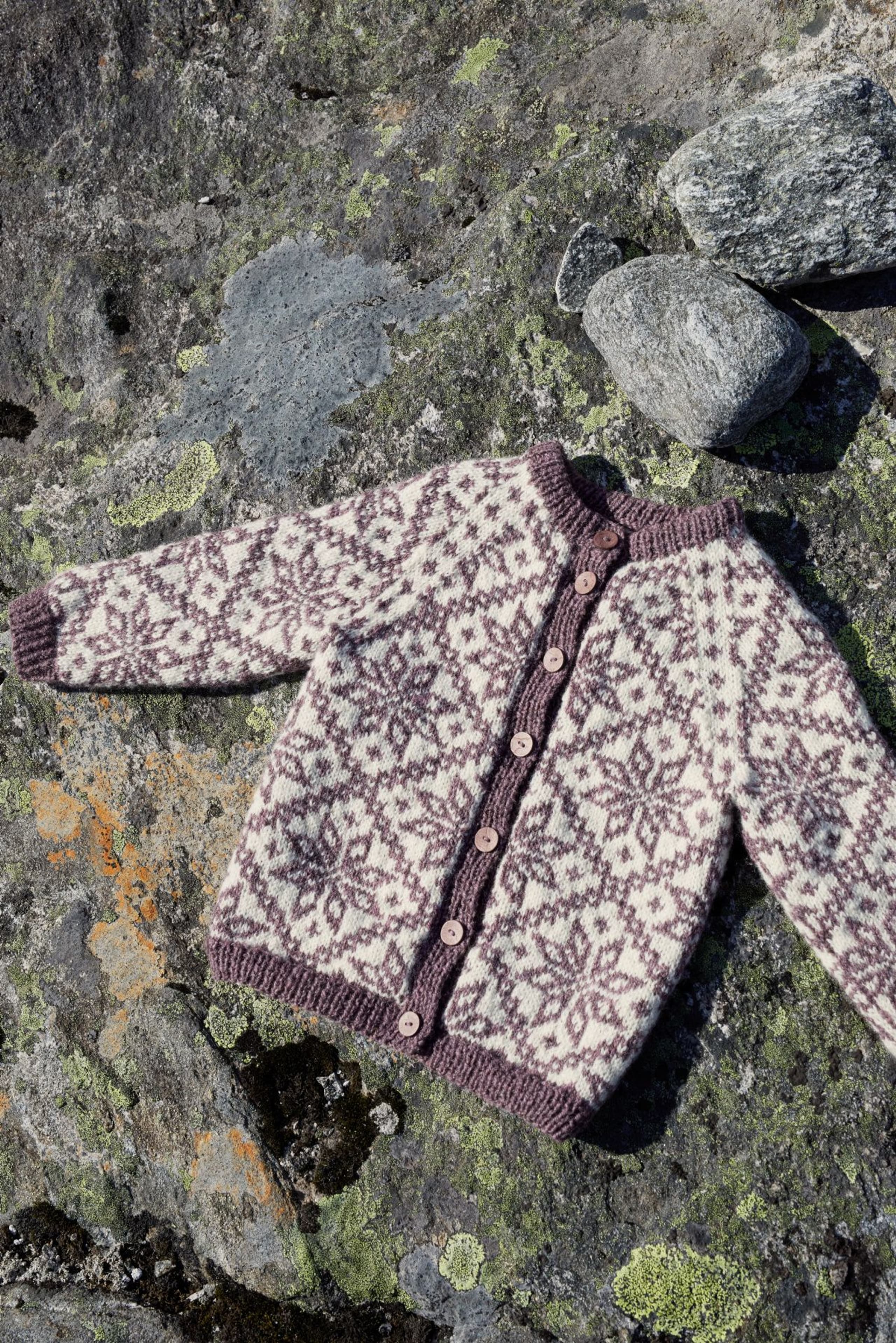 Fjelljakken er en helmønstret jakke med raglanfelling. Det nydelige Fjellmønsteret har vi hentet fra arkivet på Rauma Ullvarefabrikk. Fordi mønsterrapportene er så store, er det store hopp mellom noen av størrelsene og vi har gradert ved å variere strikkefastheten. Husk å sjekke strikkefastheten! Finner du ikke ønsket størrelse, ta en titt på 404-3 Lillefjelljakke i Lamull. Fjelljakken strikkes rundt nedenfra og opp. Den sys og klippes opp midt foran før stolper og halskant strikkes. Vrangbordene strikkes med vridde rette masker for et mer definert uttrykk.