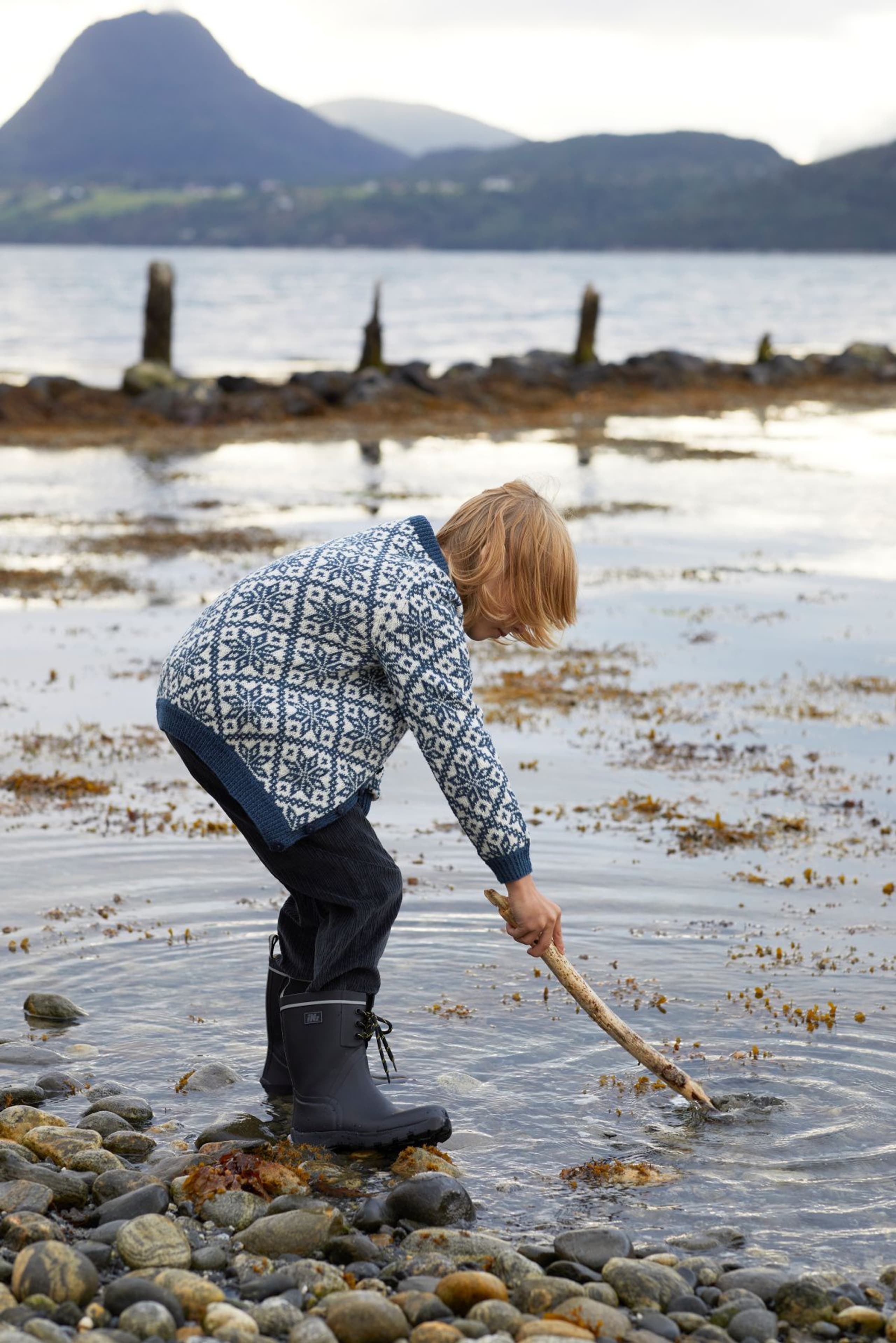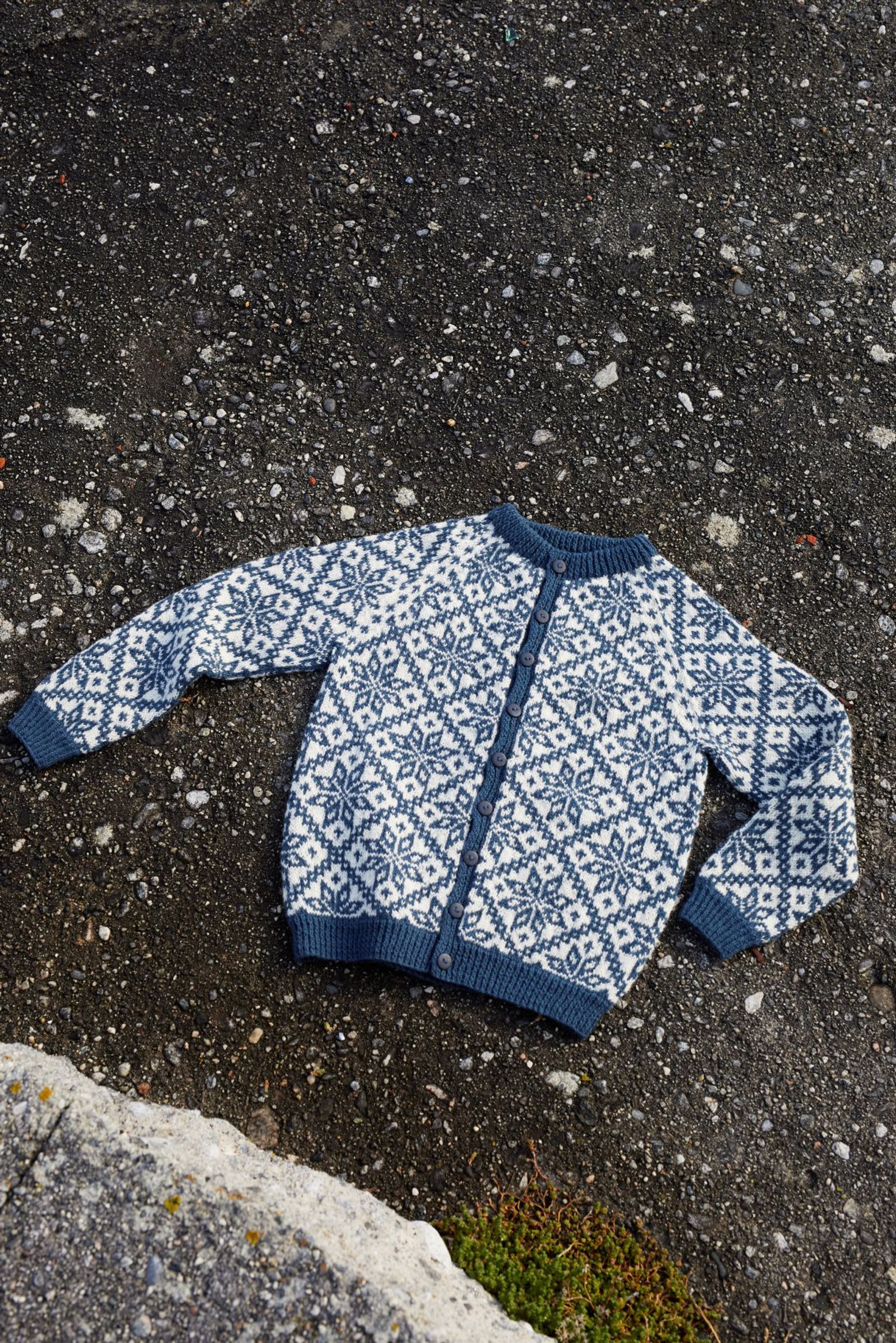 Lillefjelljakken er strikket i Lamull, vår tynneste, fineste og mykeste norske ullkvalitet. Jakken strikkes nedenfra med raglanfelling og en liten bord mellom fellingene. Det flotte Fjellmønsteret har vi hentet fra arkivet på Rauma Ullvarefabrikk. Fordi mønsterrapportene er så store, er det store hopp mellom noen av størrelsene og vi har gradert ved å variere strikkefastheten. Vær nøye med å sjekke strikkefastheten din! Finner du ikke din størrelse, ta en titt på 404-2 Fjelljakke i Finull. Lillefjelljakken strikkes nedenfra og opp. Den klippes opp midt foran før man strikker stolper og halskant.