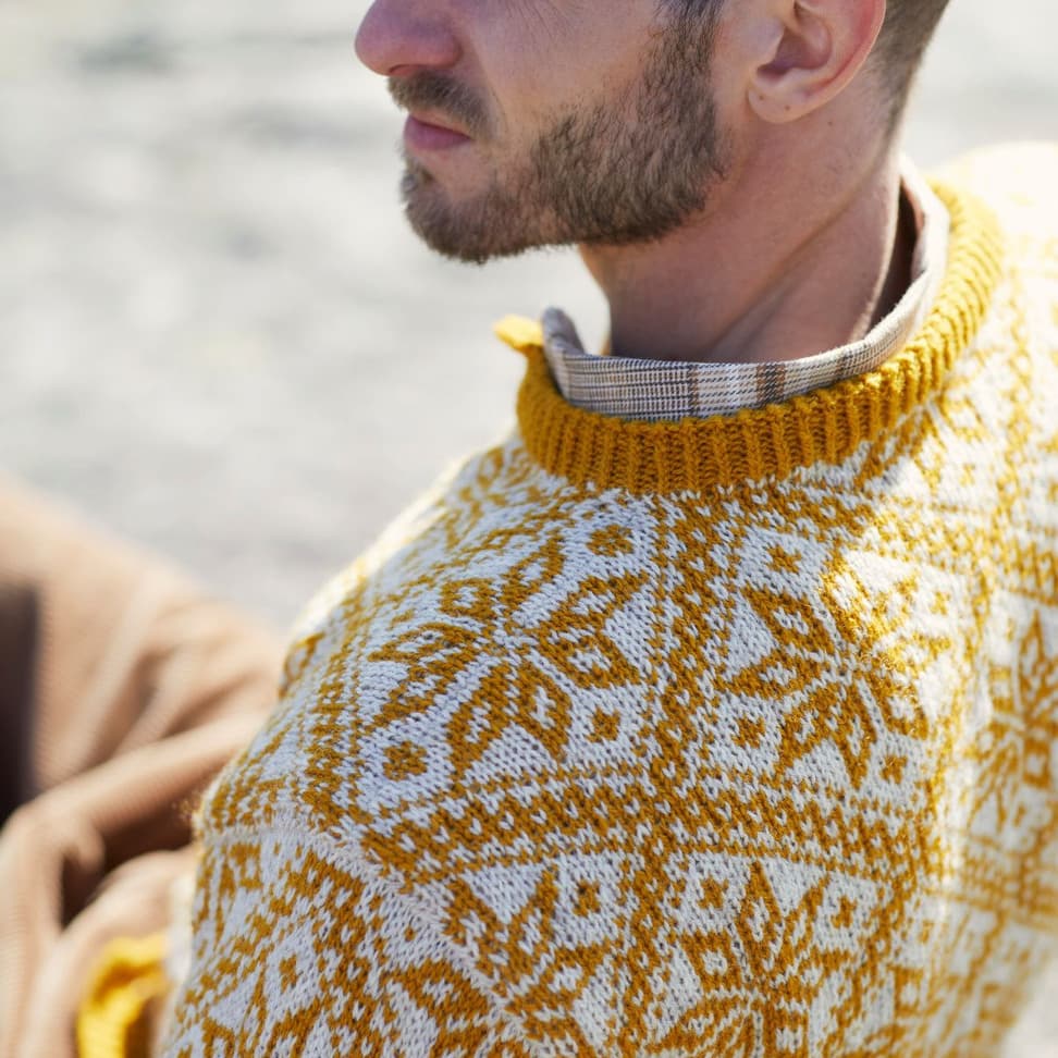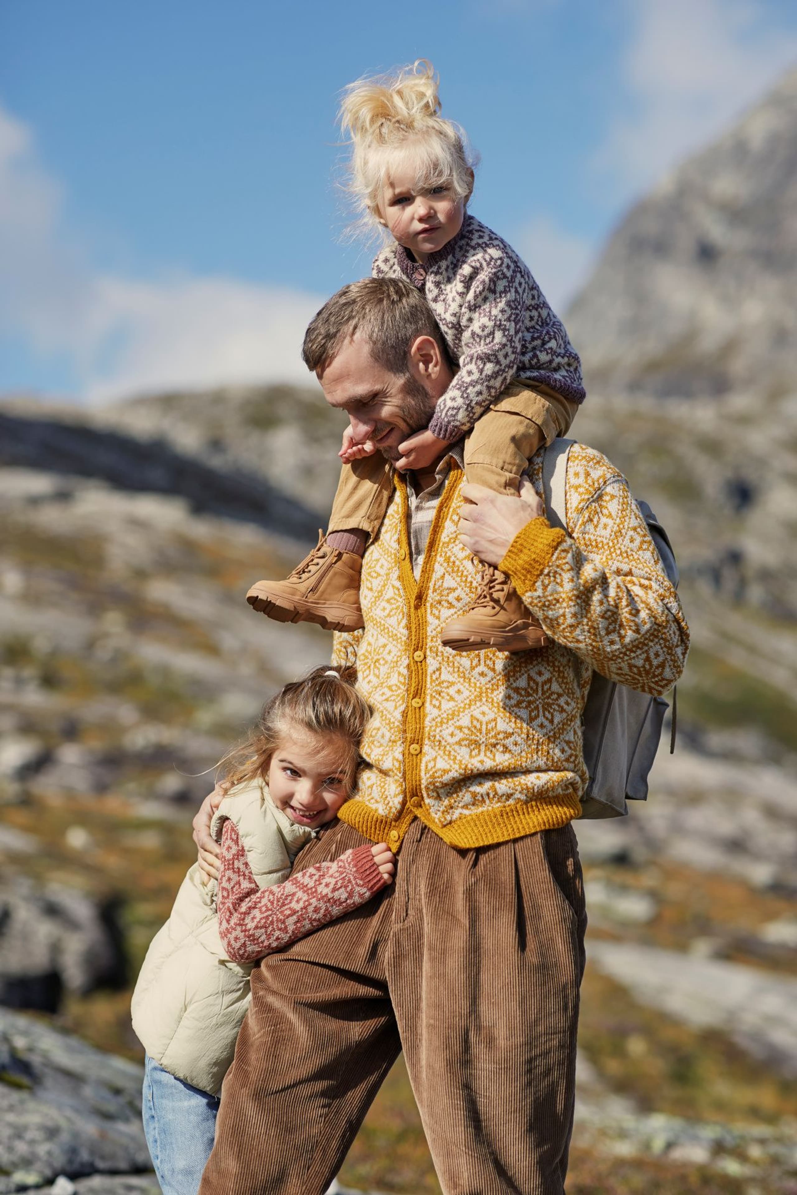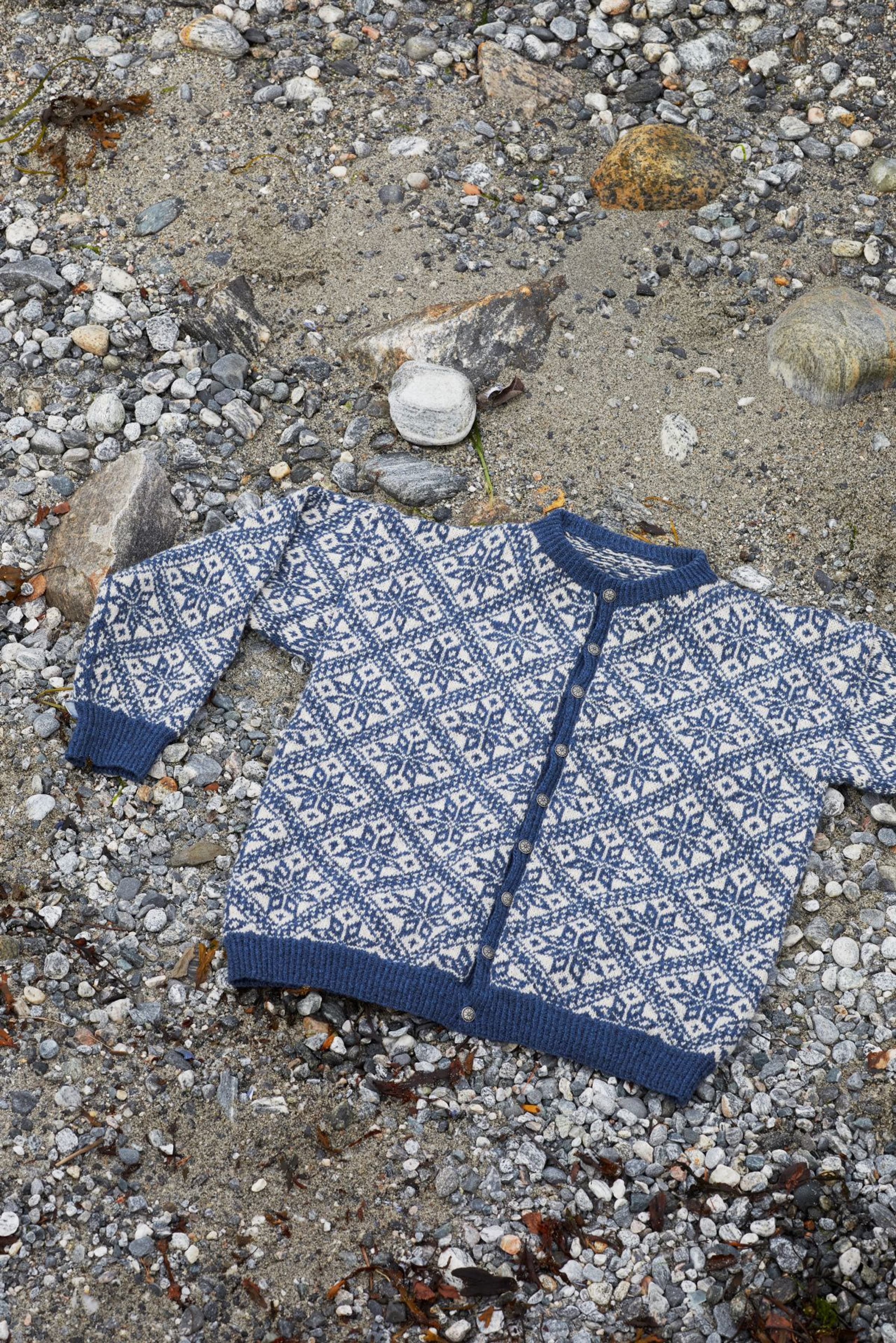 Fjelljakken er et design fra arkivet på Rauma Ullvarefabrikk. Den har et vakkert mønster med store mønsterrapporter. Originaloppskriften fantes bare i 1 størrelse, men vi har gradert jakken i flere størrelser. På grunn av de store mønsterrapportene har vi gradert ved å variere strikkefastheten istedenfor masketallet. Sjekk din størrelse og vær nøye med å sjekke strikkefastheten din! Jakken strikkes rundt nedenfra og opp. Den sys og klippes opp foran, til ermehull og halsutringning. Vrangbordene strikkes med vridde rette masker for et mer definert uttrykk. Jakken er konstruert slik at mønsteret på for- og bakstykke passer i hverandre oppå skulderen, og mønsteret på ermet passer inn i mønsteret i ermeåpningen.