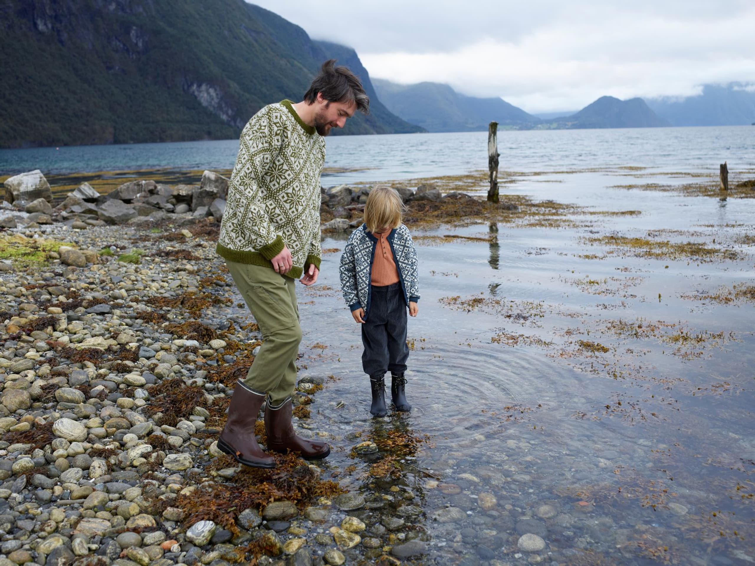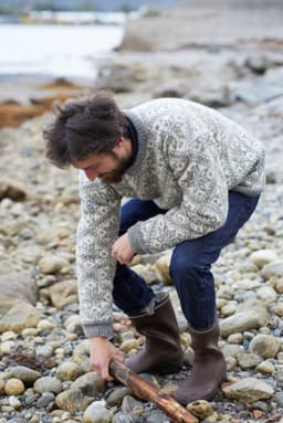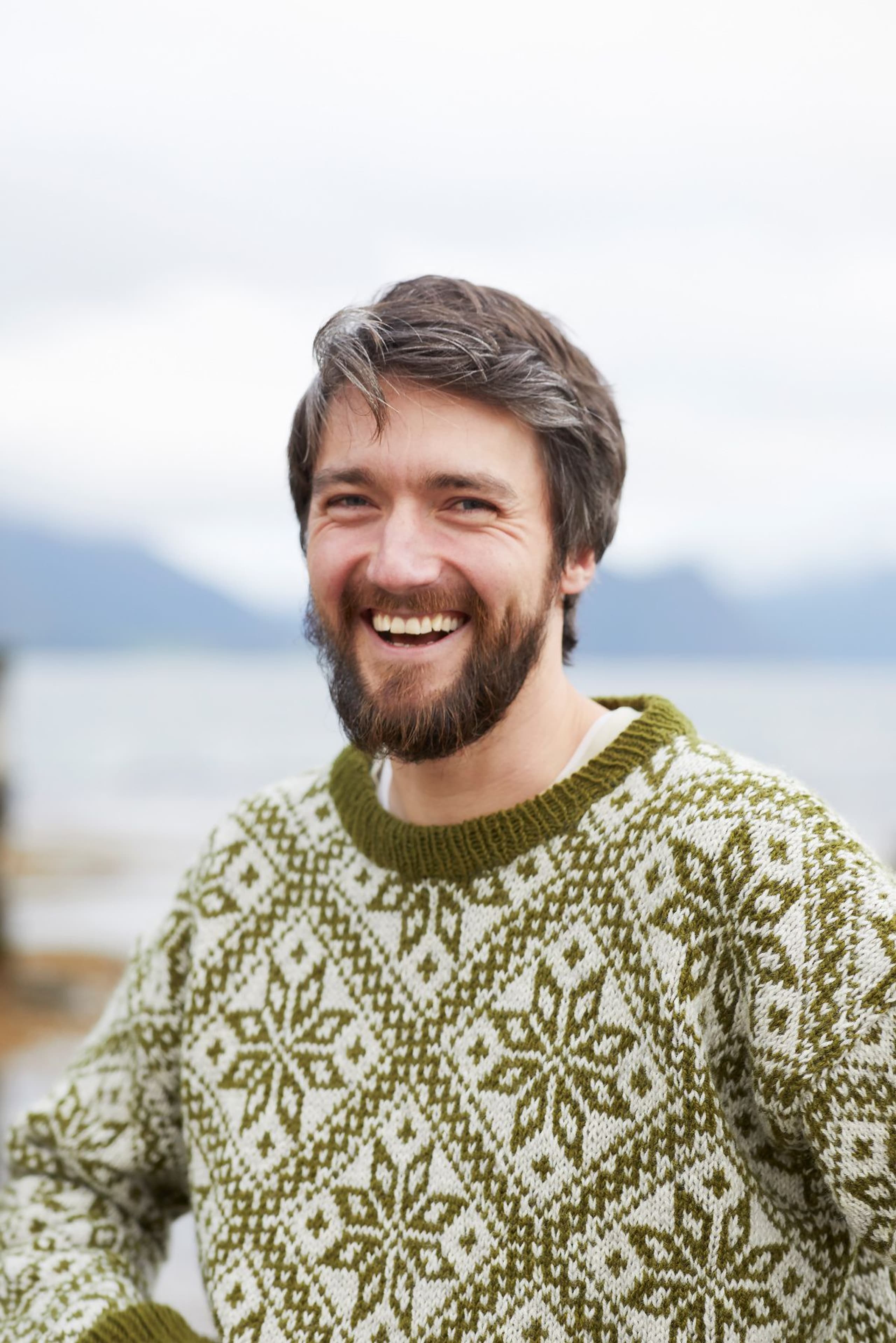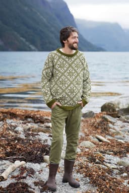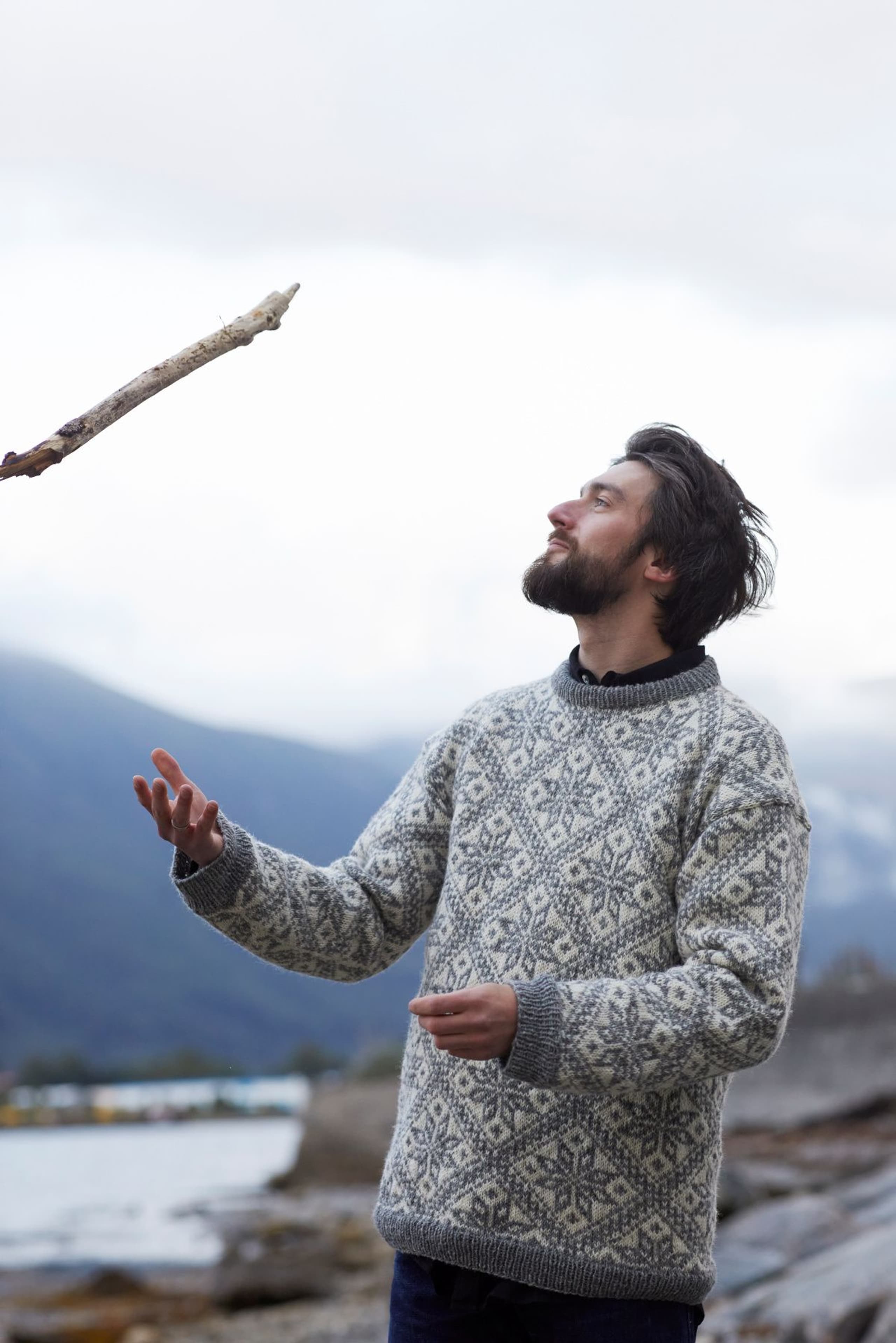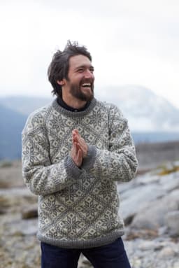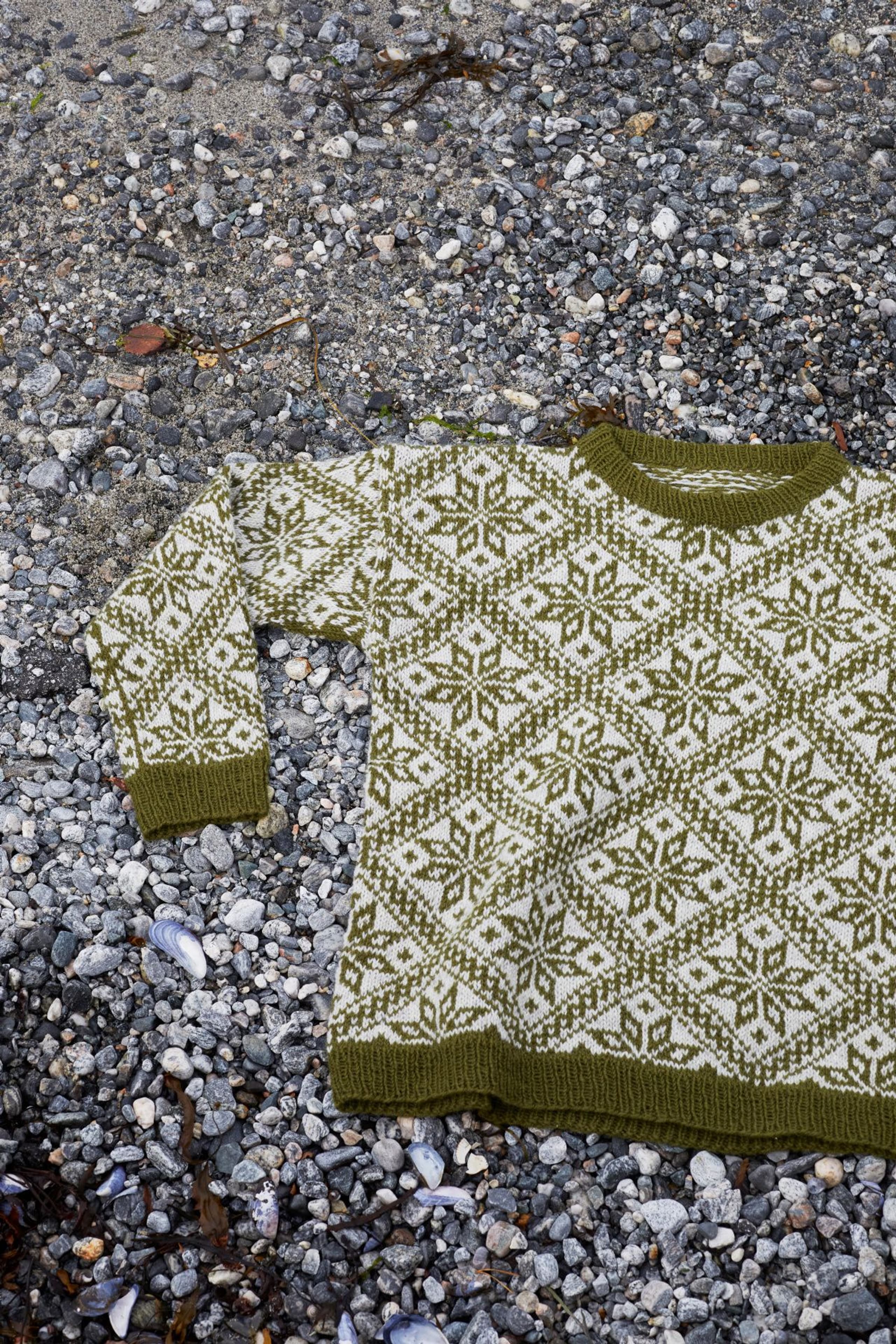 Storefjellgenseren har et vakkert mønster hentet fra arkivet på Rauma Ullvarefabrikk. På grunn av de store mønsterrapportene har vi gradert ved å variere strikkefasthet istedenfor masketallet. Sjekk din størrelse og vær nøye med å sjekke strikkefastheten din! Om du ikke finner ønsket størrelse, ta en titt på 405-3 Fjellgenser. Genseren strikkes rundt, nedenfra og opp. Den klippes opp til ermehull og halsutringning. Genseren er konstruert slik at mønsteret på for- og bakstykket passer i hverandre oppå skulderen, og mønsteret på toppen av ermet passer inn i mønsteret i ermeåpningen.