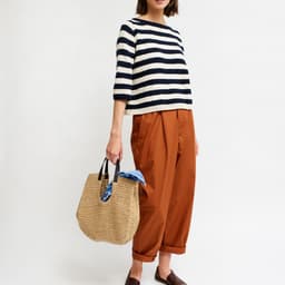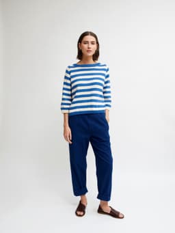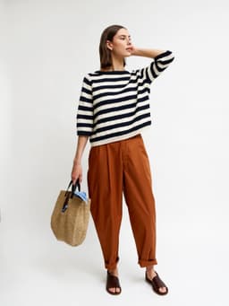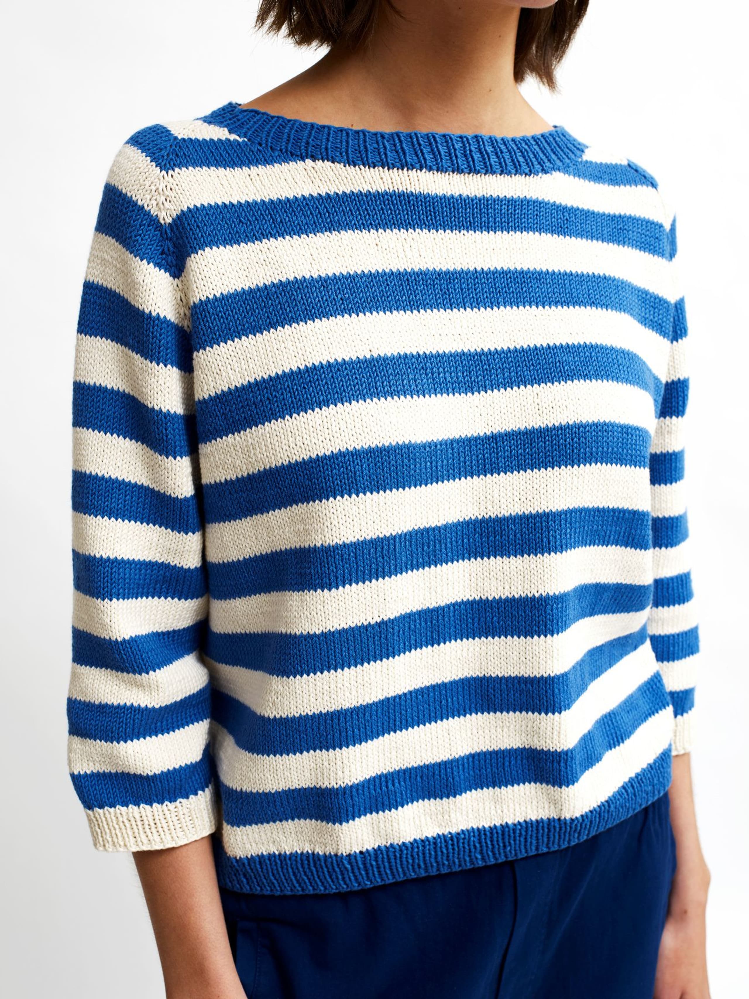 Skjærgårdsgenseren er en romslig raglangenser med striper og ¾-lange ermer. Genseren strikkes ovenfra og ned i glattstrikk og med ribbestrikkede kanter. For å få en romslig fasong, velg en størrelse som har en brystvidde som er 12-18 cm større enn din egen.