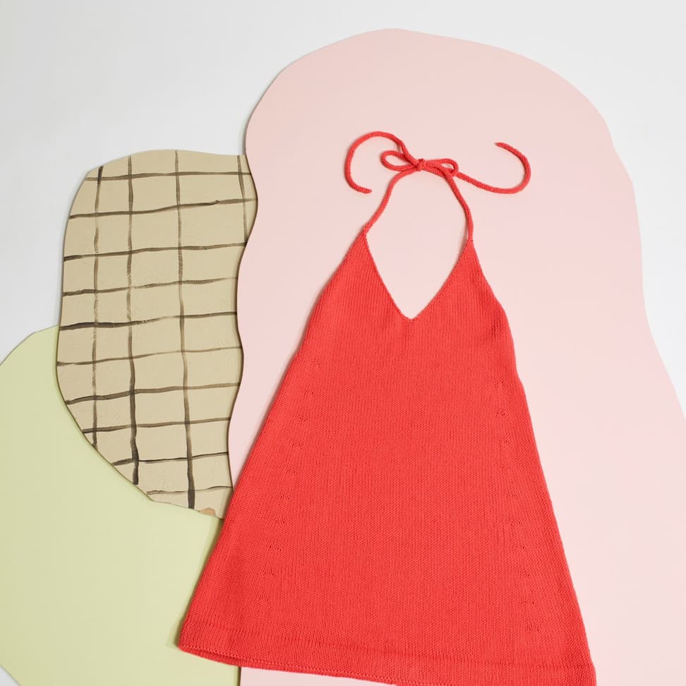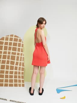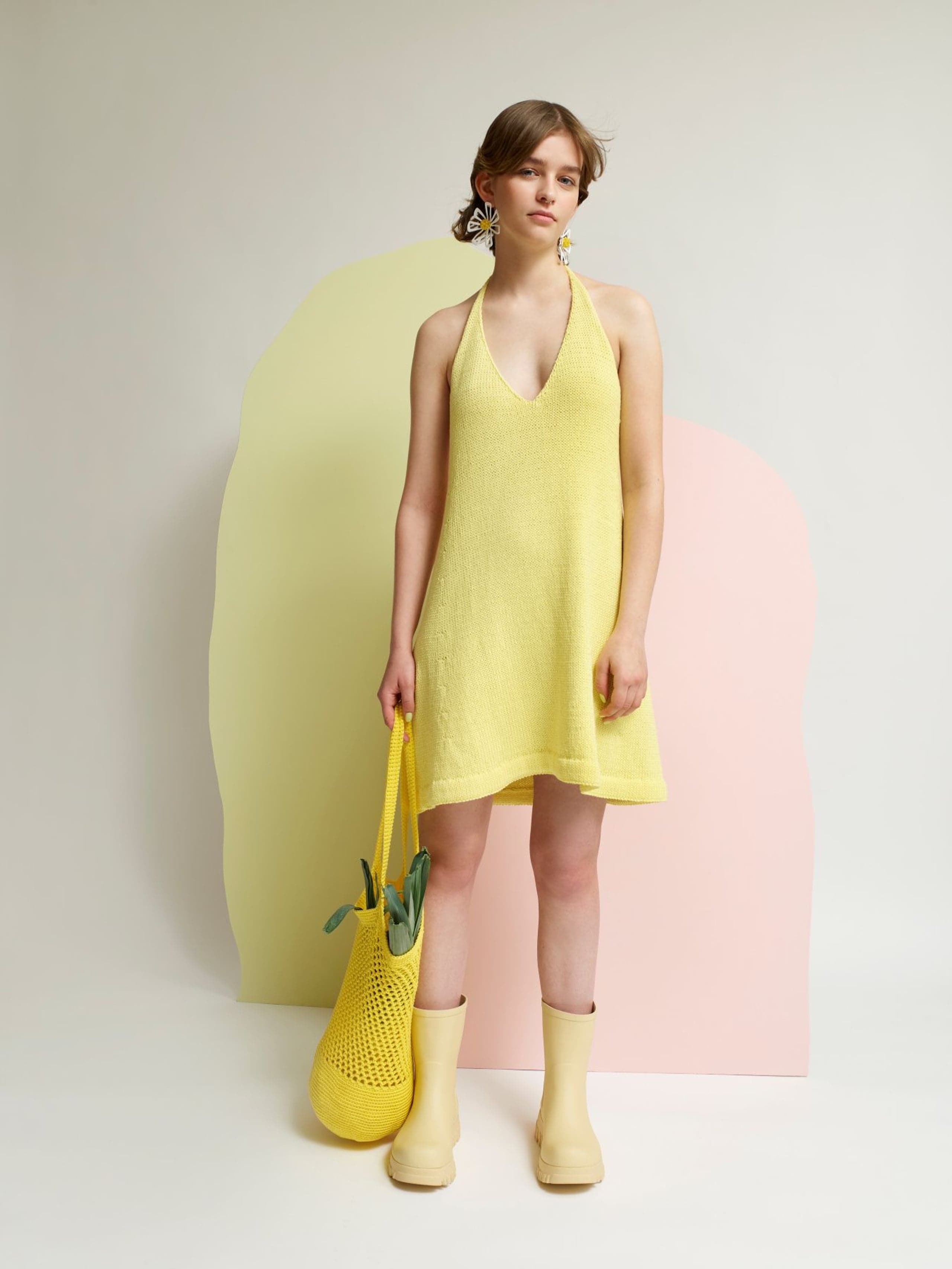 Svale solkjole er en glattstrikket, kort kjole med knyting i nakken og åpen rygg. Den strikkes ovenfra og ned. Først strikkes stroppene i I-cord. Videre strikkes brystdelene hver for seg, frem og tilbake. Så settes delene inn på samme pinne og resten av kjolen strikkes rundt med økninger til skjørtet. I ryggen strikkes et parti med ribbestrikk. Kanten nederst på kjolen brettes inn mot vrangen. Velg en størrelse som har en brystvidde som er noen cm mindre enn brystvidden din. Husk at det oppgitte målet i oppskriften vil havne like under bysten – der kroppen er smalere.