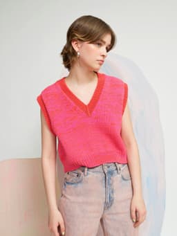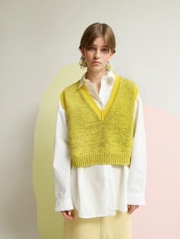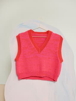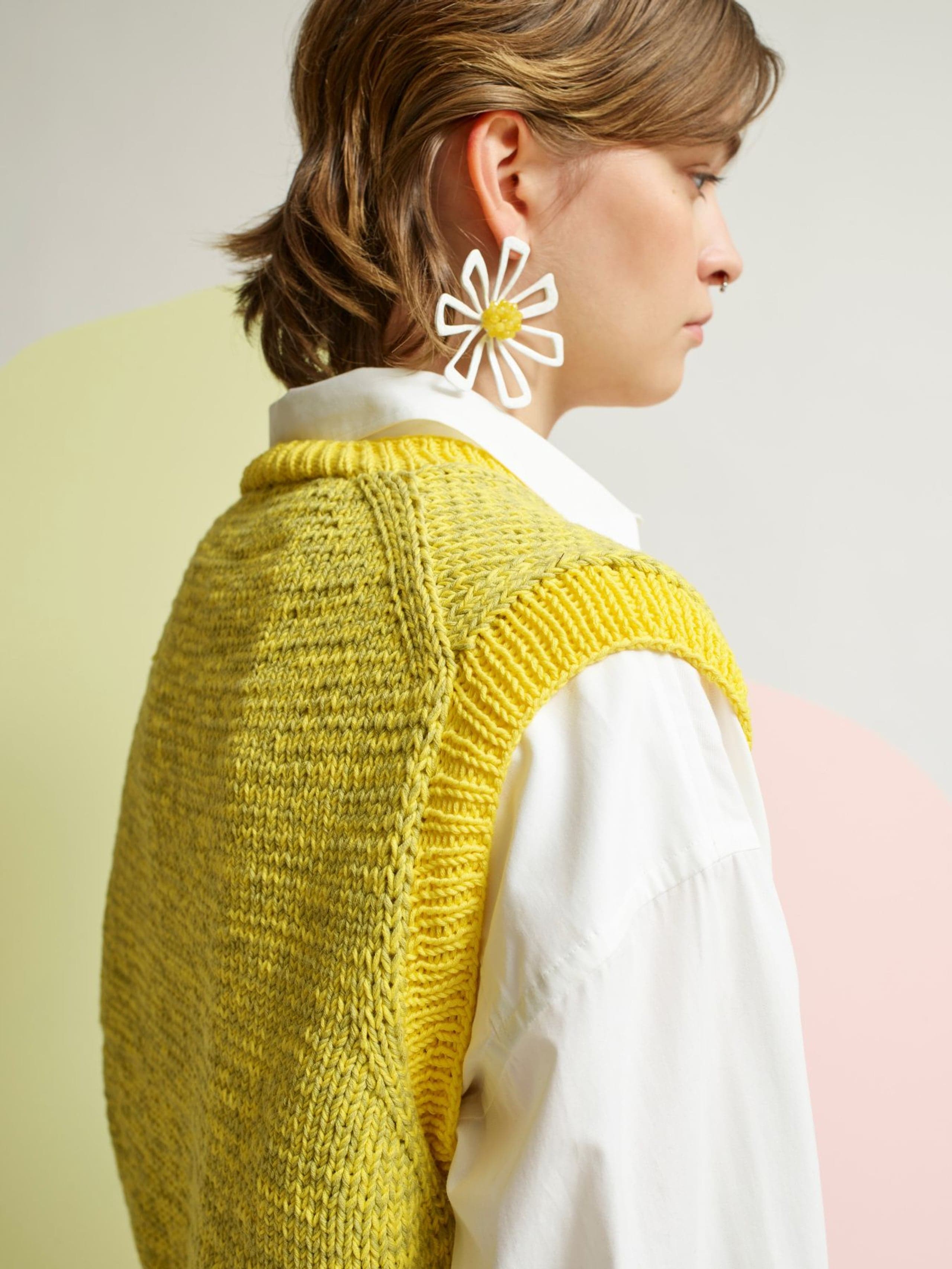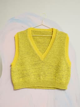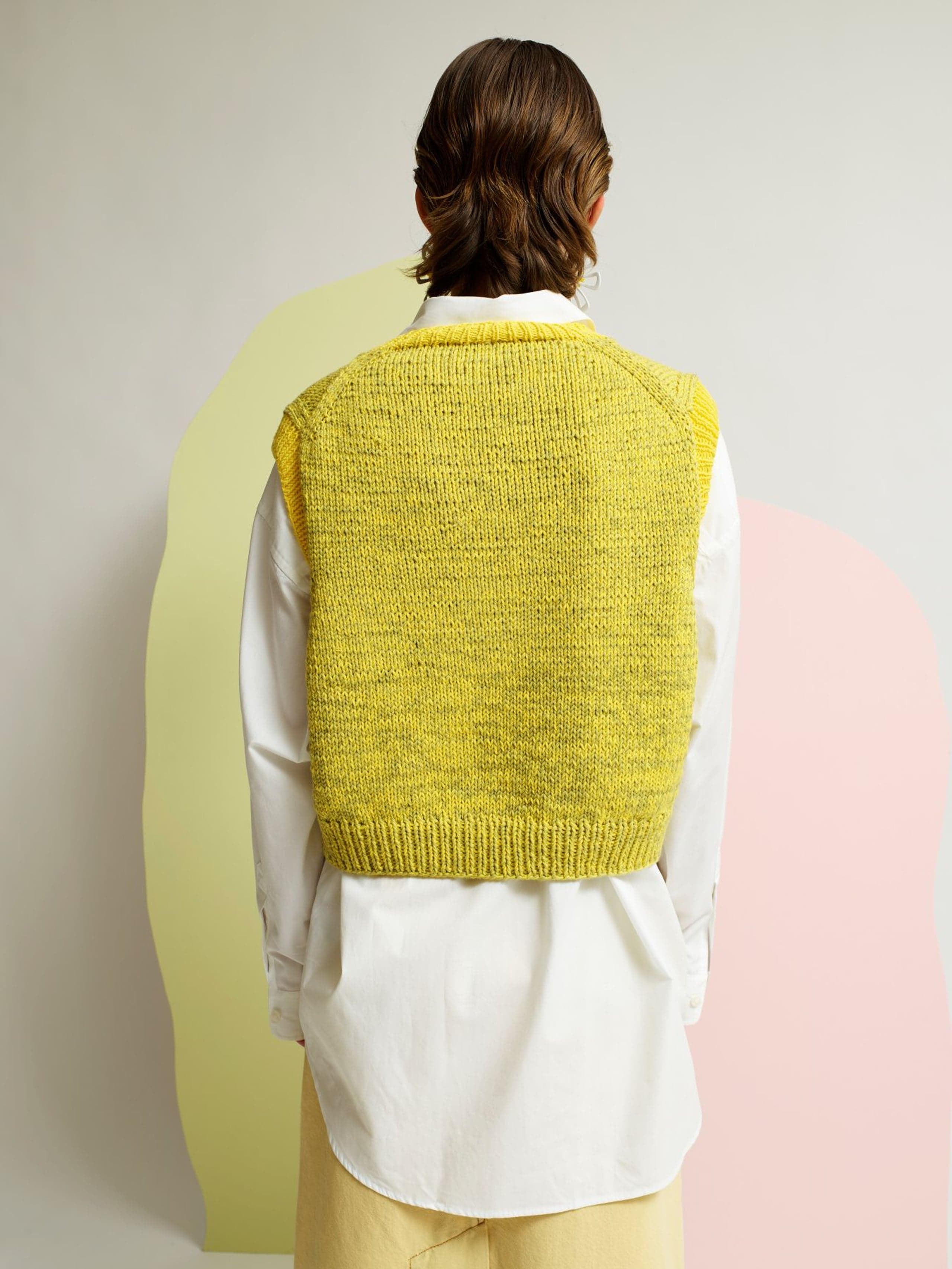 Dandelion vest er en kort og vid vest med dyp v-hals og skrå skuldre. Passformen er rett og romslig, og den strikkes ovenfra og ned i dobbelt garn. Først strikkes bakstykket frem og tilbake og det økes til skrå skuldre. Deretter strikkes masker opp langs skuldrene og hvert forstykke strikkes for seg med økninger til v-hals. Under armene samles maskene på samme pinne, bolen strikkes rundt og avsluttes med en vrangbord. Halskant og ermehullkanter plukkes opp til slutt og strikkes i vrangbord med enkel tråd. For å få en romslig fasong, velg en størrelse som har en brystvidde som er 12-18 cm større enn din egen.