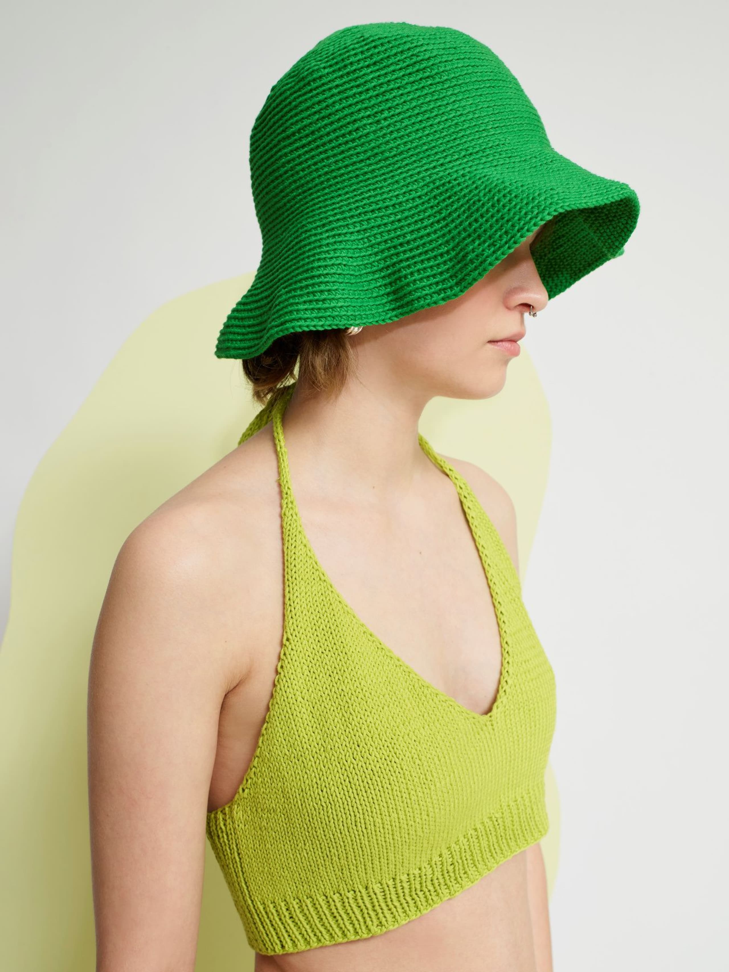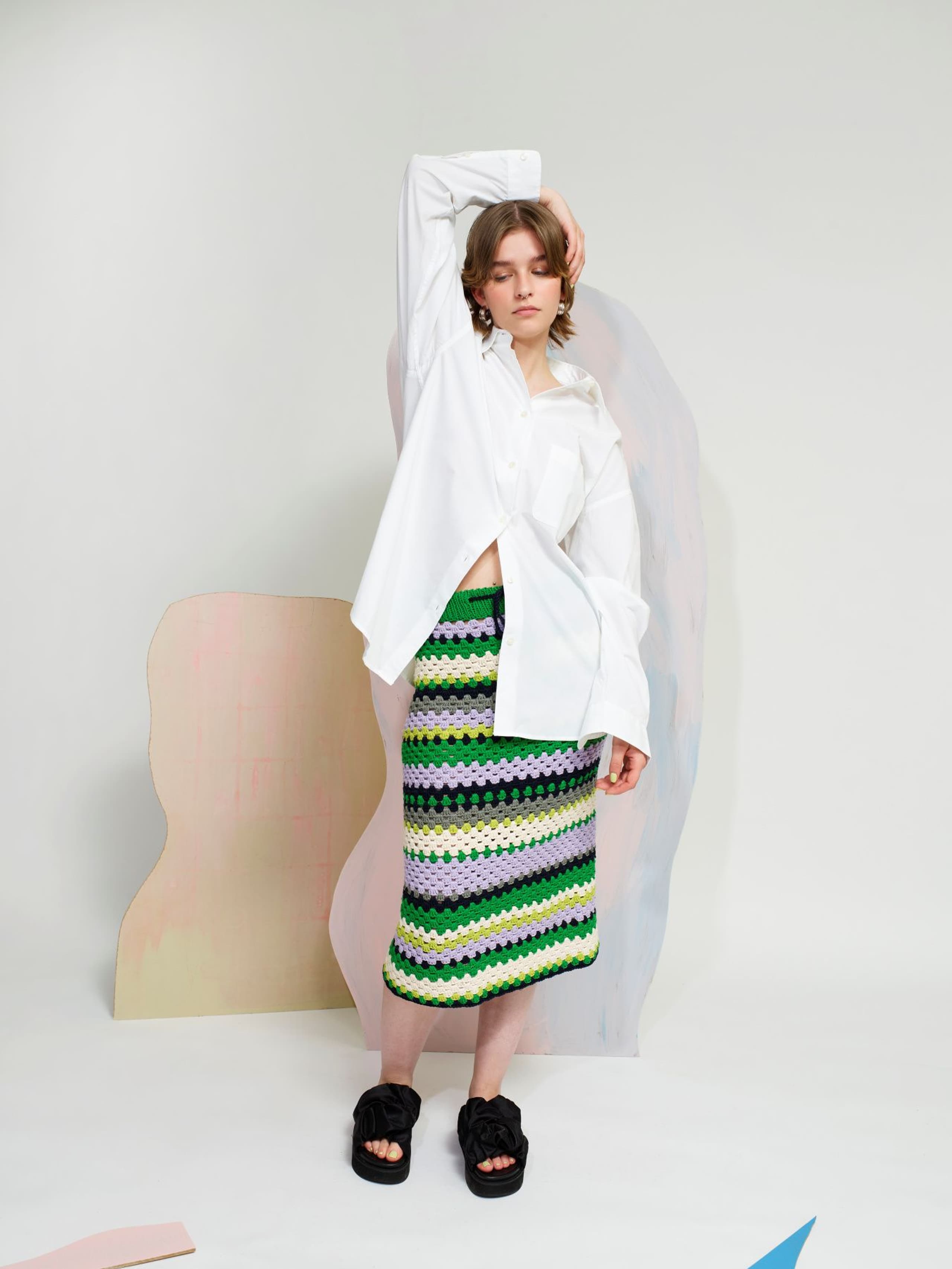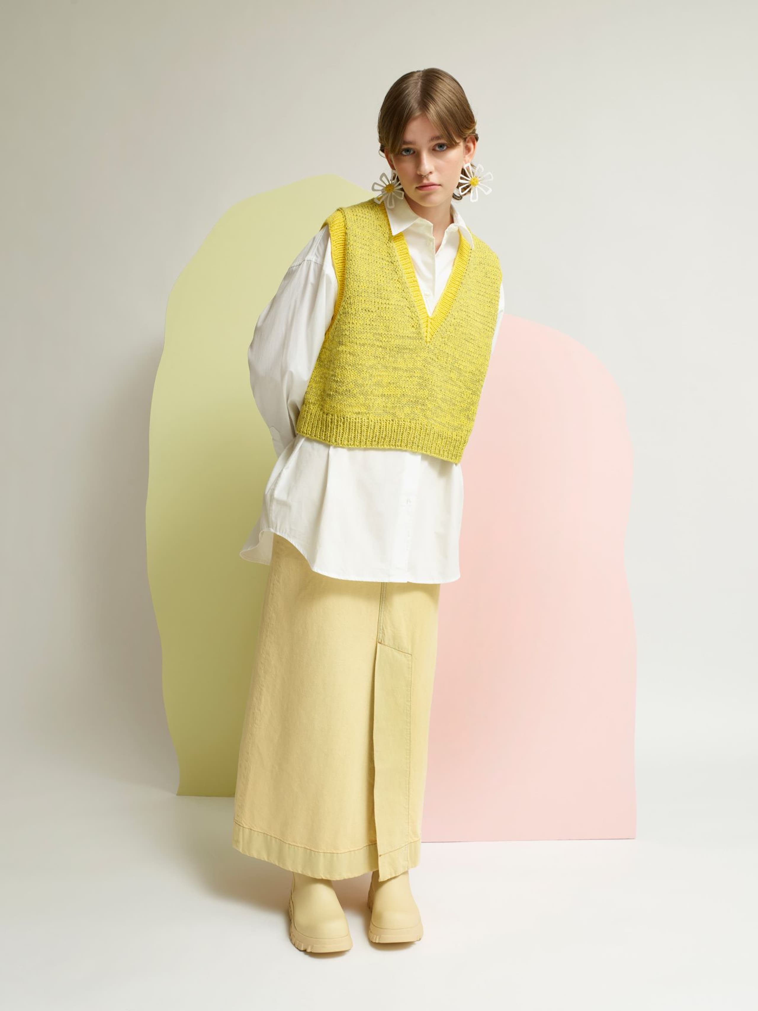 Svale sommerskjørt er et glattstrikket skjørt med høyt liv og brettekant i linningen. Skjørtet har en kroppsnær, rett fasong, med økninger i hver side over hoftene og ribbekant nederst. Livet tilpasses med en bred strikk som tres i til slutt. Skjørtet strikkes ovenfra og ned, så lengden kan enkelt justeres underveis i arbeidet. I oppskriften beskrives to lengder; et kort miniskjørt og et langt skjørt som rekker til midt på leggen. For å få en kroppsnær fasong, velg en størrelse som har en stussvidde som er 2-8 cm større enn din egen stussvidde.