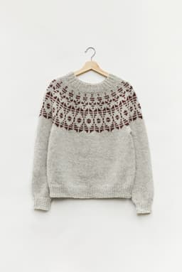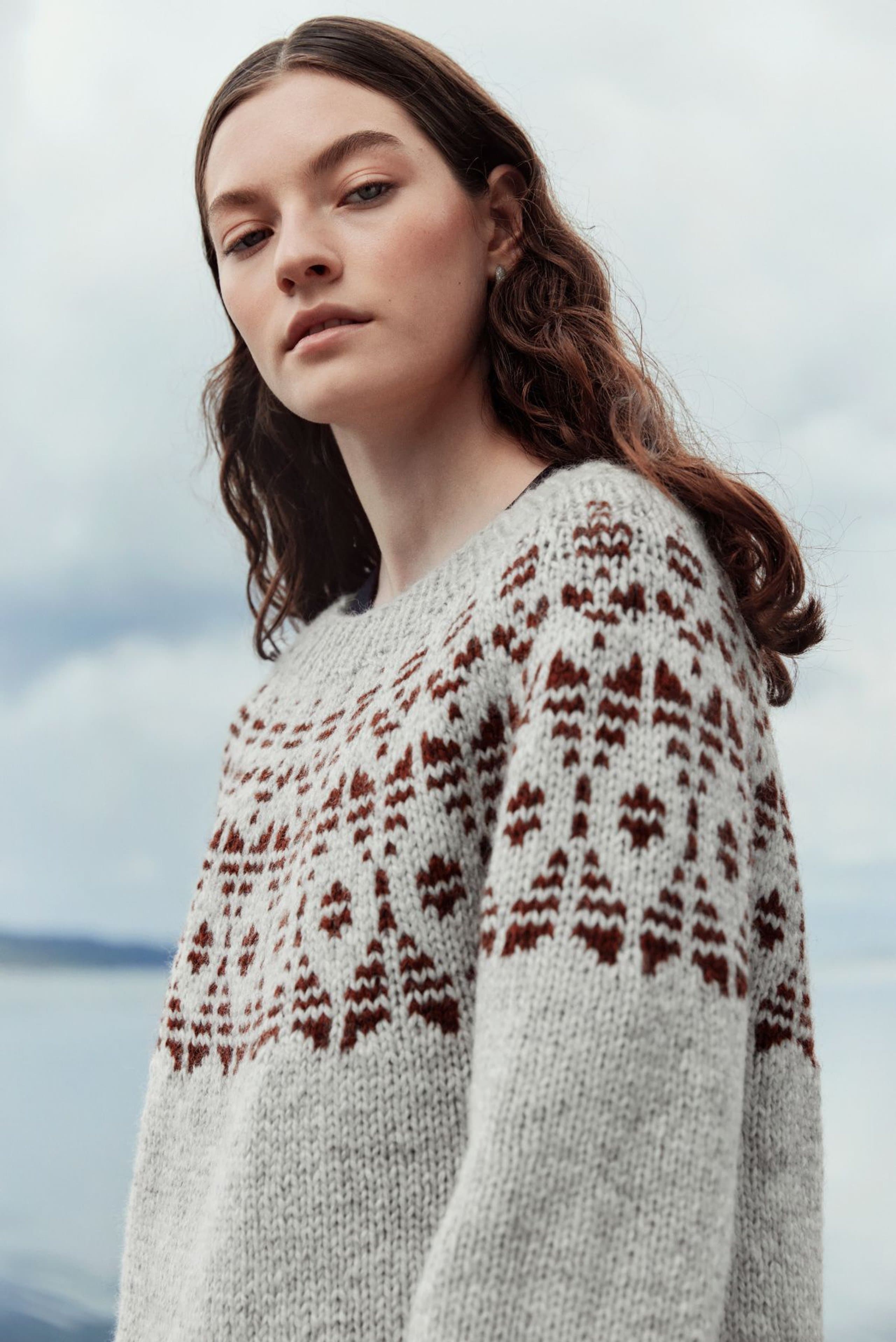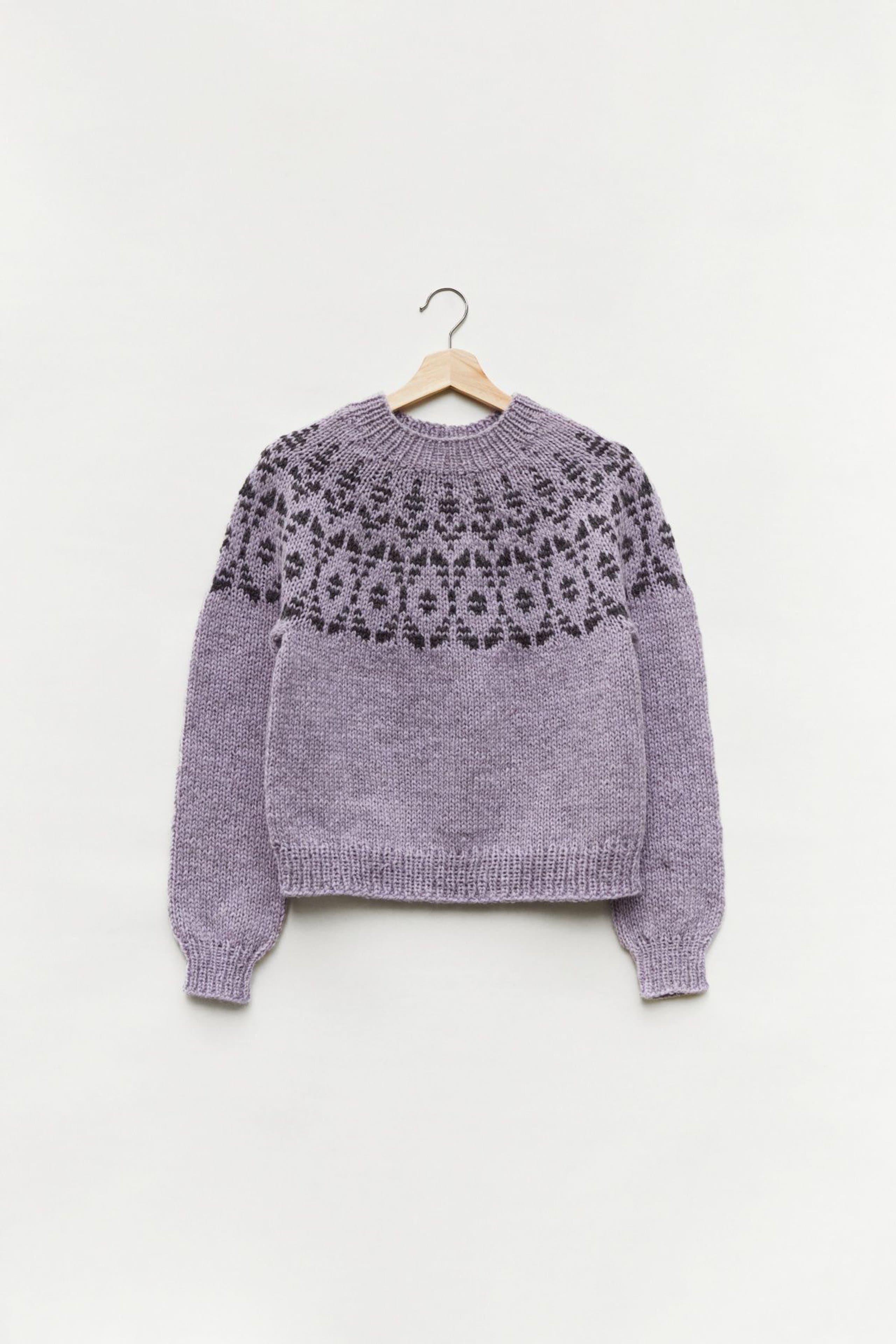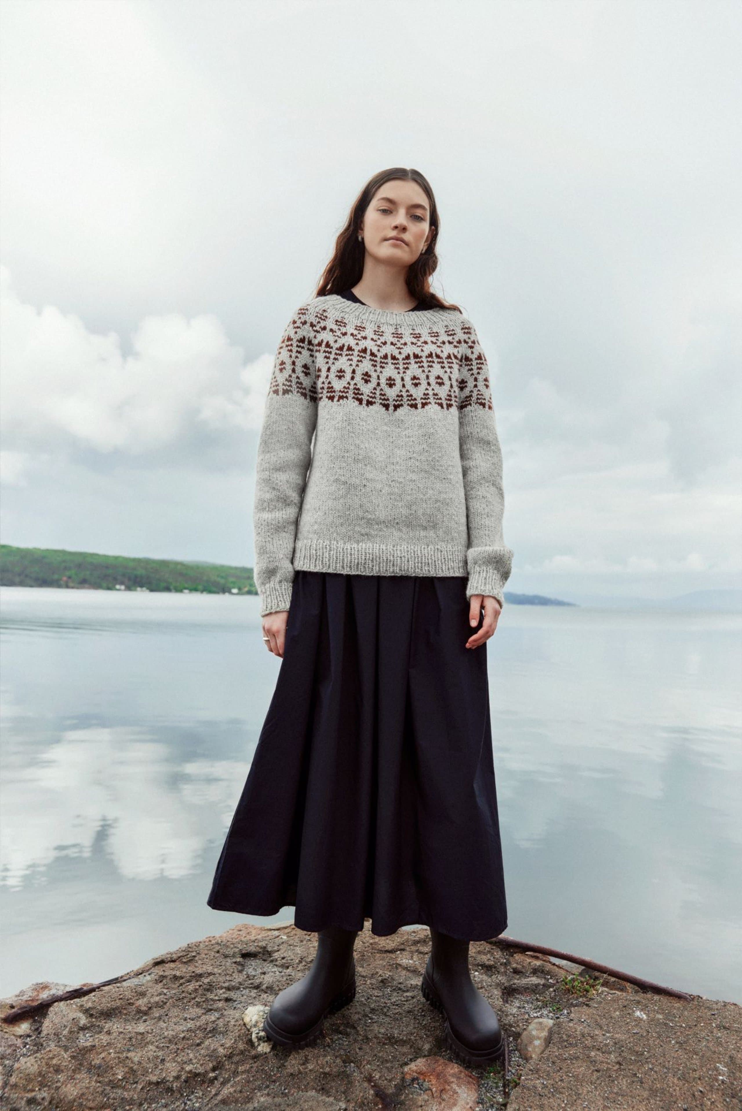 Høstlynggenseren er en glattstrikket genser med rundt mønstret bærestykke. Den har en rett og ledig passform med rund hals og ribbestrikkede kanter. Genseren strikkes ovenfra og ned. Halsringningen formes ved å strikke vendepinner. I mønsteret er nesten annenhver omg ensfarget hvilket gjør at du kan slippe konsentrasjonen for en stund. For å få en ledig passform, velg en størrelse som har en brystvidde som er 10-18 cm større enn din egen.