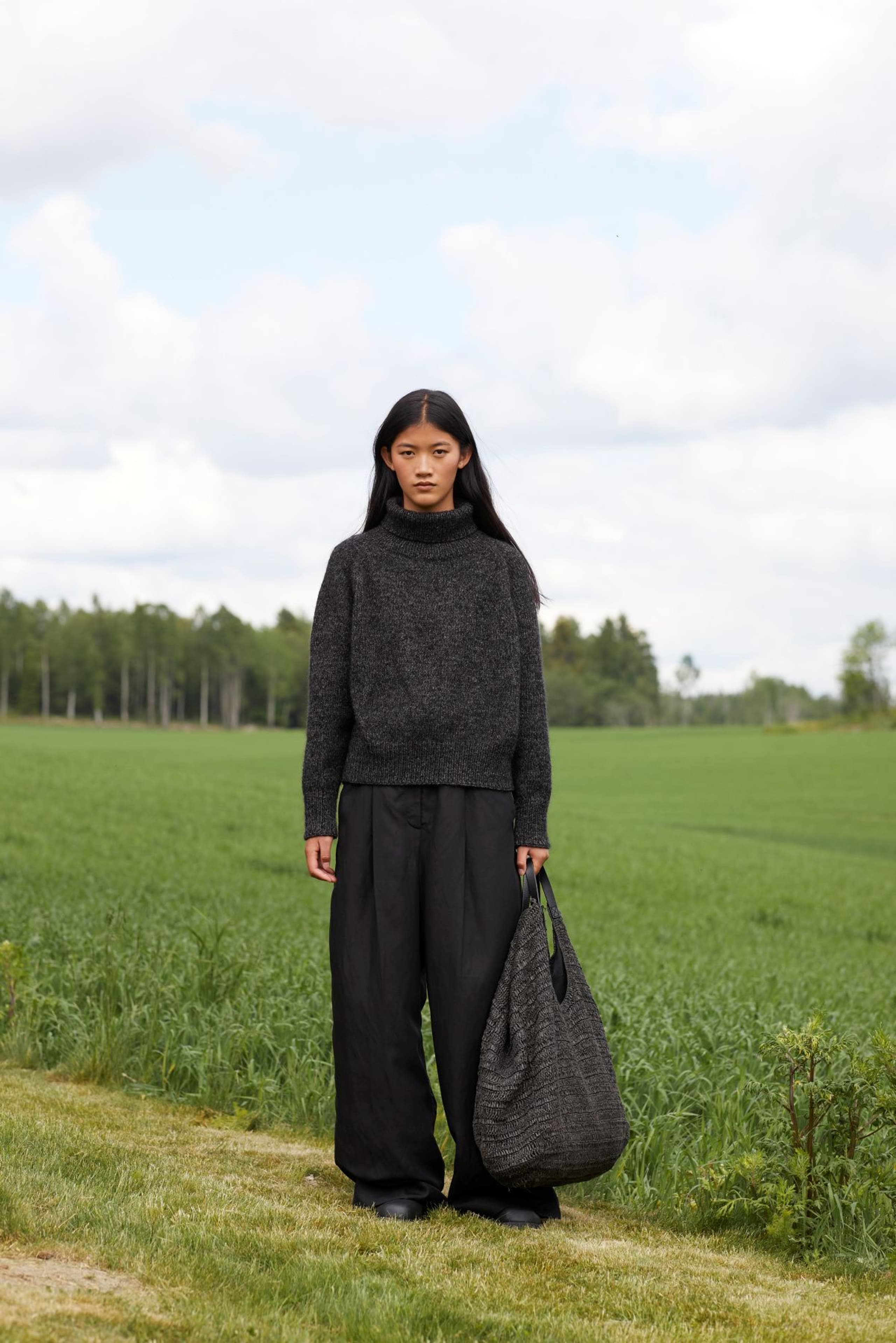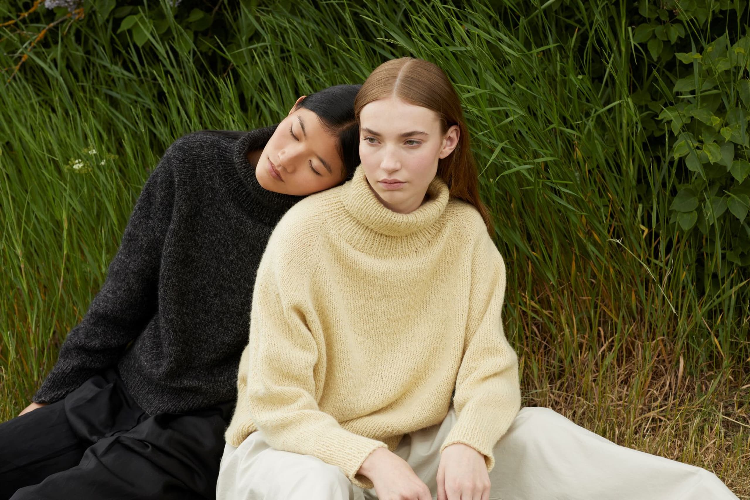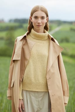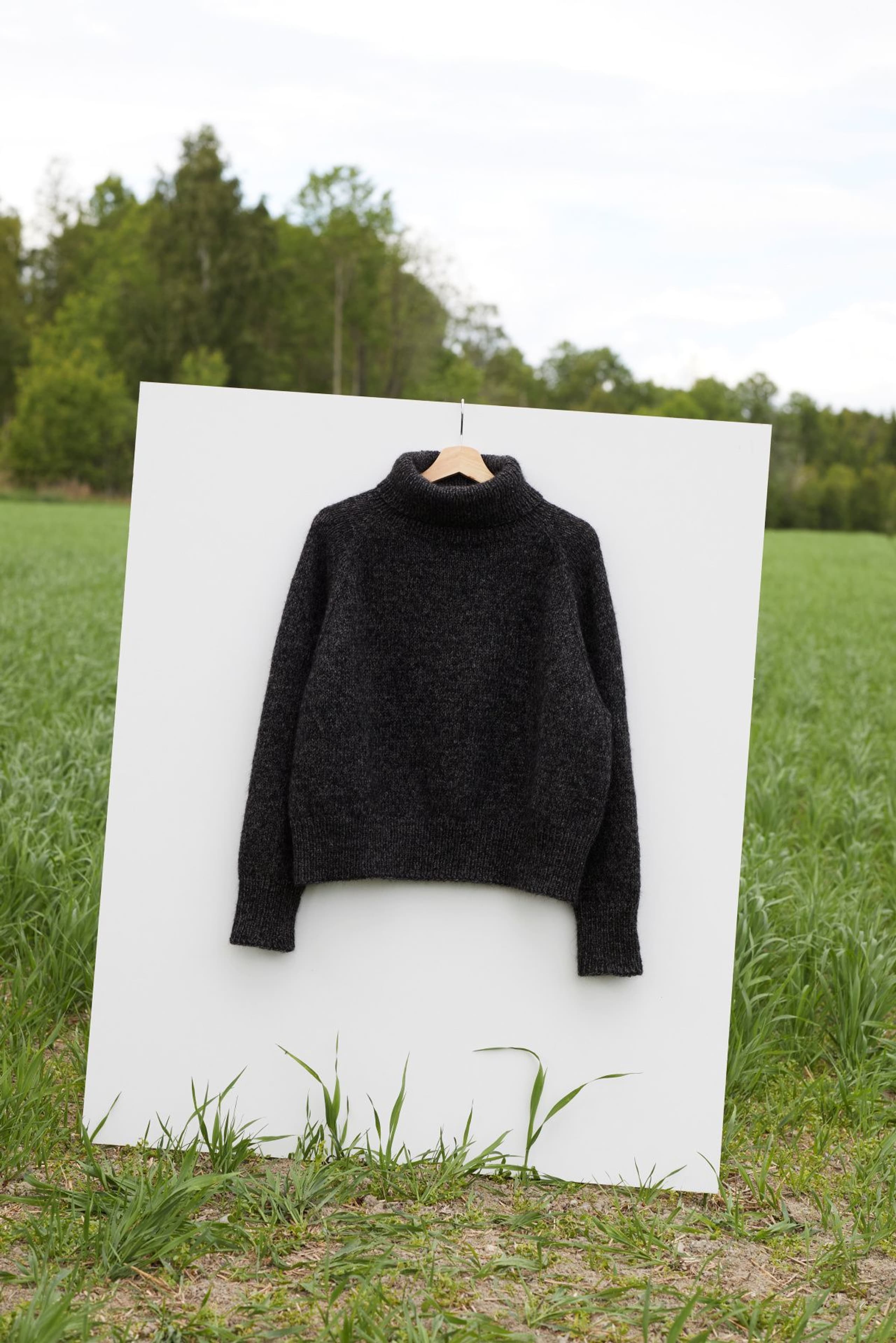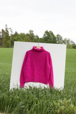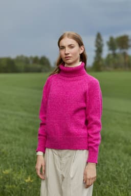 Sesam raglangenser er en oversized, glattstrikket raglangenser med høy hals. Den er kort og rett med lange ribbekanter. Genseren strikkes ovenfra og ned med 1 tråd Finull og 1 tråd Alpaca Silk. Halsringningen formes ved å strikke vendepinner og det økes til raglan på hver side av 3 glattstrikkede m. For å få en oversized passform, velg en størrelse som har en brystvidde som er 20-28 cm større enn din egen.