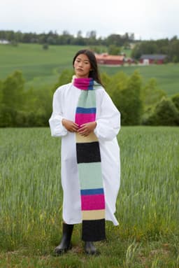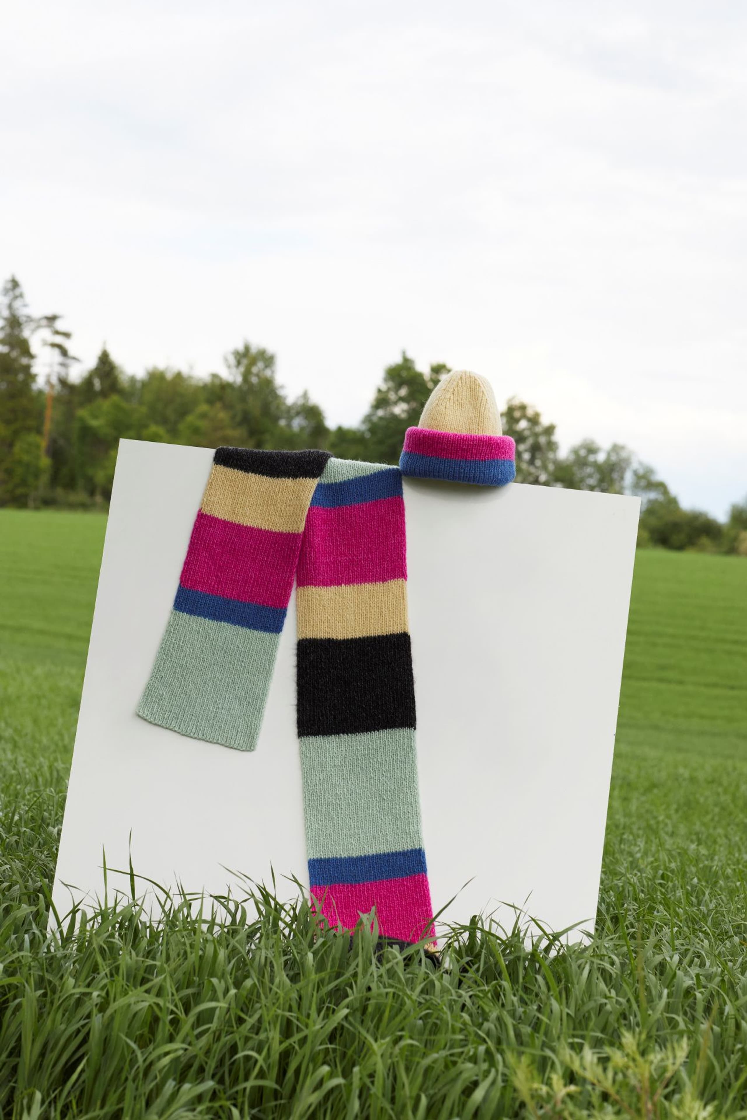 Felice ribbeskjerf strikkes i striper i fem farger med 1 tråd Finull og 1 tråd Alpaca Silk. Det er langt og kan snurres både en og to ganger rundt halsen.