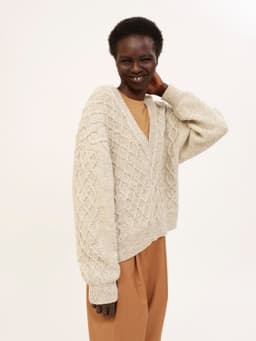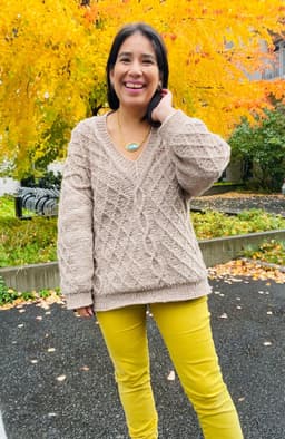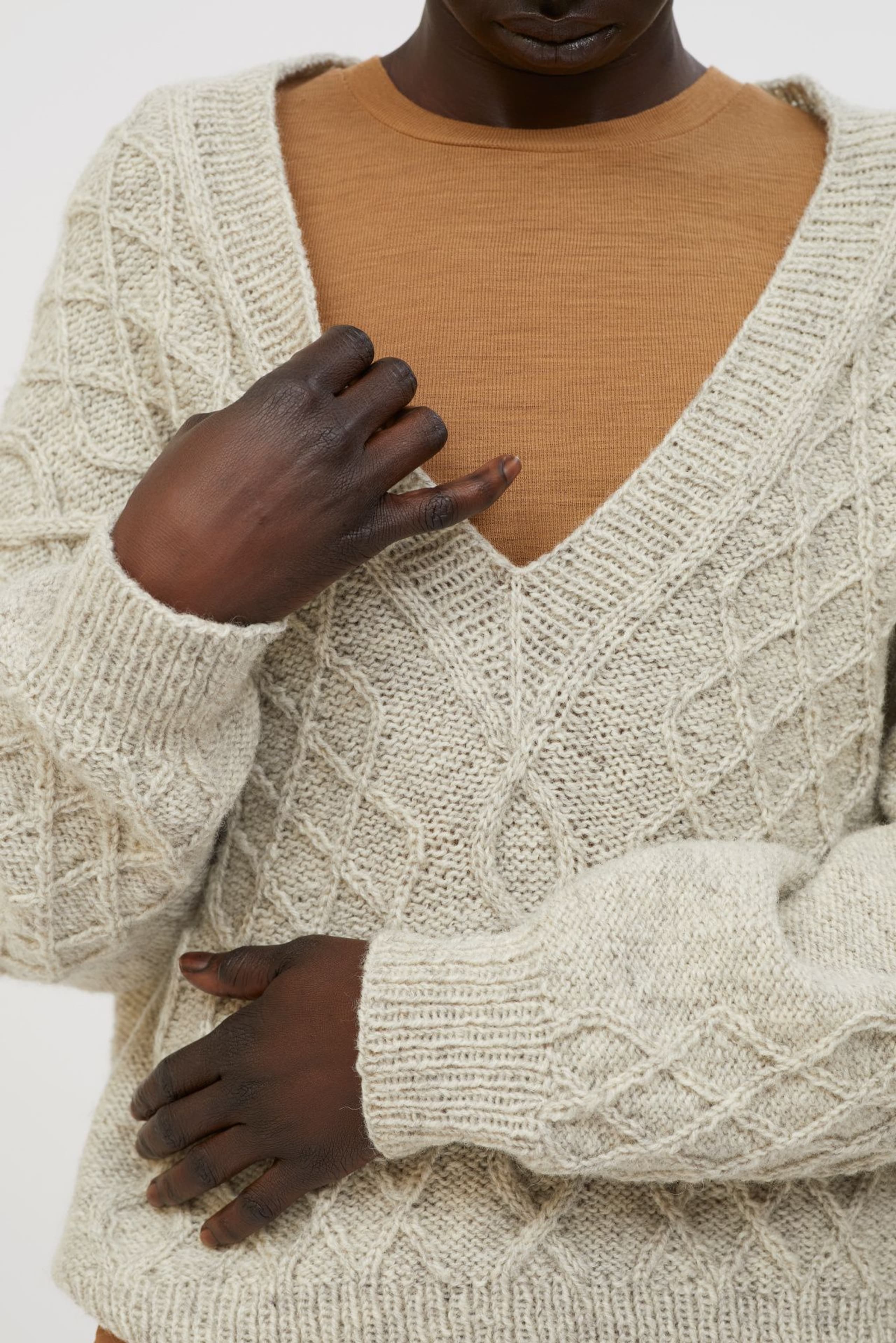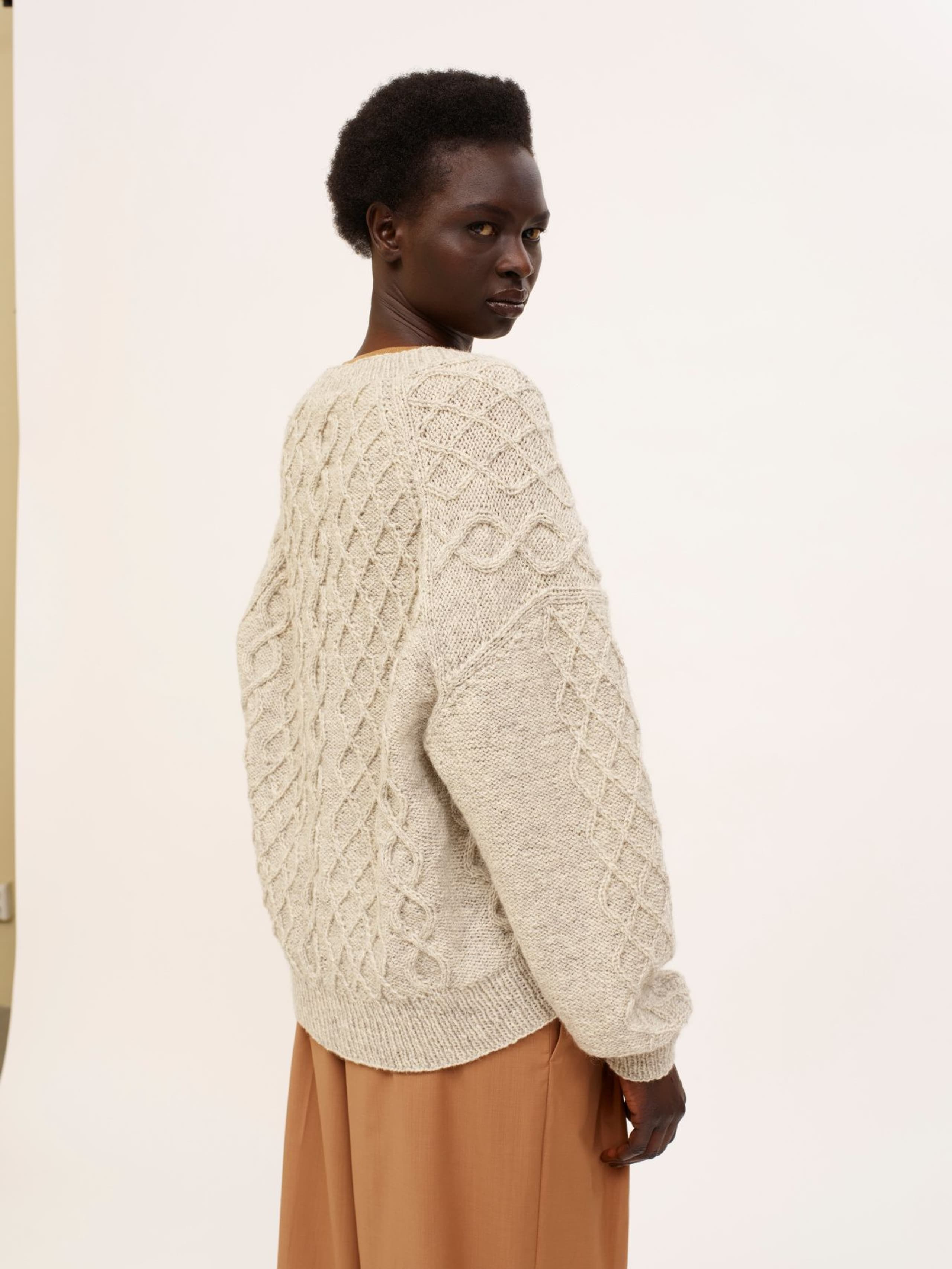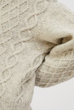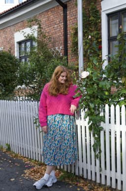 Genseren strikkes ovenfra og ned. Først strikkes bakstykket frem og tilbake med økninger til skuldrene. Så plukker man opp m langs skulderen og strikker den ene siden av forstykket frem og tilbake mens man øker til v-hals. Så strikker man den andre siden av forstykket på samme måte før alle delene settes inn på samme p og arbeidet fortsetter rundt. Hele genseren strikkes med flettemønster. Masker til ermene plukkes opp rundt ermehullet og ermet strikkes nedover. Ermetoppen formes med vendepinner. Fremstrikkerne kan ha gjort egne justeringer på plaggene de har strikket som å forkorte eller forlenge ermer og bol. **Kjøp magasinet uten garn her:** [422 Fremstrikk magasin](https://www.raumagarn.no/produkt/tilbehor/fremstrikk-2)