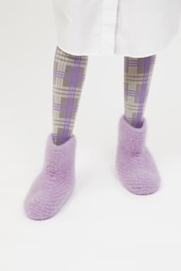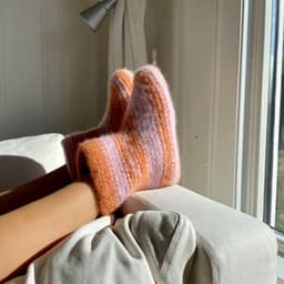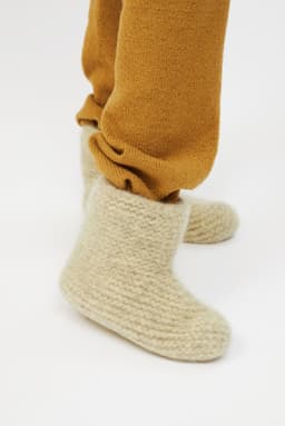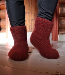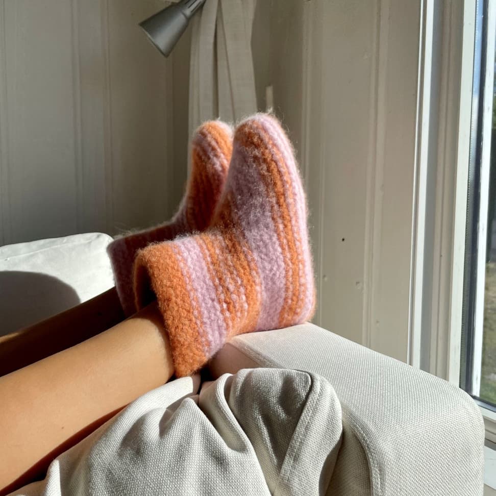 Disse tovede tøflene er høye, tykke og varme. Med sitt brede skaft, er de lette å kippe av og på selv om de er høye. Tøflene strikkes med dobbelt garn i rillestrikk, frem og tilbake, nedenfra og opp. Oppleggskanten er midt under, og avfellingen er toppen av tøffelen. Det felles midt i arbeidet for å skape formen midt oppå foten, før man fortsetter oppover til ønsket høyde. Tøflene maskes sammen midt under og sys sammen midt bak. Siden toves tøflene i vaskemaskin. Bruk gjerne opp restegarn i disse deilige tøflene! **Kjøp magasinet uten garn her:** [422 Fremstrikk magasin](https://www.raumagarn.no/produkt/tilbehor/fremstrikk-2)