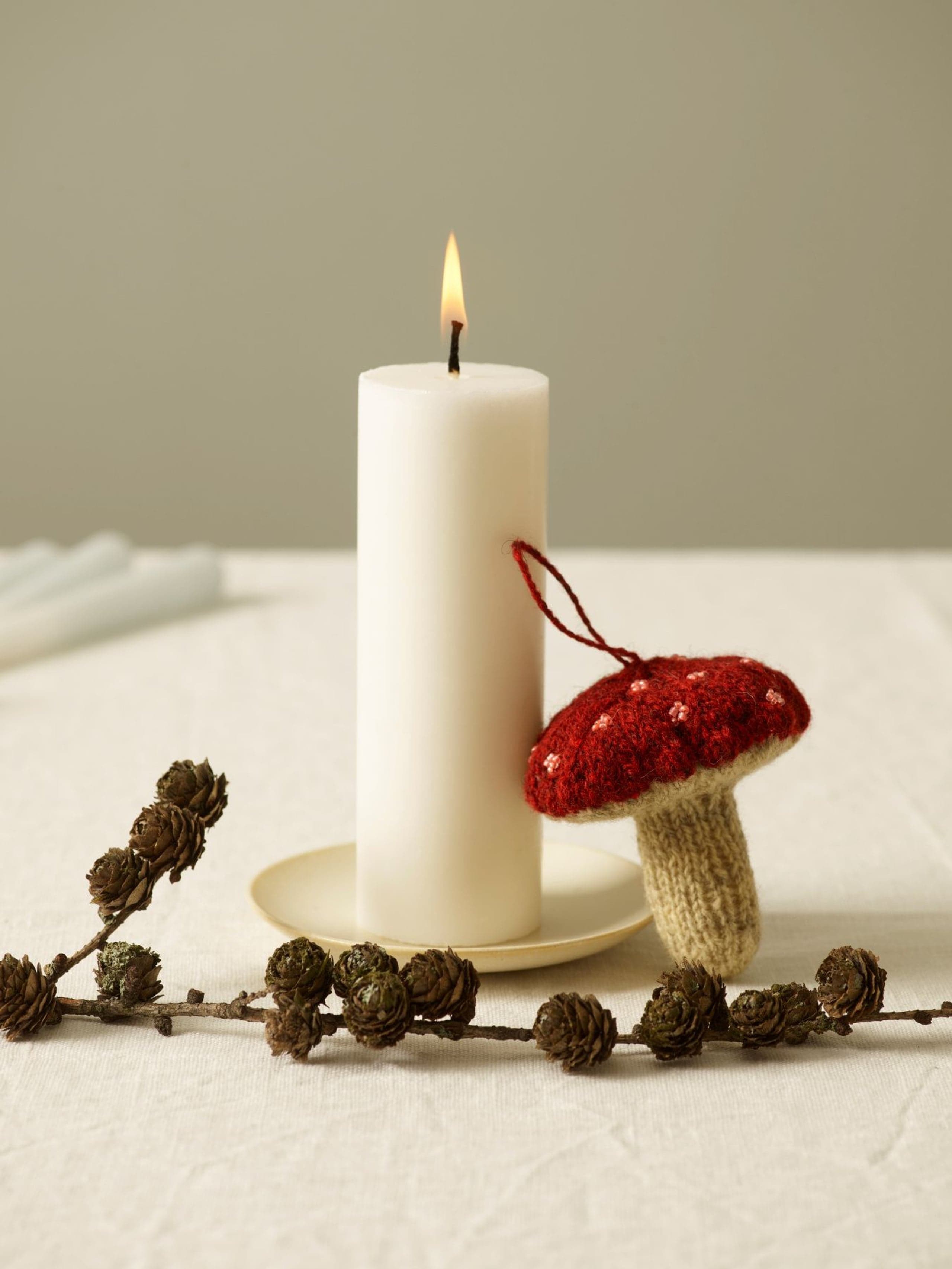 Soppen strikkes samme vei som den gror – nedenfra og opp. Den kan gjerne dekoreres med «fluer» av glassperler. Soppen gjør seg bra på juletreet eller i en julegren. Eller hva med en uro med sopper og eikeblader? Soppen fylles med ullflor.