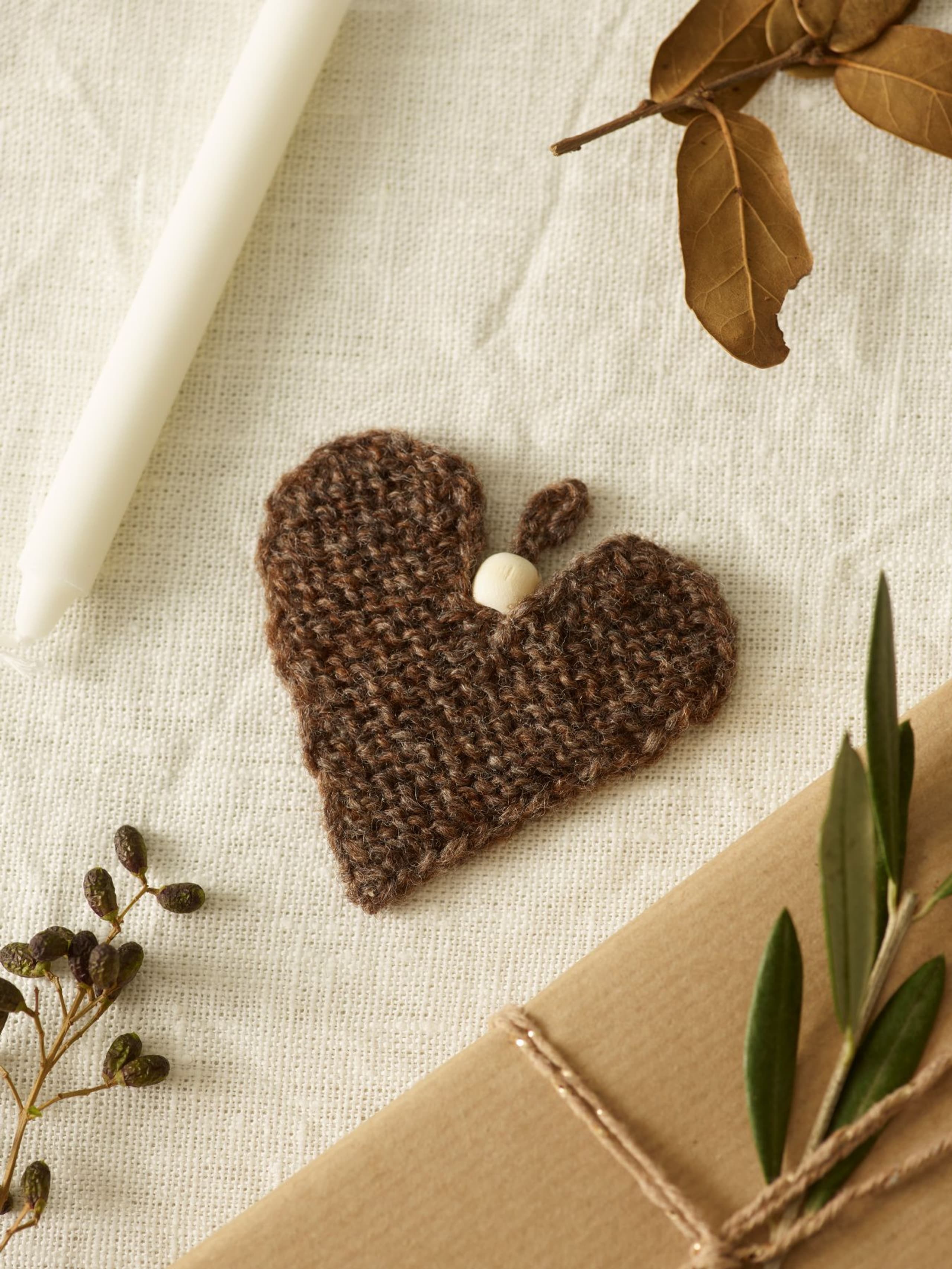 Juletrærne og hjertene kan settes sammen til en girlander eller henges f.eks. på en gave. De strikkes i rillestrikk nedenfra og opp. Vi har dekorert hjertene og juletrærne med en perle på hempen. Men som alle andre juletrær, tåler også disse massevis av pynt. Det er bare å slå seg løs med perler og paljetter! Det er et gøyalt prosjekt for barna.