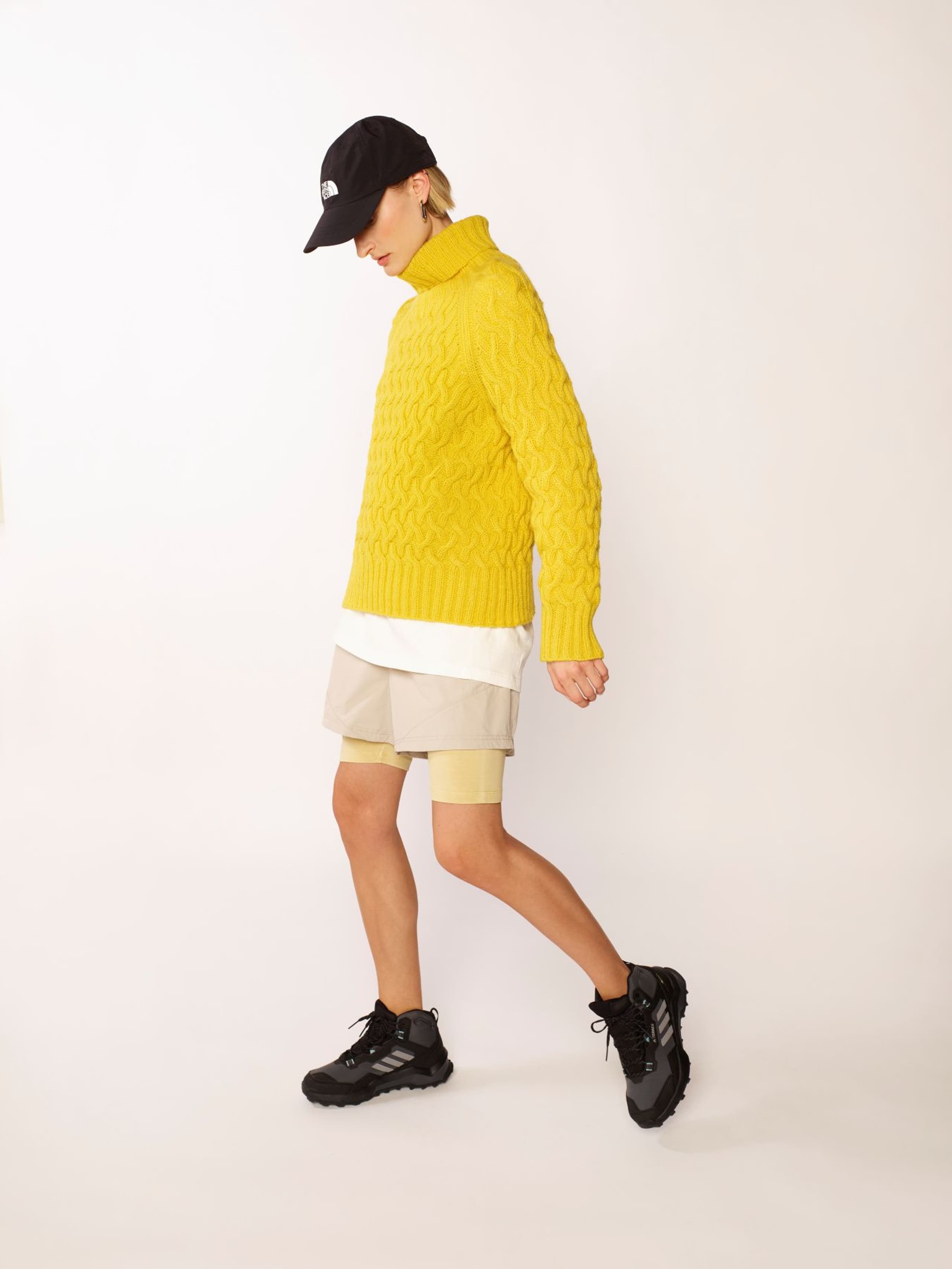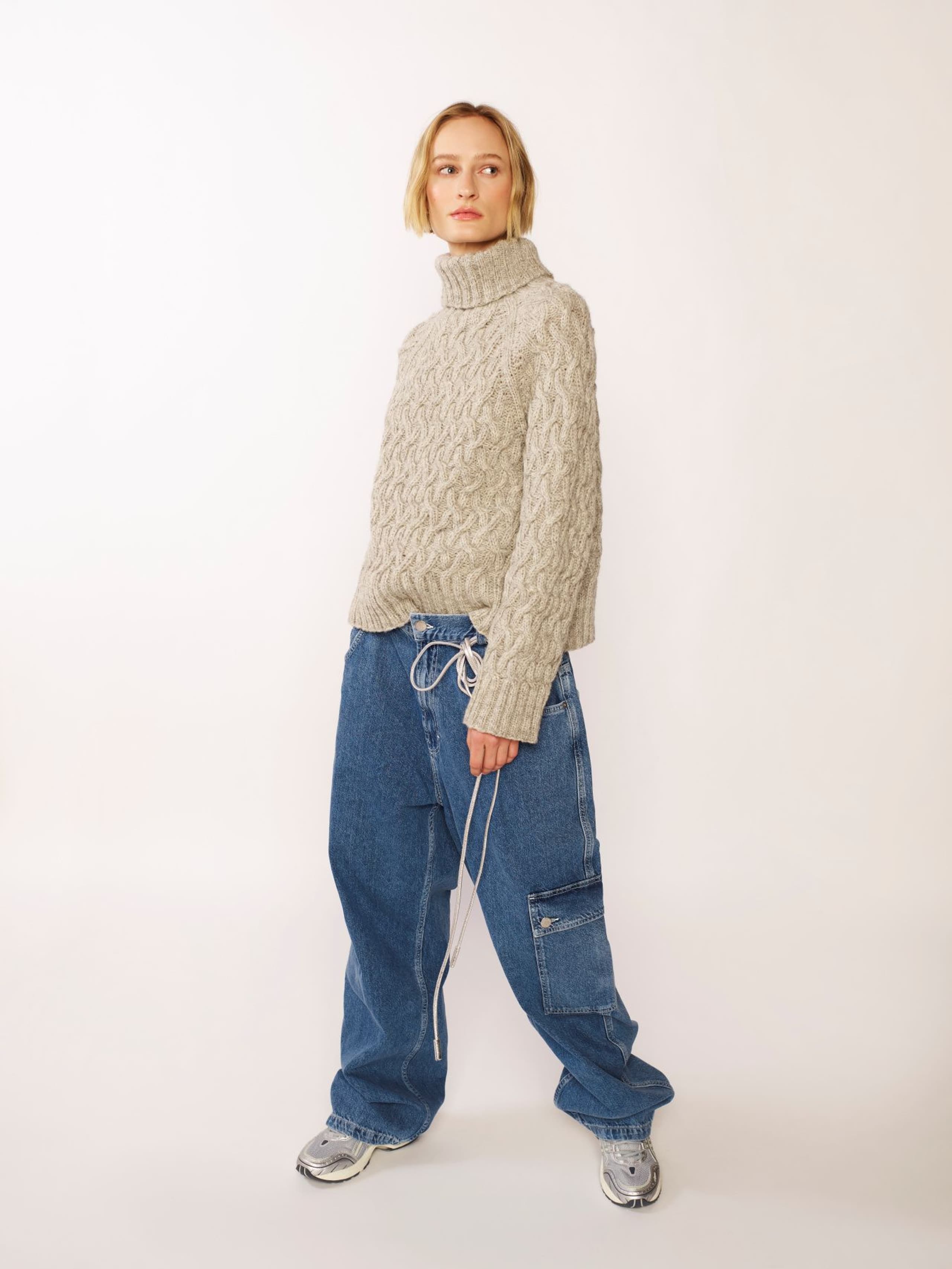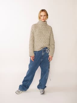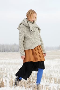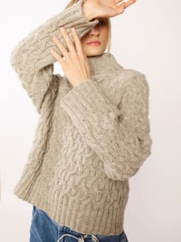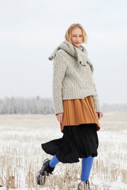 Florens flettegenser er en raglangenser i flettestruktur. Den har en klassisk passform med høy hals og ribbestrikkede kanter. Genseren strikkes ovenfra og ned. Halsringningen formes ved å strikke vendepinner, og det økes til raglan på hver side av 6 ribbestrikkede m. For å få en avslappet passform, velg en størrelse som har en brystvidde som er 10-16 cm større enn din egen.