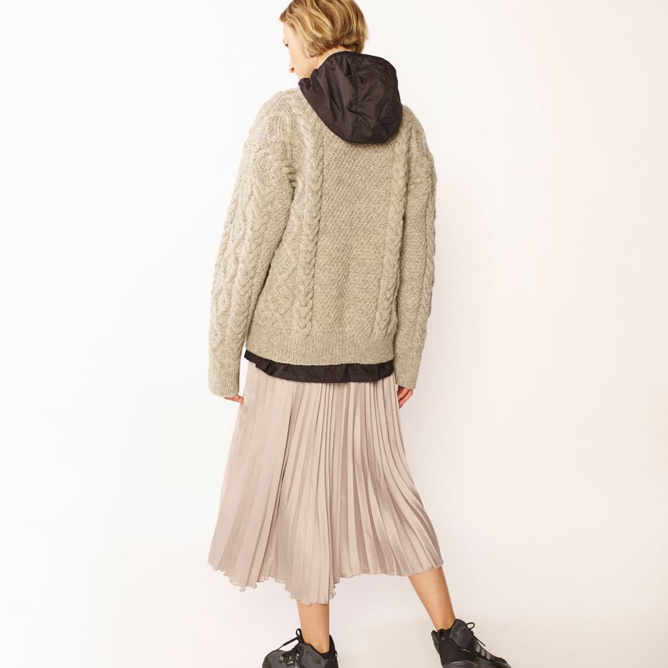 Janne flettejakke er en klassisk flettejakke med v-hals. Jakken har en rett og romslig passform med isydde ermer og ribbestrikkede kanter. Den strikkes nedenfra og opp i fem ulike fletter og strukturer. Hvis du ønsker å strikke flettejakken lenger, strikk den lenger før felling til ermehull. For å få en romslig passform, velg en størrelse som har en brystvidde som er 16-22 cm større enn din egen.