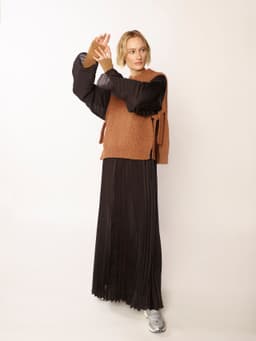 Dori vest er en kort vest i halvpatent med rund hals og knyting i sidene. Passformen er rett og figurnær. Den strikkes ovenfra og ned. Først strikkes bakstykket frem og tilbake og det økes til skrå skuldre. Deretter strikkes masker opp langs skuldrene og hvert forstykke strikkes for seg. Halskant og ermehullkanter plukkes opp til slutt og strikkes i ribbestrikk. For å få en ledig passform, velg en størrelse som har en brystvidde som er 8-12 cm større enn din egen.