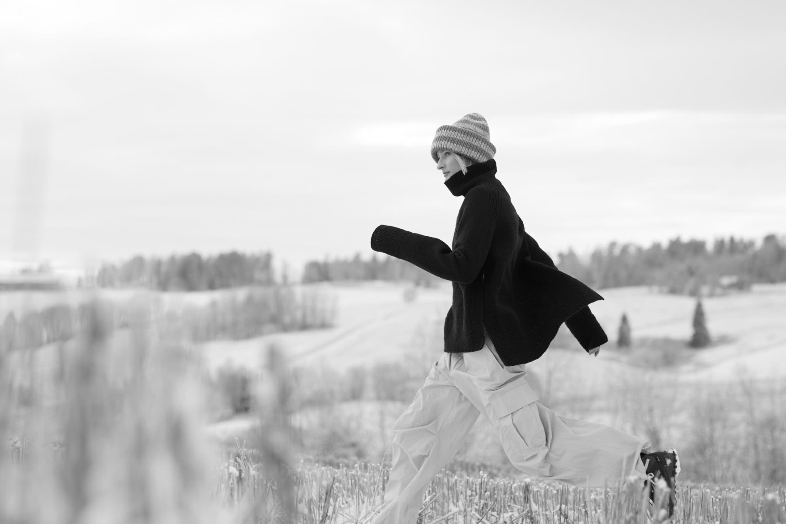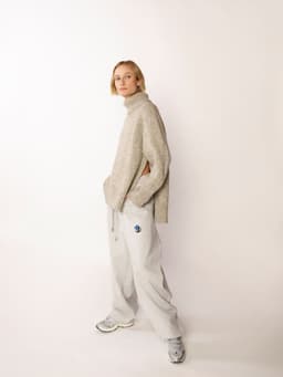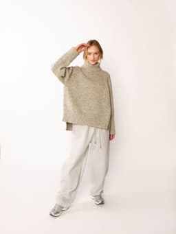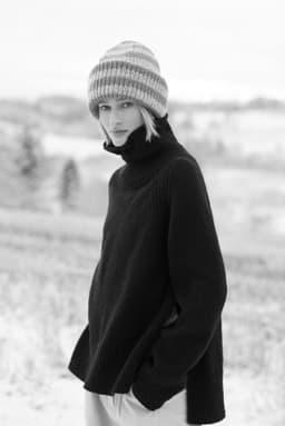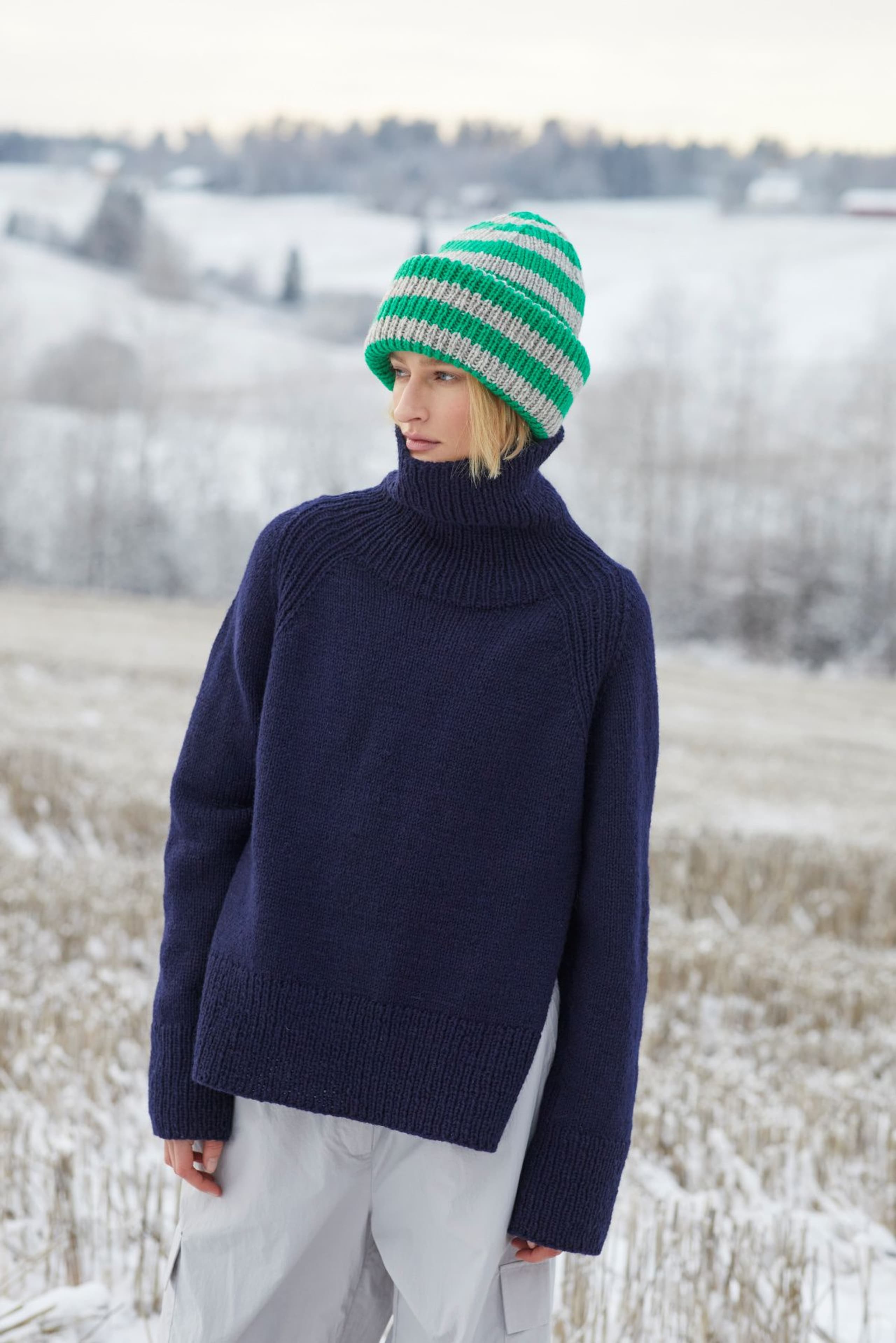 Annie raglangenser er en oversized, glattstrikket genser med høy hals og lang splitt i sidene. Forstykket overlapper bakstykket. Genseren har en bred ribbestrikket raglan som fortsetter ned lang sidene på for- og bakstykket. Genseren strikkes ovenfra og ned og bakstykket strikkes lenger enn forstykket. Halsringningen formes ved å strikke vendepinner og det økes til raglan på hver side av 11 ribbestrikkede m. For å få en oversized passform, velg en størrelse som har en brystvidde som er 20-28 cm større enn din egen.
