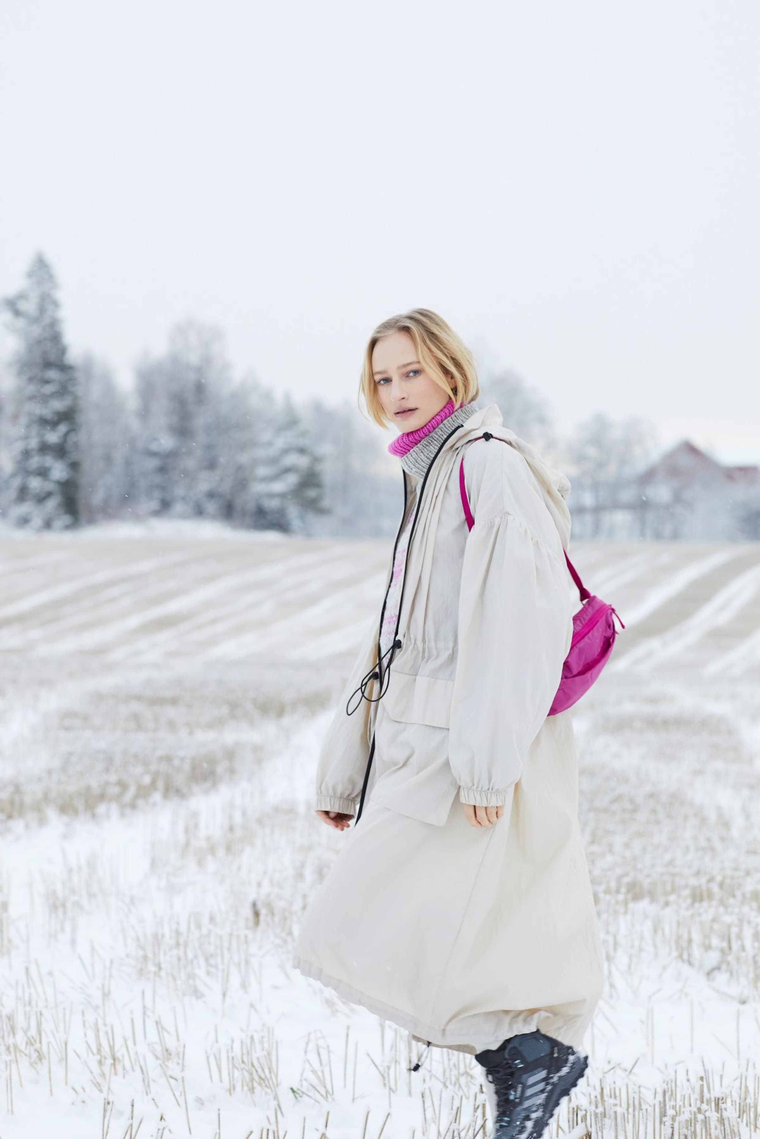 Fjære genser er mønstret i to farger. Den har en avslappet passform med raglan, rund hals og ribbestrikkede kanter. Genseren strikkes ovenfra og ned. Halsringningen formes ved å strikke vendepinner, og det økes til raglan på hver side av 3 raglan-m. For å få en oversized passform, velg en størrelse som har en brystvidde som er 20-28 cm større enn din egen. Ønsker du å skape et mer spennende uttrykk på Fjære genser, kan du strikke mønsteret med én tråd Tjukk Mohair.